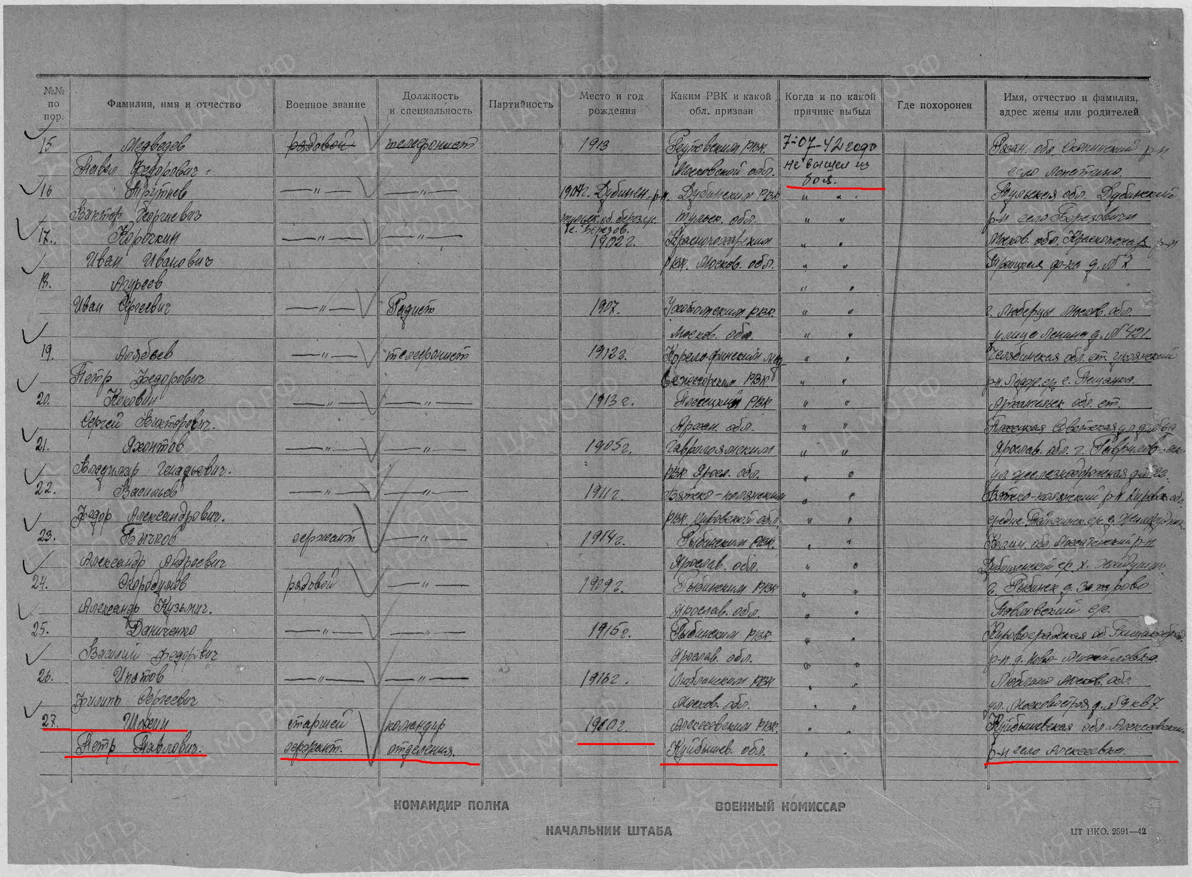 Родился в 1910 г. Призван на фронт Алексеевским РВК. Служил в звании старший сержант, в должности командир отделения 135-й стрелковой дивизии. Согласно информации из Донесния о потерях - не вышел из боя 7 июля 1942 г. (5 июля 1942 г. дивизия была окружена в районе г. Белый Калининской (Тверской) области, в результате чего при отступлении и попытке прорыва была почти полностью уничтожена).