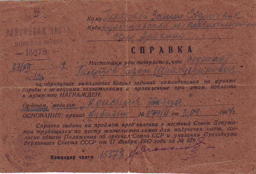 Документы и фото из семейного архива предоставили: племянник - Рифат Хасанович Гилязов и внук ветерана - Гильманов Азат Эрежебович, с. Алькино Похвистневского района Самарской области