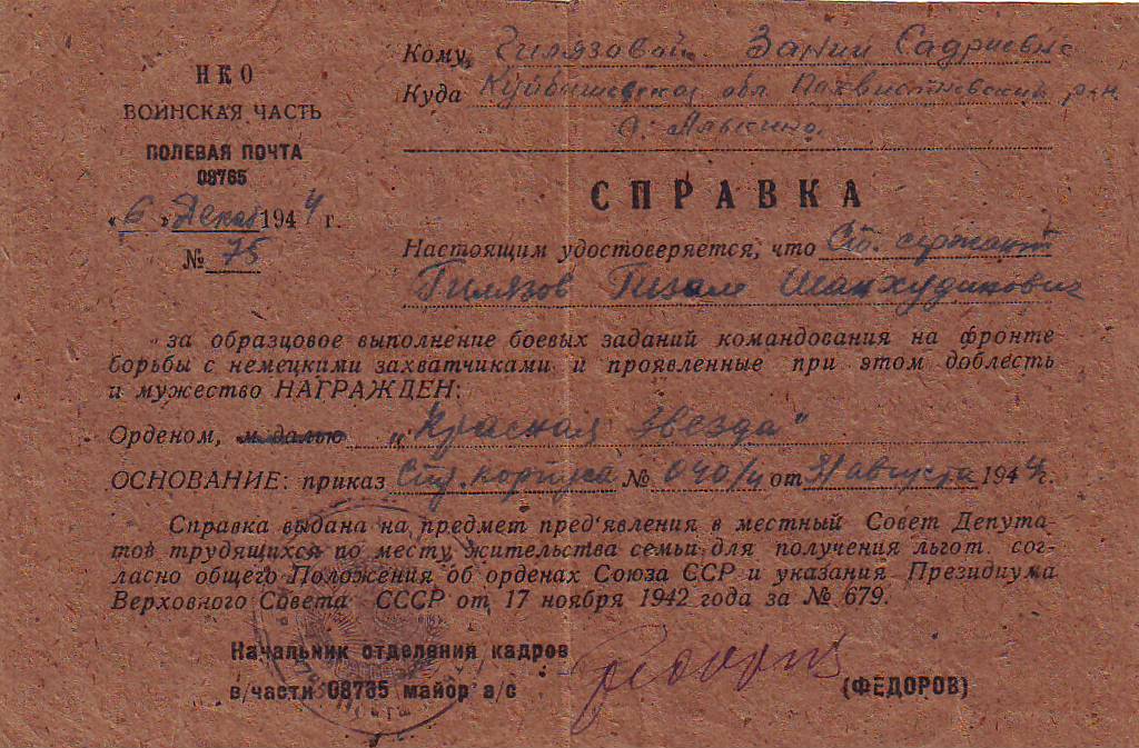 Гизам Шайхутдинович Гилязов родился в 1923 году в селе Алькино Похвистневского района Самарской области, в крестьянской семье. Ушел на фронт 6 декабря 1941 года и воевал до окончания Великой Отечественной войны. Его боевой путь протянулся от Москвы до Берлина. Принимал участие в форсировании Днепра. Был связистом. Войну окончил в звании старшего сержанта. За образцовое выполнение заданий командования на фронтах войны Г.Ш. Гилязов был награжден пятью правительственными наградами, в том числе двумя орденами Красной Звезды, медалями «За отвагу», «За оборону Москвы», «За взятие Кенигсберга» и многими юбилейными медалями.