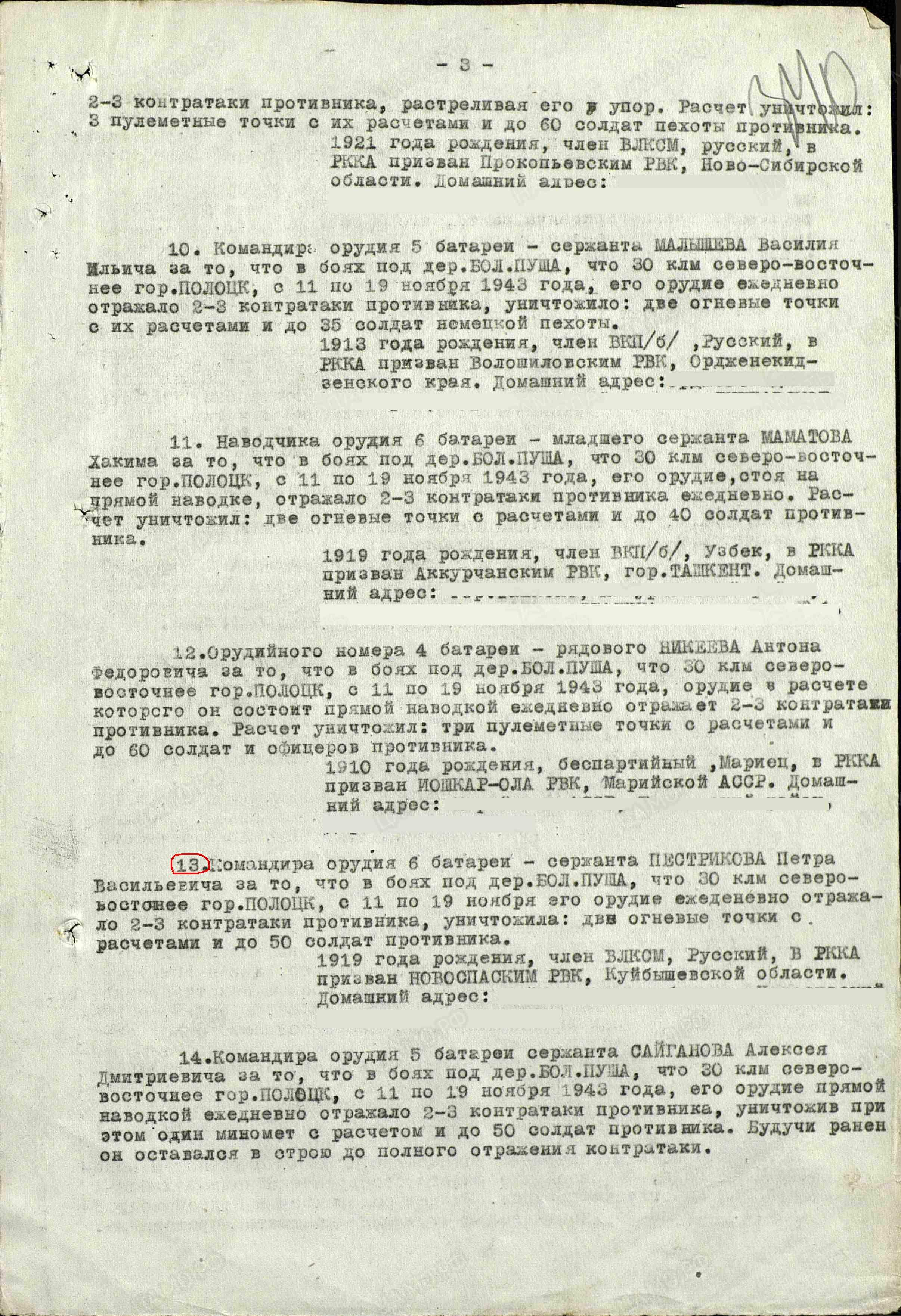 Наградить медалью «За отвагу» командира орудия 6-й батареи, сержанта Пестрикова Петра Васильевича за то, что в боях под д. Большая Пуша в 30 км северо-восточнее г. Полоцк, с 11 по 19 ноября его орудие ежедневно отражало 2-3 контратаки противника и уничтожило две огневые точки с расчетами и до 50 солдат противника (наградной лист от 24.11.1943 г.).