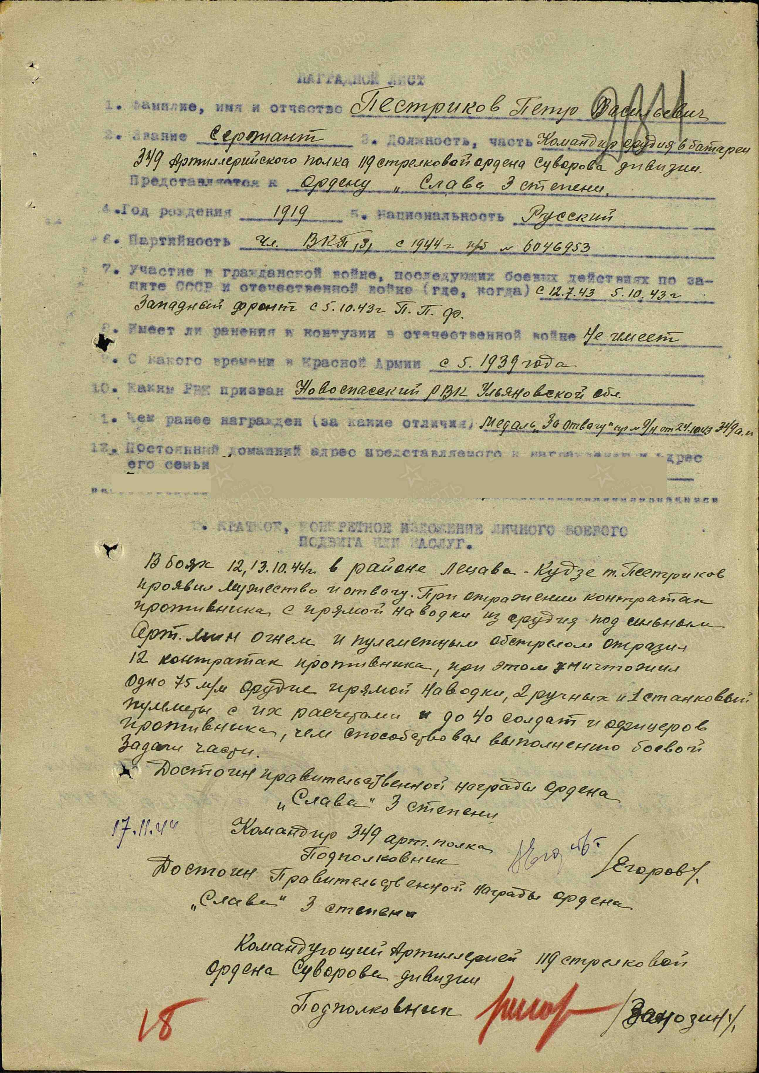 Сержант Пестриков П.В. в боях с немецкими захватчиками проявил образцы мужества и отваги. В боях 21 декабря 1944 г. в районе Лачи Латвийской ССР при отражении ряда контратак крупных сил пехоты и танков противника за 4 дня своим орудием прямой наводкой уничтожил 2 станковых пулемета и до 100 солдат и офицеров противника. Сержант Пестриков как ветеран полка, за доблесть и мужество, проявленные в боях, достоин правительственной награды – ордена Красной Звезды (наградной лист от 23.04.1945 г.).