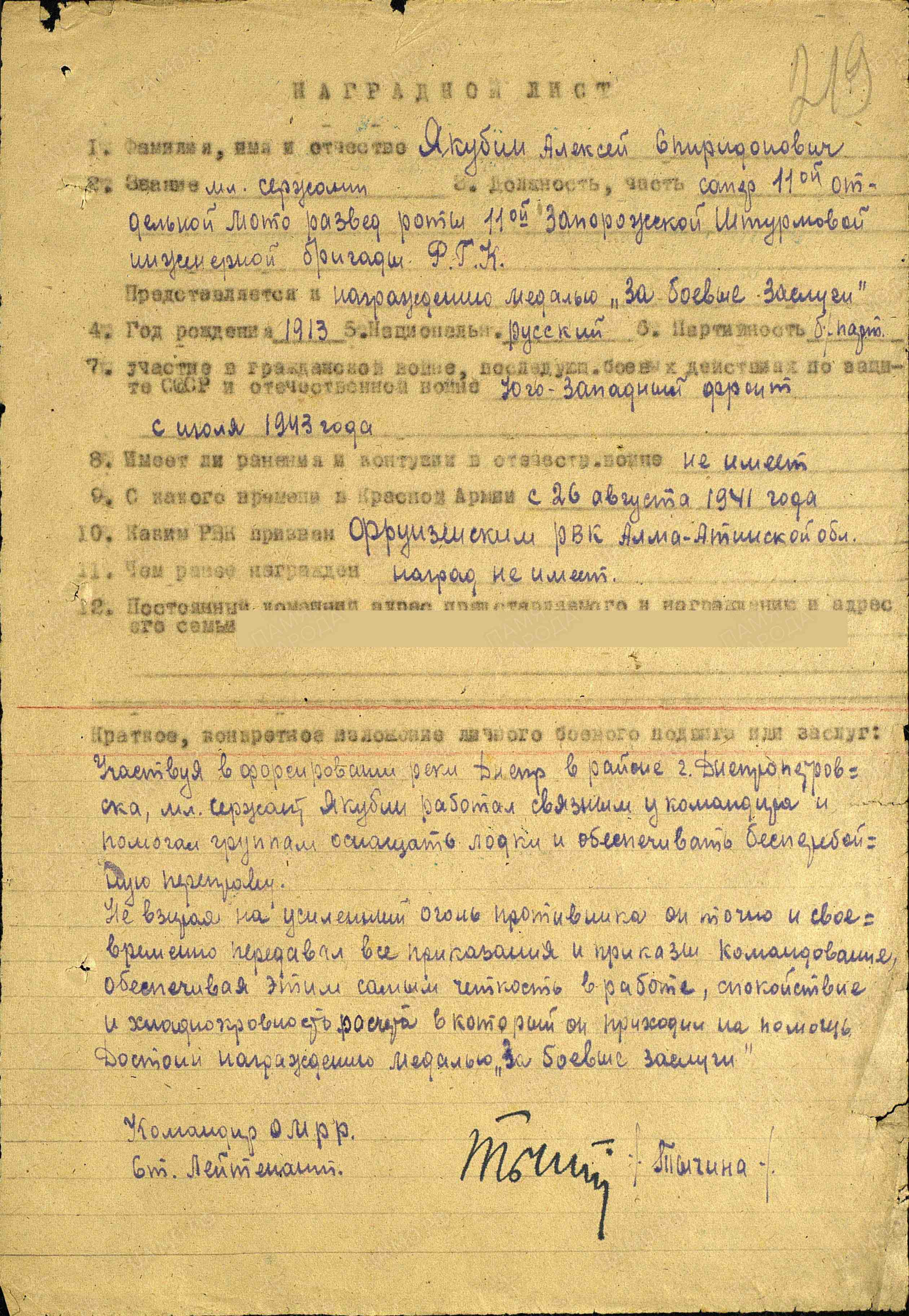 Участвуя в форсировании реки Днепр в районе г. Днепропетровска, младший сержант Якубин работал связным у командира и помогал группам оснащать лодки и обеспечивать бесперебойную переправу. Невзирая на усиленный огонь противника, он точно и своевременно передавал все приказания и приказы командования, обеспечивая этим четкость в работе, спокойствие и хладнокровность расчета, в который он приходил на помощь. Достоин награждения медалью «За боевые заслуги» (наградной лист от 1.11.1943 г.).