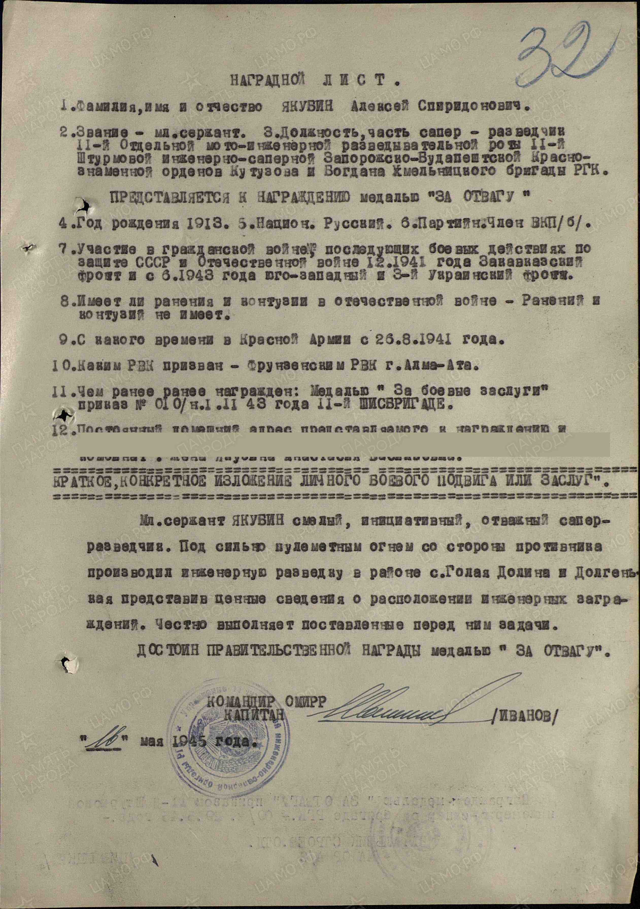 Младший сержант Якубин смелый, инициативный, отважный сапер-разведчик. Под сильным пулеметным огнем со стороны противника производил инженерную разведку в районе сел Голая Долина и Долгенькая, представив ценные сведения о расположении инженерных заграждений. Честно выполняет поставленные перед ним задачи. Достоин правительственной награды – медали «За отвагу» (наградной лист от 16.05.1945 г.).