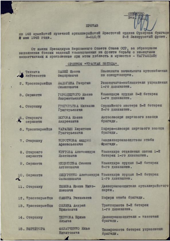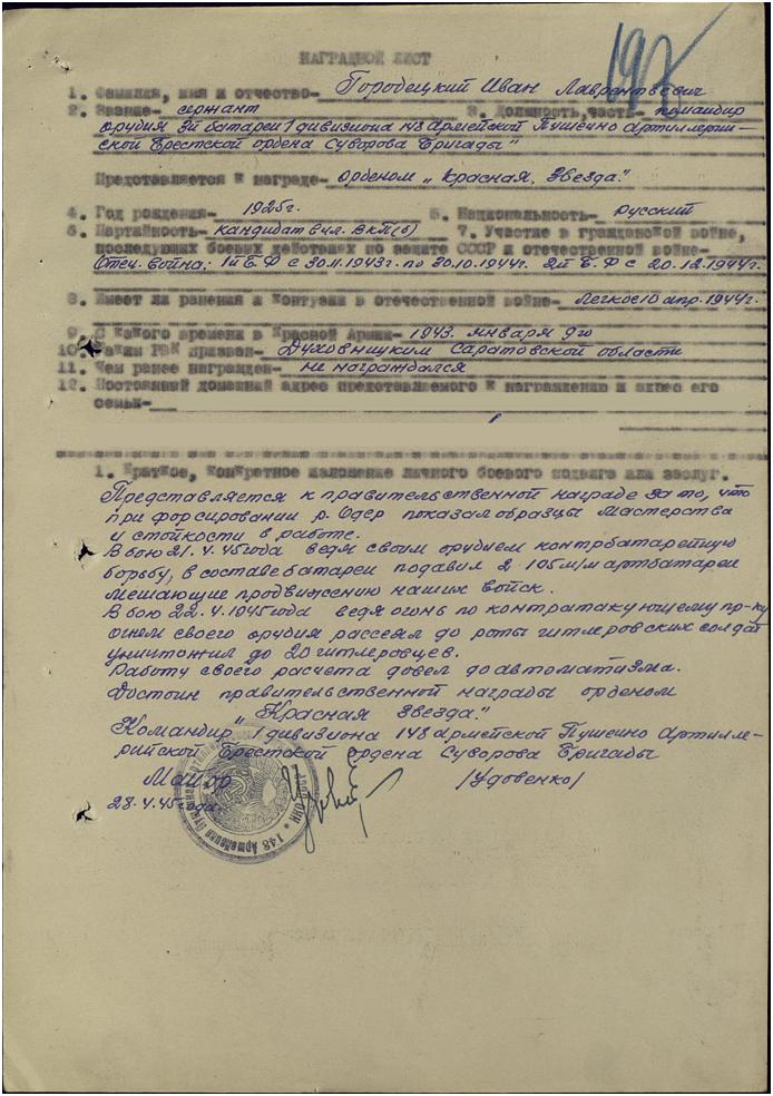 «Представляется к правительственной награде за то, что при форсировании р. Одер показал образцы мастерства и стойкости в работе. В бою 21 апреля 1945 г., ведя своим орудием контрбатарейную борьбу, в составе батареи подавил две 105 мм артбатареи, мешающие продвижению наших войск. В бою 22 апреля 1945 г., ведя огонь по контратакующему противнику, огнем своего орудия рассеял до роты гитлеровских солдат, уничтожил до 20 гитлеровцев. Работу своего расчета довел до автоматизма. Достоин правительственной награды – ордена Красной Звезды (наградной лист от 28.04.1945 г.)».