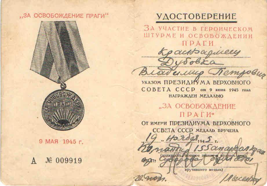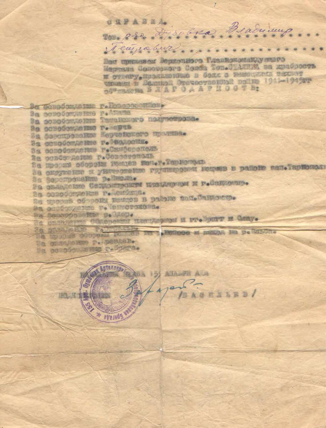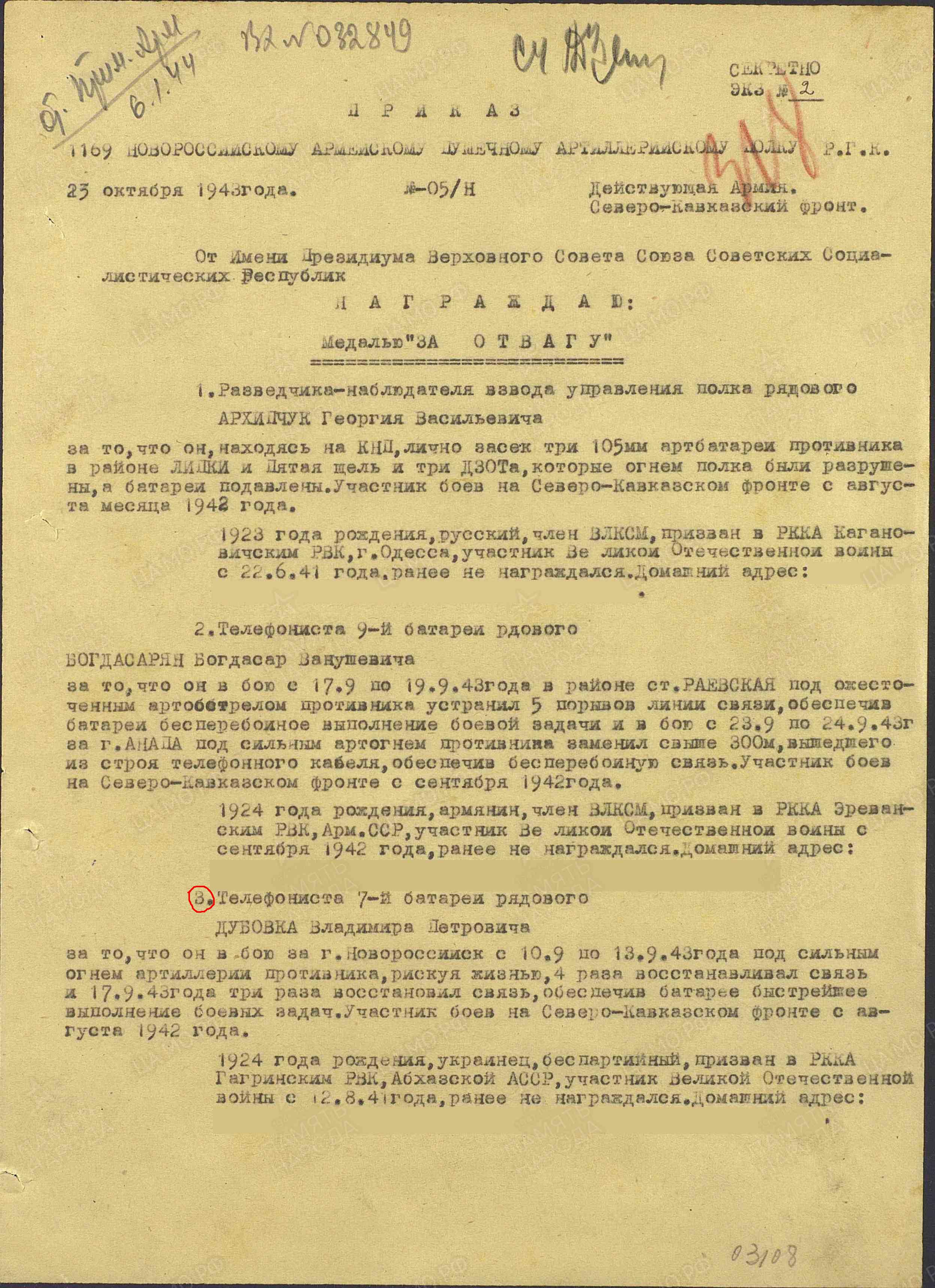 Наградить медалью «За отвагу» телефониста 7-й батареи рядового Дубовка Владимира Петровича за то, что он в бою за г. Новороссийск с 10 по 13 сентября 1943 г. под сильным огнем артиллерии противника, рискуя жизнью, 4 раза восстанавливал связь и 17 сентября 1943 г. три раза восстановил связь, обеспечив батарее быстрейшее выполнение боевых задач. Участник боев на Северо-Кавказском фронте с августа 1942 г. (наградной лист от 20.09.1943 г.).