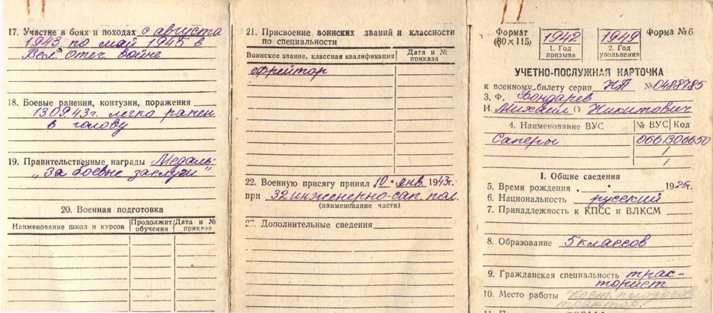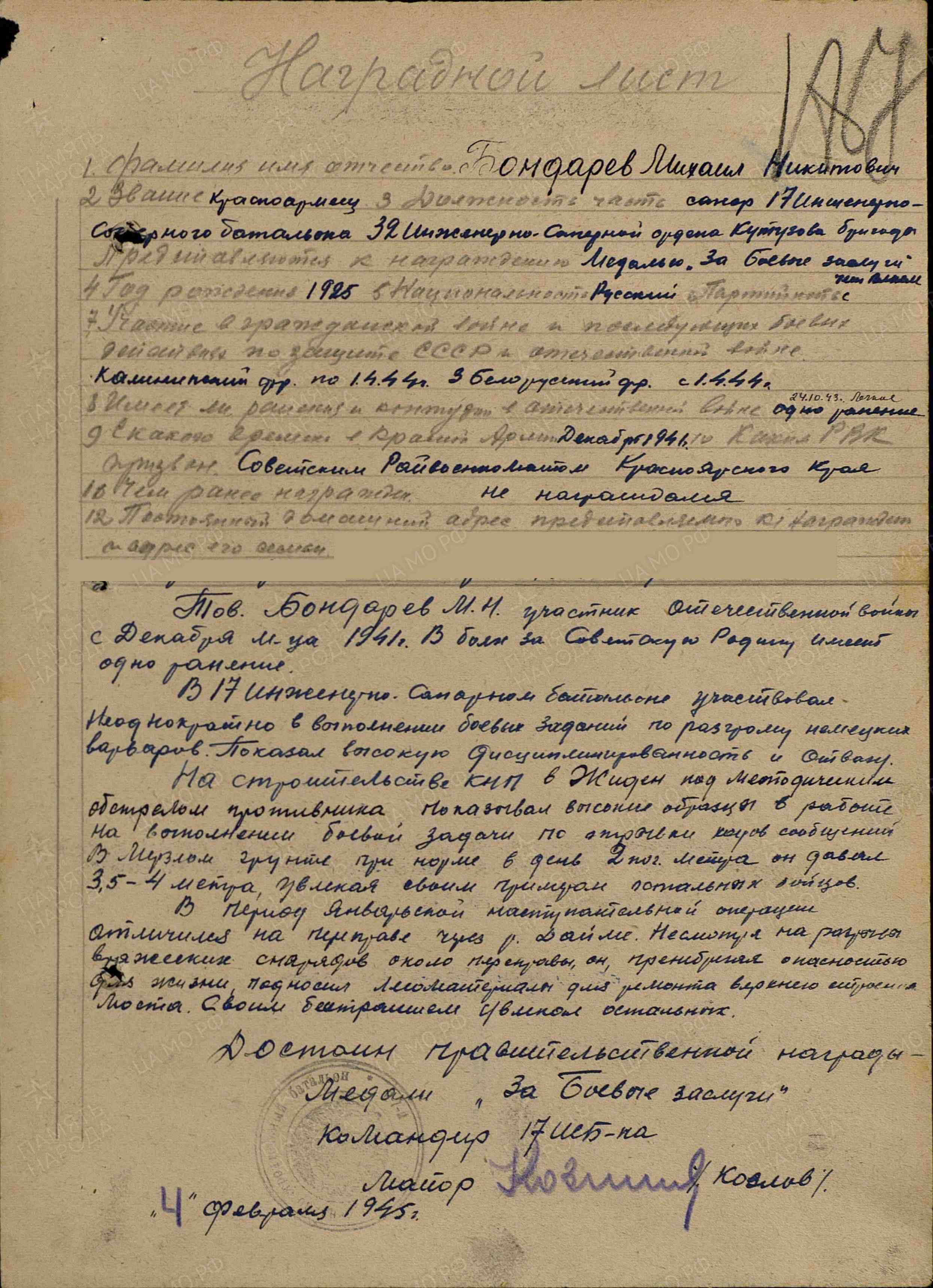 Тов. Бондарев М.Н. – участник Отечественной войны с декабря 1941 г. В боях за Советскую Родину имеет одно ранение. В 17-м инженерно-саперном батальоне неоднократно участвовал в выполнении боевых заданий по разгрому немецких варваров. Показал высокую дисциплинированность и отвагу. На строительстве командного наблюдательного пункта в Жиден (ныне п. Мирный, Калининградская область), под методическим обстрелом противника показывал высокие образцы в работе. На выполнении боевой задачи по отрывке ходов сообщений в мерзлом грунте при норме в день 2 метра он давал 3,5-4 метра, увлекая своим примером остальных бойцов. В период январской наступательной операции отличился на переправе через р. Дайме. Несмотря на разрывы вражеских снарядов около переправы, он, пренебрегая опасностью для жизни, подносил лесоматериалы для ремонта верхнего строения моста. Своим бесстрашием увлекал остальных. Достоин правительственной награды – медали «За боевые заслуги» (наградной лист от 4.02.1945 г.).