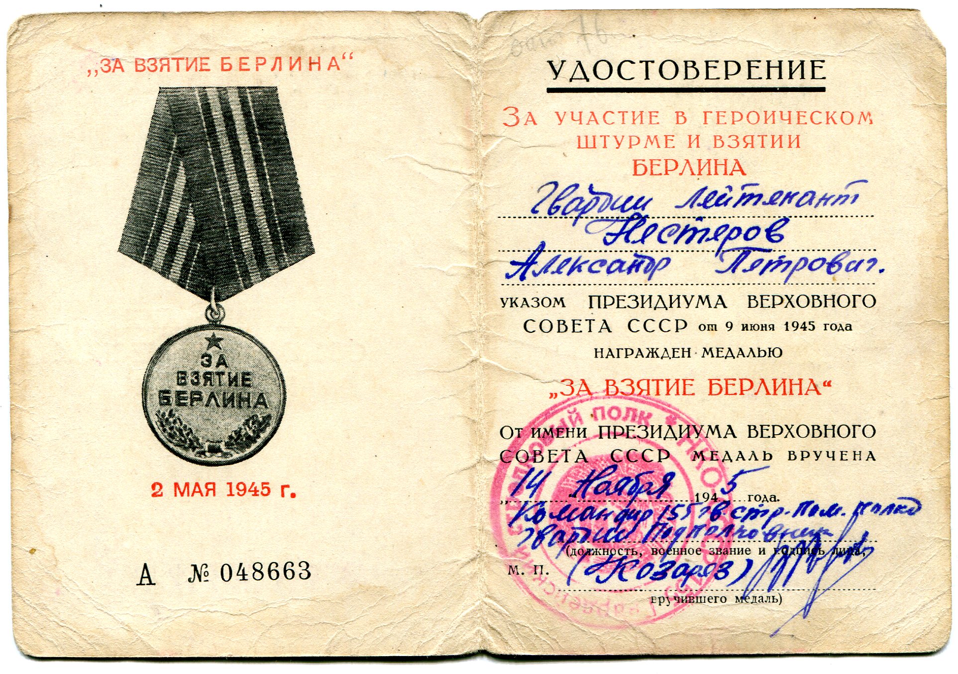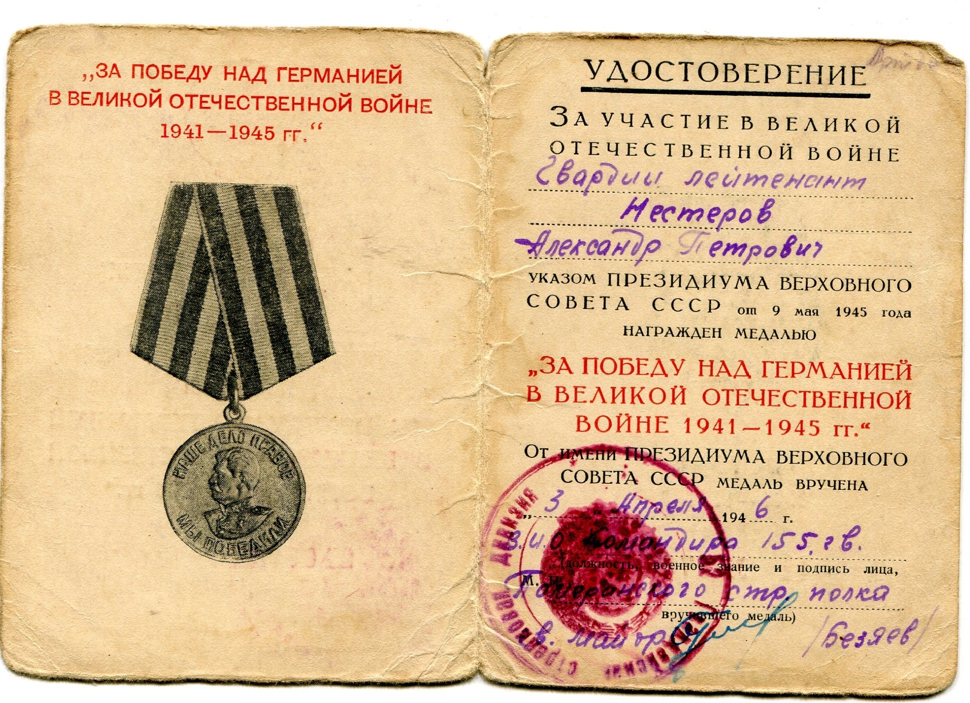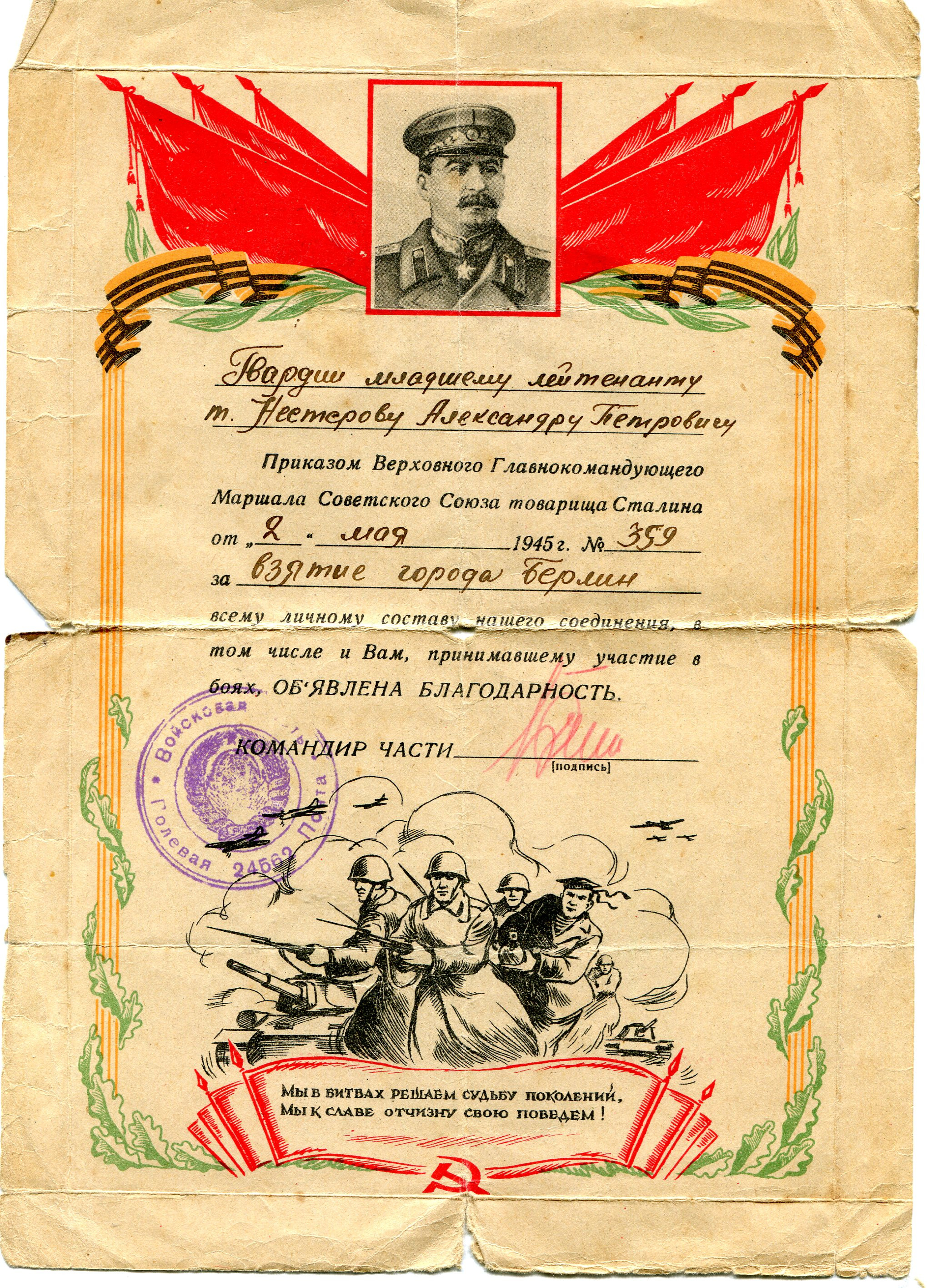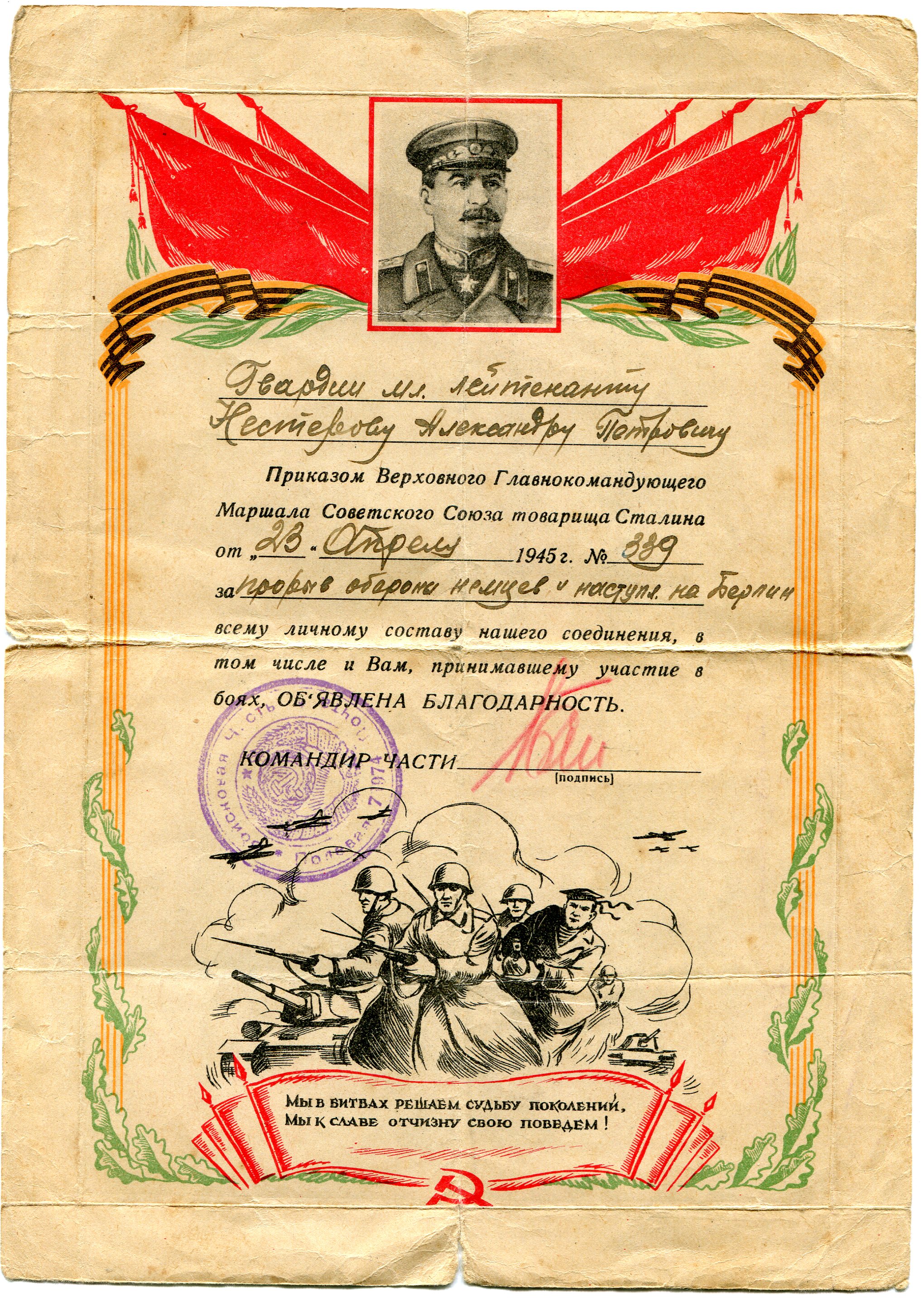 Во время войны проявил себя смелым и отважным офицером, о чем свидетельствуют наградные листы, которые его дочь Краснова Л.А. нашла на сайте «Мемориал»: «В бою 2 марта 1945 г. при форсировании реки Одер в районе населенного пункта Лунов (Германия) проявил мужество и отвагу. Находясь в боевом порядке пехоты т. Нестеров умелым и дерзким руководством по организации огня в условиях интенсивного противодействия противника в бою при форсировании реки Одер взвод т. Нестерова уничтожил шесть вражеских пулеметов с расчетами и пять дзотов. Взвод т. Нестерова первым из батареи форсировал реку Одер».