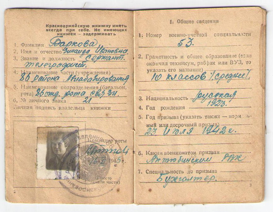 Дата рождения: 2 сентября 1923 г. Место рождения: Казахстан, г. Актюбинск. Призвана в армию 23 июля 1942 года Актюбинским РВК. Приняла присягу 11 октября 1942 года. Служила на Дальнем Востоке телеграфистом в 86 отделении роты связи. Принимала участие в боях с японскими агрессорами на территории Манчжурии (Китай) на Втором Дальневосточном фронте. Демобилизована 20 ноября 1945 года.