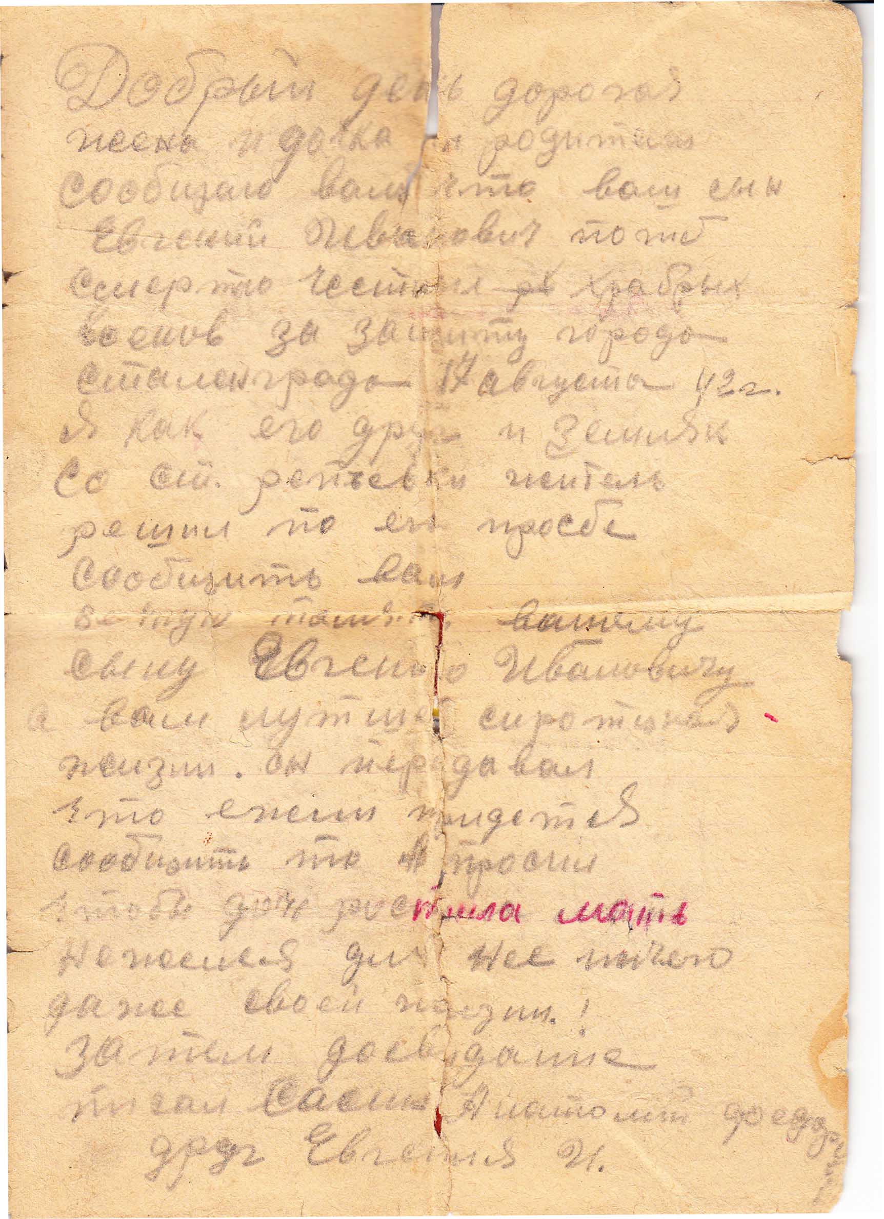 В семейном архиве бережно хранится письмо от Сасина Анатолия Федоровича, фронтового друга Пырина Е.И.: «Добрый день дорогая жена и дочка, и родители. Сообщаю вам, что ваш сын Евгений Иванович погиб смертью честных, храбрых воинов за защиту города Сталинграда 17 августа 42 года. Я, как его друг и земляк со станции Репьёвки житель, решил по его просьбе сообщить вам. Вечную память вашему сыну Евгению Ивановичу, а вам лучшей сиротской жизни. Он передавал, что ежели придется сообщить, то просил, чтобы мать растила дочь, не жалея для нее ничего даже своей жизни! Затем до свидания. Писал Сасин Анатолий Федорович, друг Евгения И.»