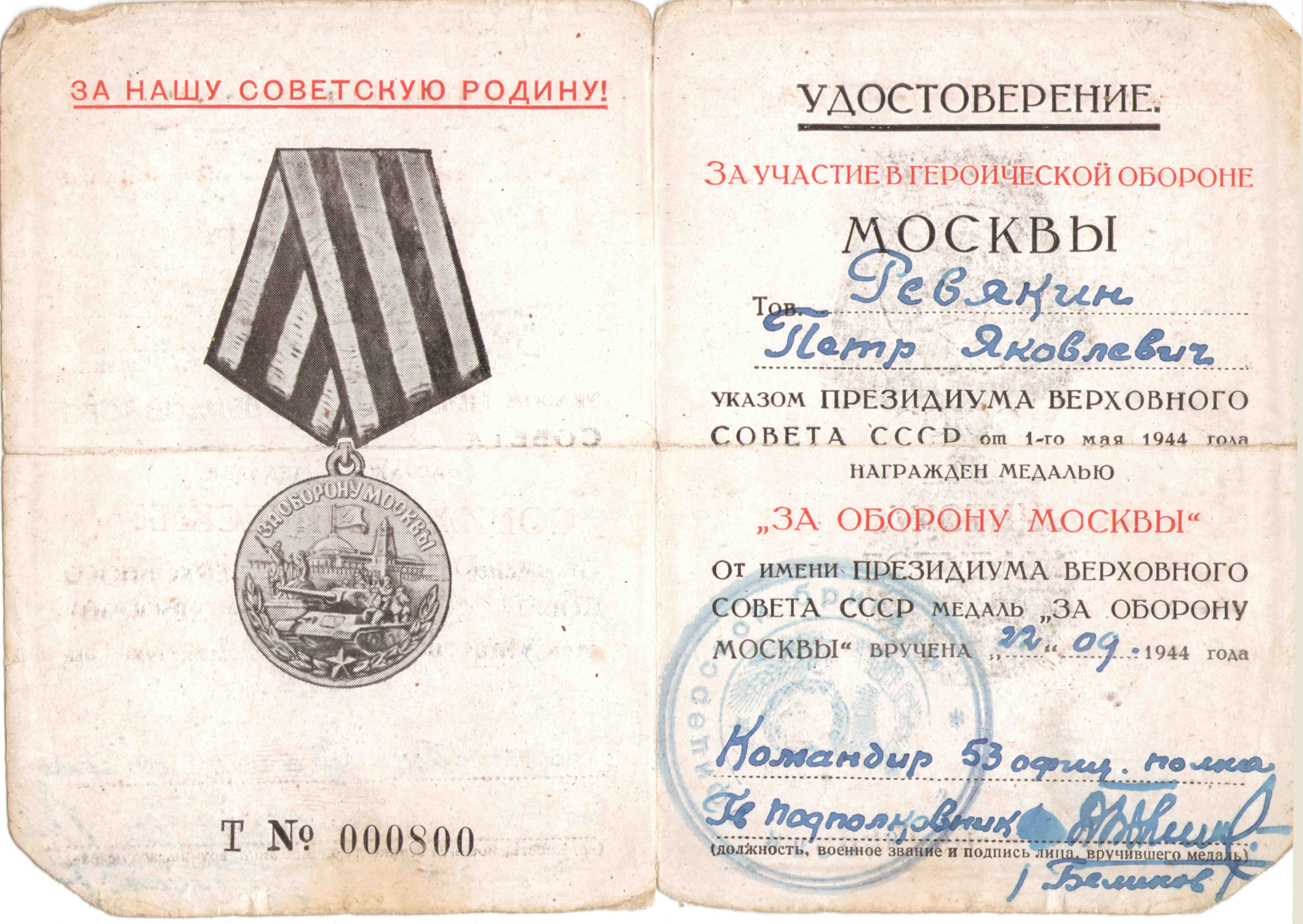 Медаль «За оборону Москвы», 1944 г.