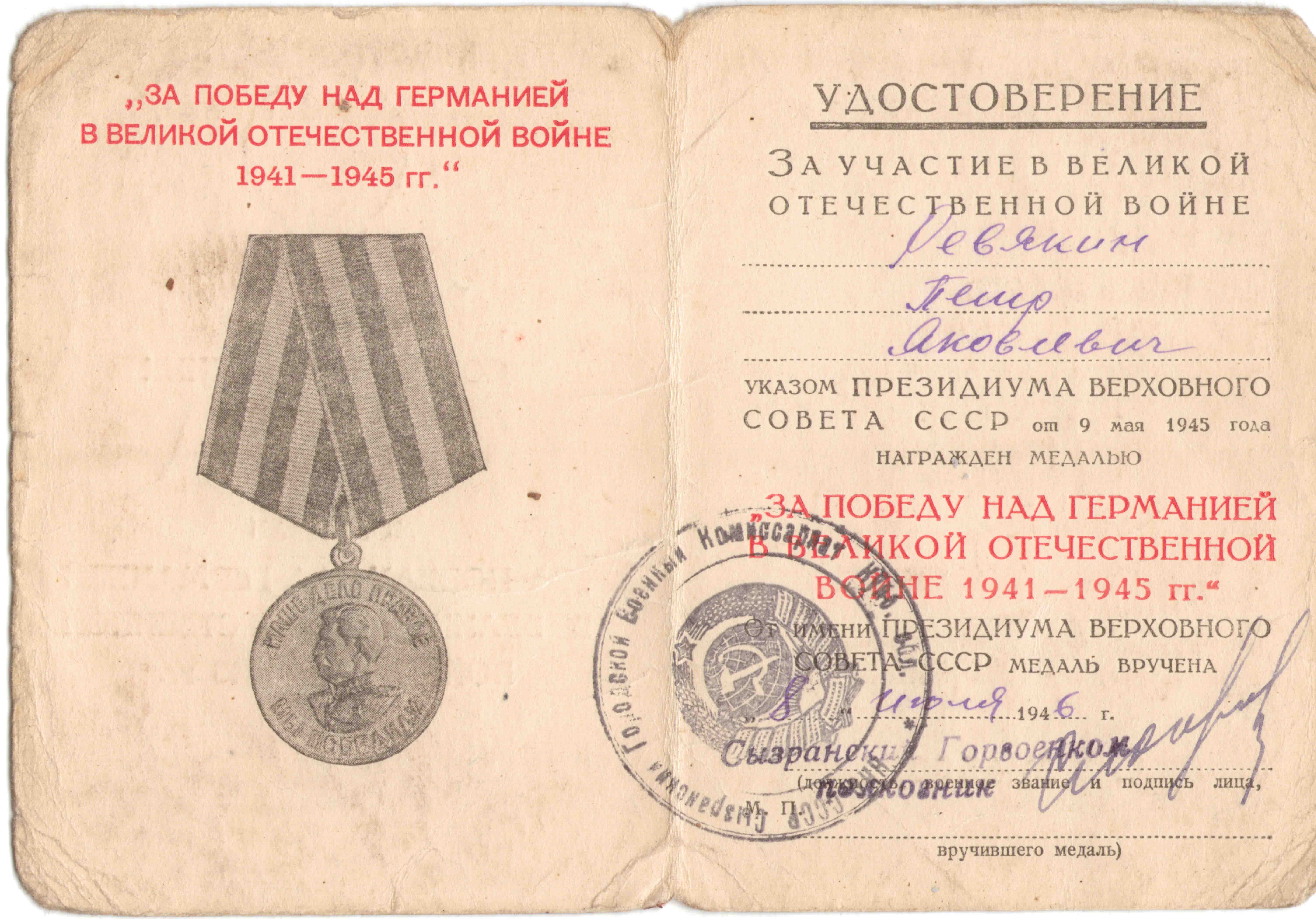 Медаль «За победу над Германией в Великой Отечественной войне 1941-1945 гг.»