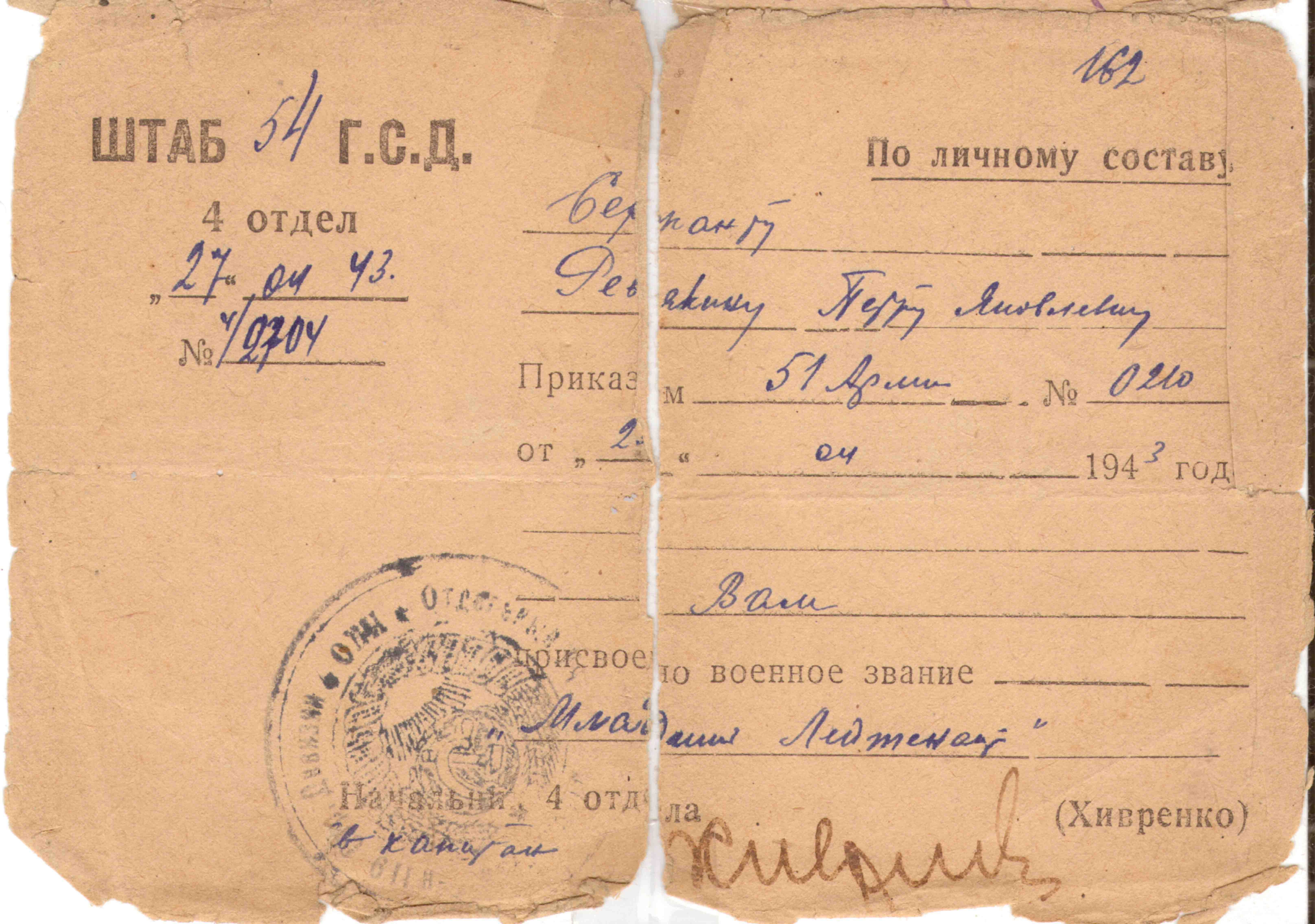 Медаль «За отвагу», 20.03.1943 г.