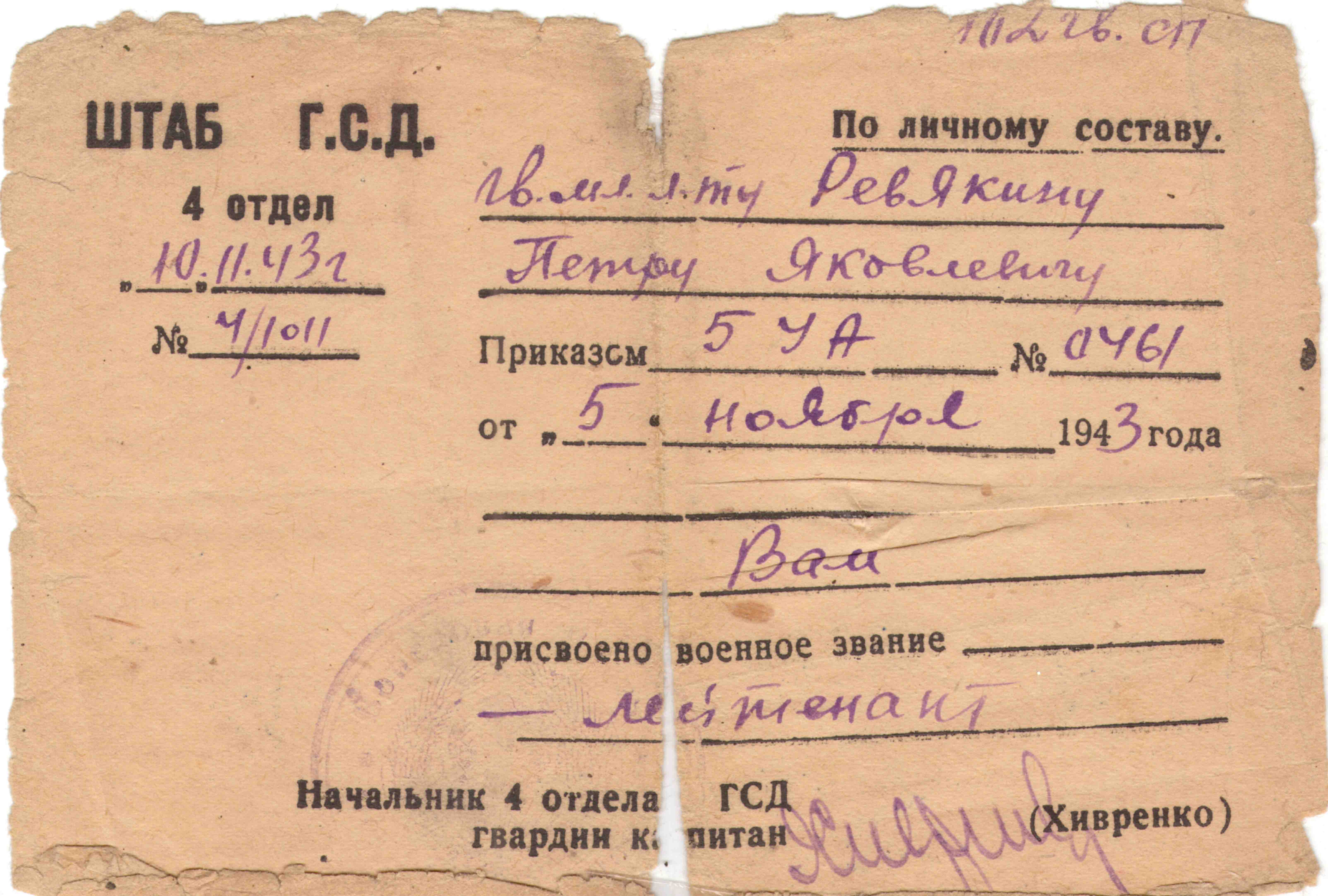 Рассказывает дочь ветерана: «Служил во время войны в пехоте, был ранен тяжело, что послужило поводом для письма сослуживца домой о его смерти. Но, к счастью, письмо упало в щель у порога, и мама нашла его уже после извещения из госпиталя о ранении. Пулю извлечь врачи не смогли, и он носил ее в себе до самой смерти. О войне он не рассказывал, я помню только одно: отец всю жизнь искал «сына полка», но, к сожалению, так и не нашел». Умер 16 ноября 1974 года в г. Сызрани Куйбышевской области.