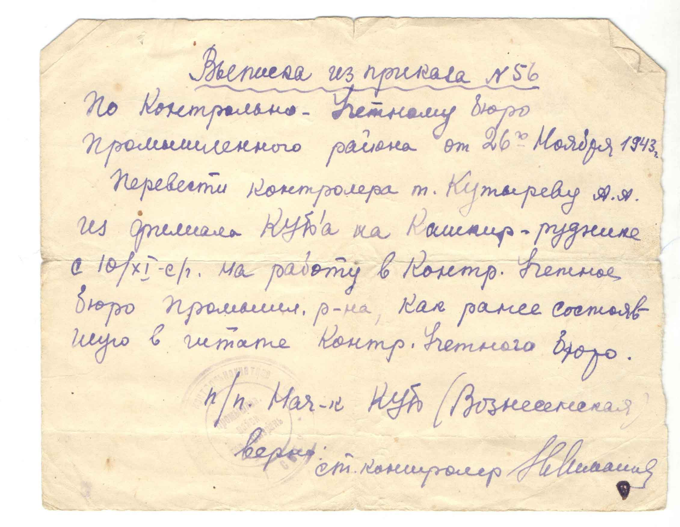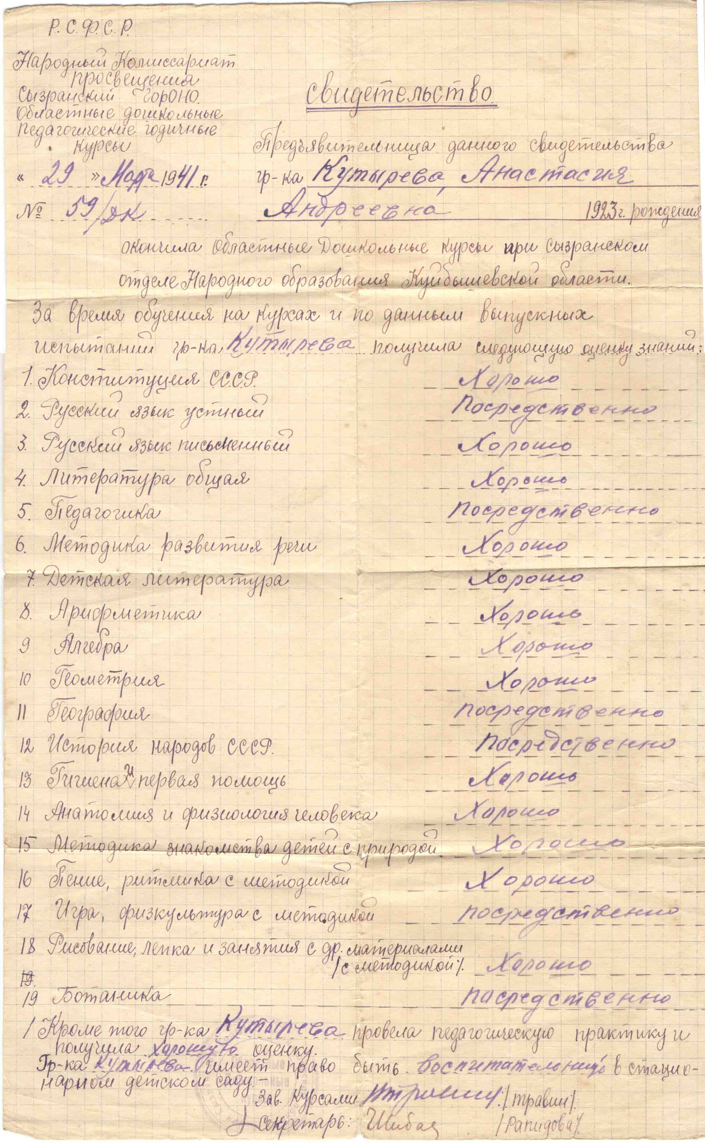 Романова (в девичестве Кутырева) Анастасия Андреевна родилась в 1923 г. в с. Кравково Николаевского района Ульяновской области. Анастасия Андреевна Романова 29 марта 1941 г. закончила областные дошкольные педагогические годичные курсы по специальности воспитатель в детском саду. Во время войны закончила курсы снайперов, но на фронт призвана не была. В тылу, во время войны работала старшим контролером. Помогала разгружать поезда с ранеными, которые приходили, в основном, ночью, а утром шла на работу.