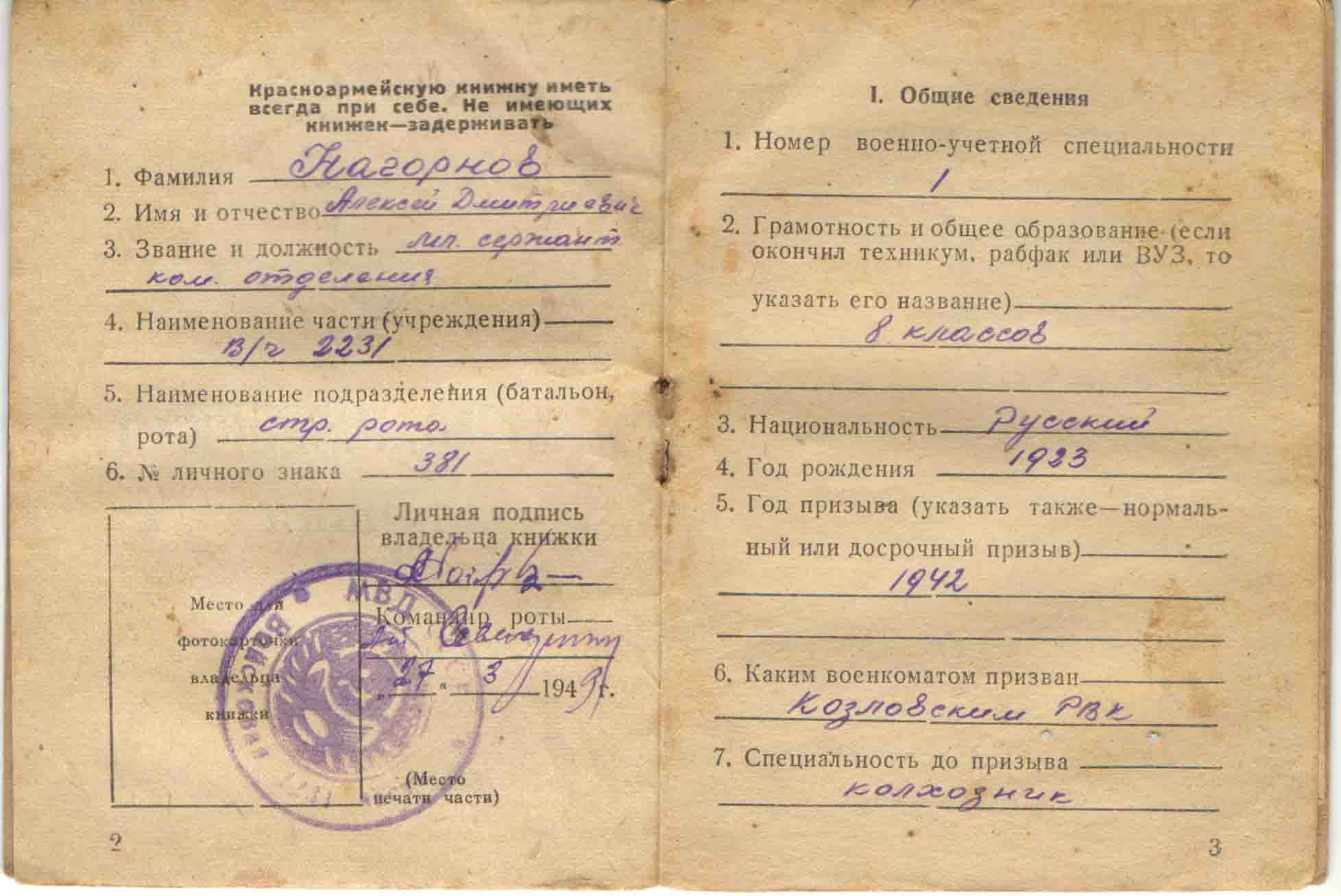 Алексей Нагорнов родился 18.08.1923 года в с. Тарханово Атяшевского района Мордовской АССР, закончил 8 классов, а 3.03.1942 г. был призван на военную службу Козловским Райвоенкоматом Мордовской АССР.
