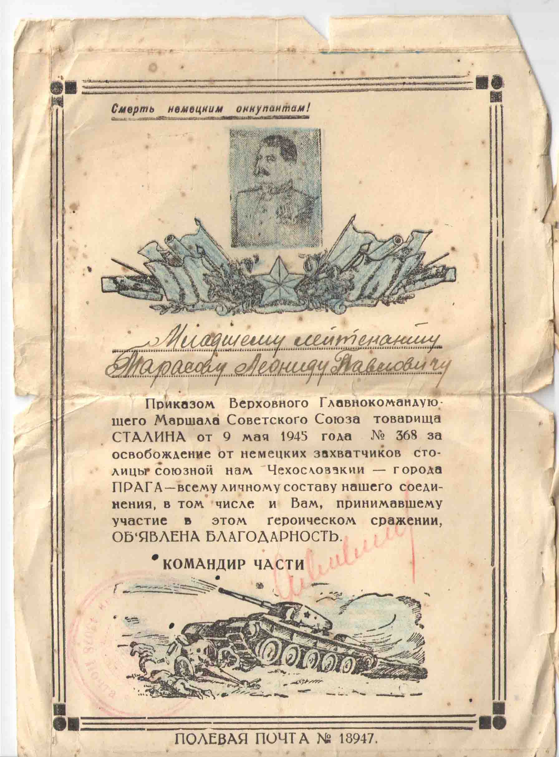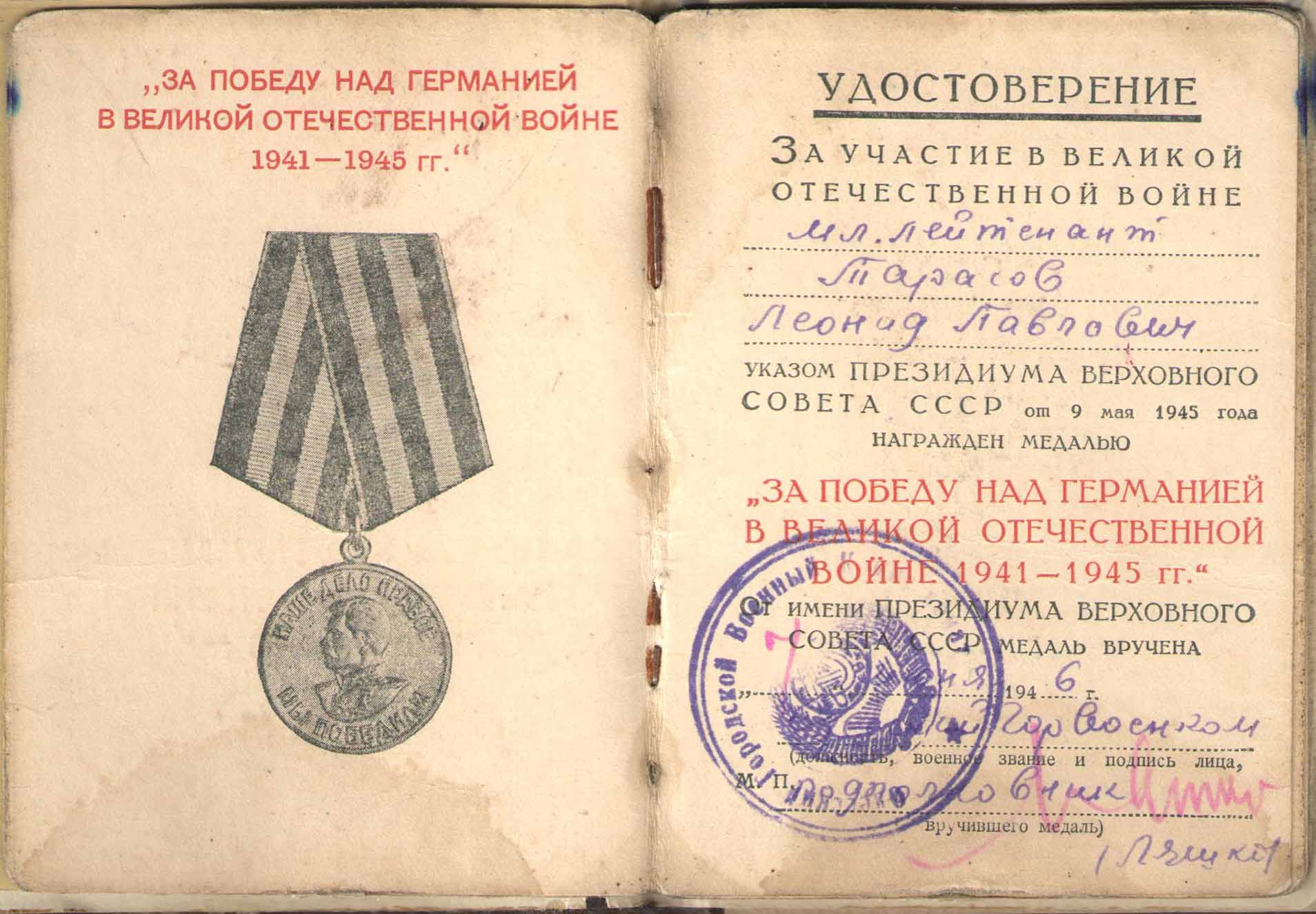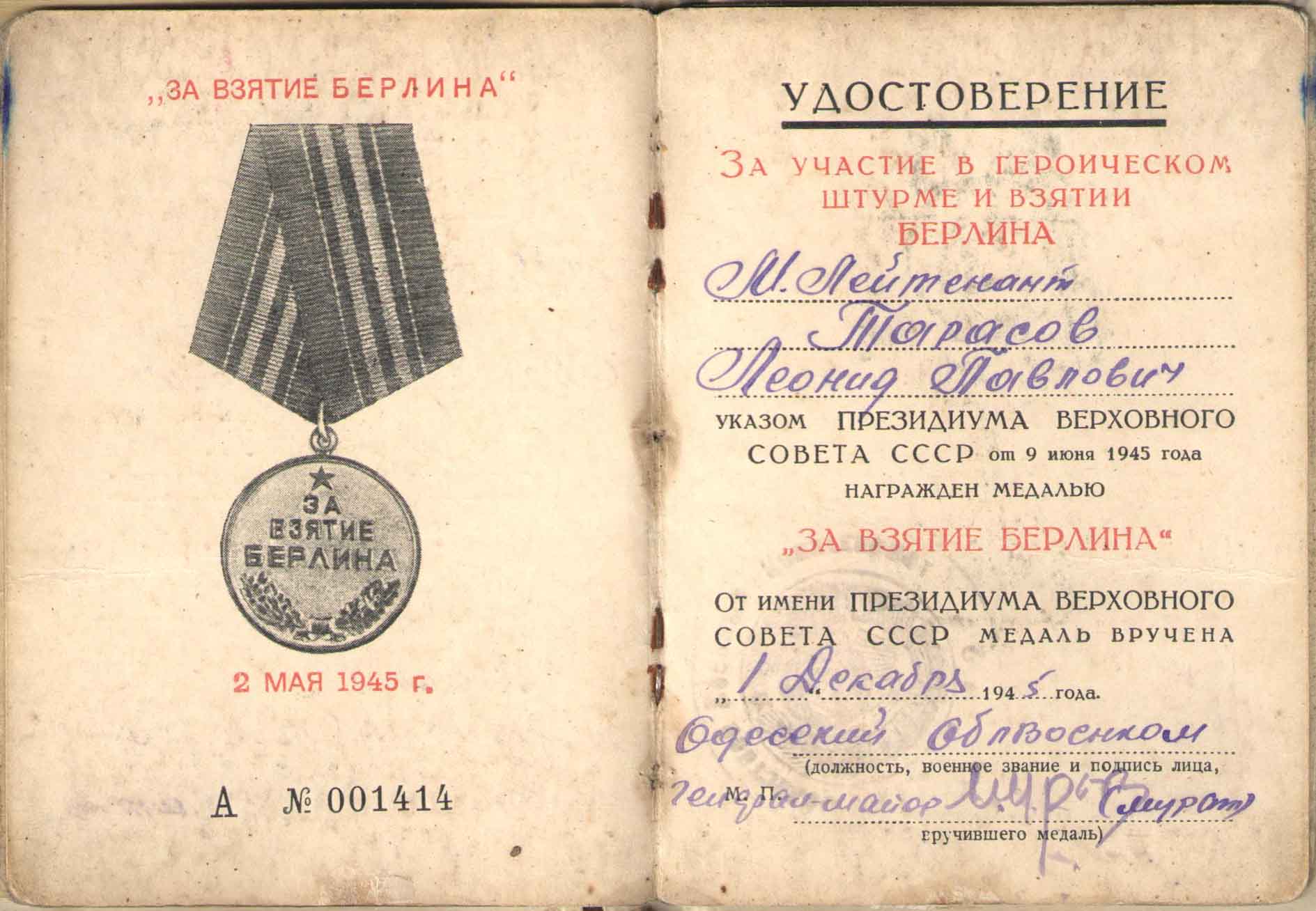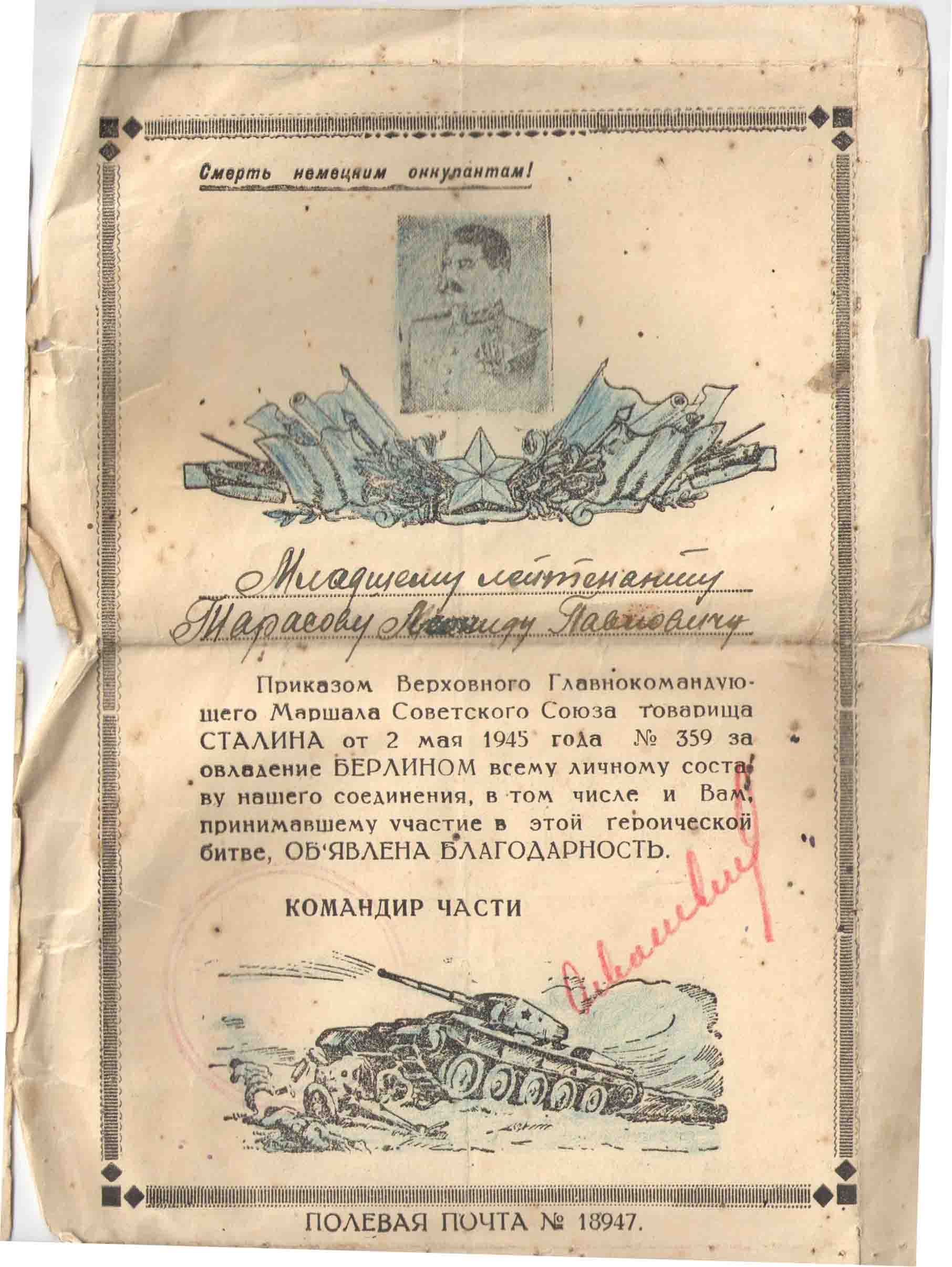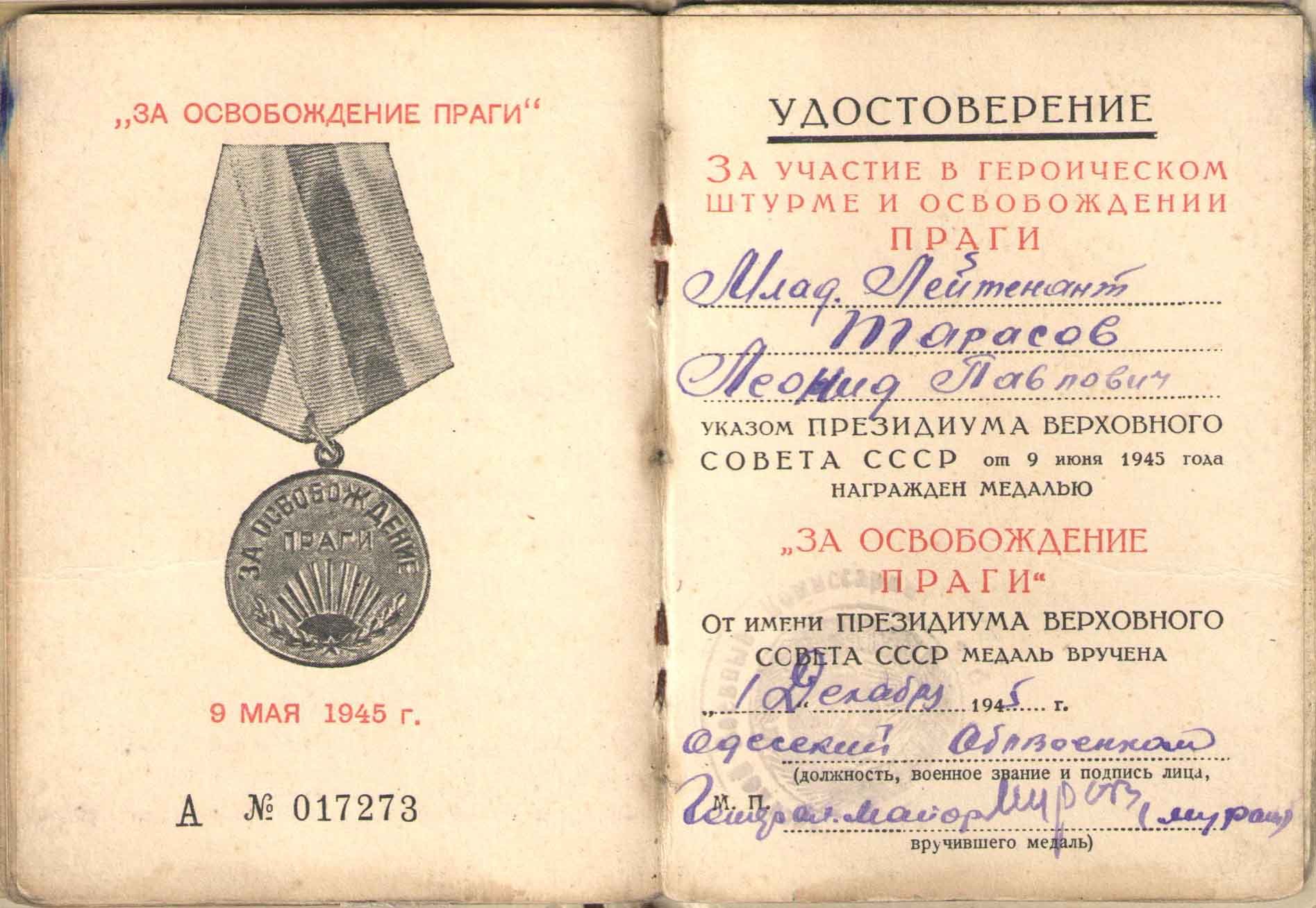 - орден Красной Звезды, 1945 г. Описание подвига: «В уличных боях за Берлин, в его предместье Лихтфорельде, 26.04.1945, младший лейтенант Тарасов, находясь в составе штурмовых подгрупп, осуществлял инженерное обеспечение боевых порядков 1-го МСБ. За данный день, не взирая на сильный ракетно-пулеметный огонь врага и активные действия «фауст-патронников», младший лейтенант Тарасов во главе взвода обнаружил и обезвредил заложенные в трех уличных баррикадах два фугаса и 6ПТМин, разобрал эти баррикады и пропустил через эти инженерные заграждения наши наступающие стрелковые подразделения и боевую технику»