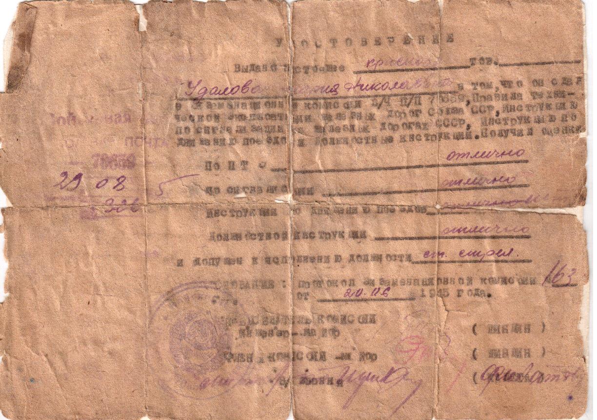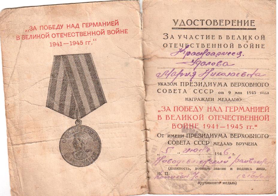 Потапова Мария Николаевна (урожденная Удалова) родилась 25 июля 1923 г. в с. Кяхта Новодевиченского района Куйбышевской области. С сентября 1943 г. по 12 ноября 1945 г. проходила военную службу в звании красноармейца в 13-ом эксплуатационном железнодорожном полку, который с 20 июля 1944 г. по 11 мая 1945 г. входил в состав действующей армии.