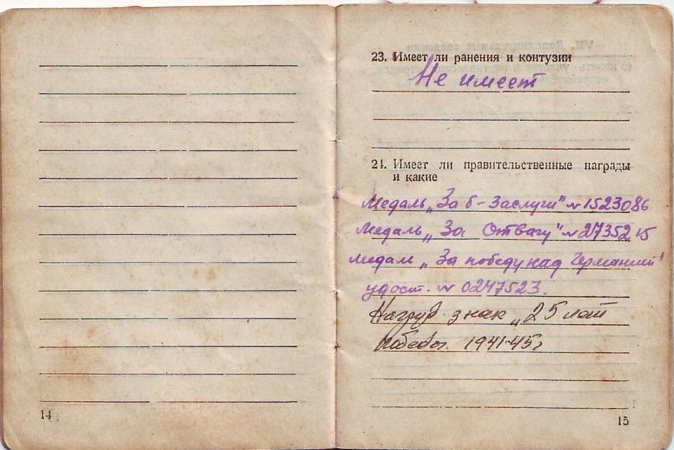 Награды: медали «За отвагу», «За боевые заслуги», «За победу над Германией в Великой Отечественной войне 1941-1945 гг.», юбилейные медали.