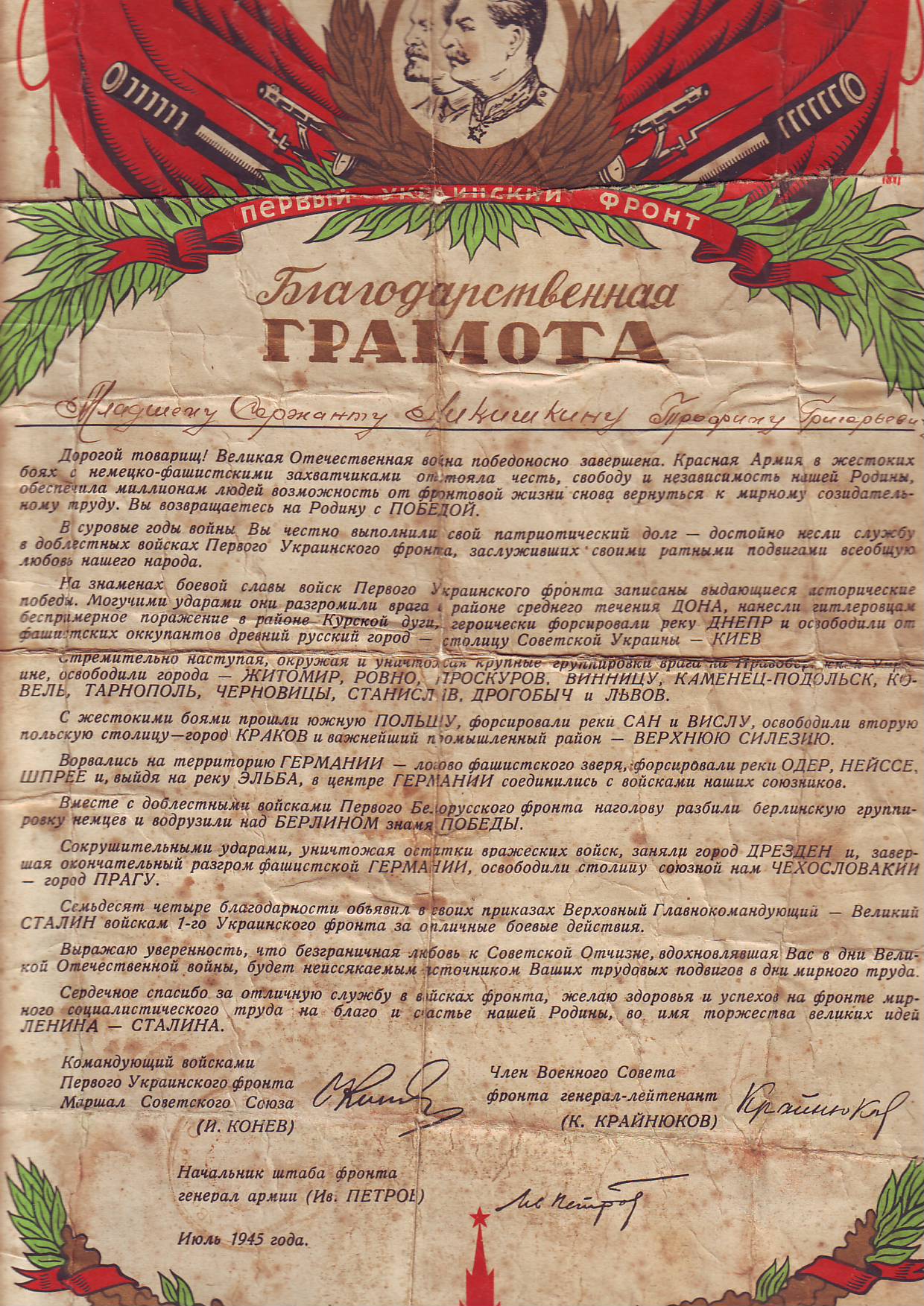 Родился 12 апреля 1906 г. в п. Титовка До войны работал на заводе 309 (ныне ФГУП «Металлист»). Когда пришла повестка, на всех рабочих завода распространялась бронь. Трофим Григорьевич отказался от брони и в 1941 году пошел на фронт. Призывался из п. Иващенково (ныне – г. Чапаевск).