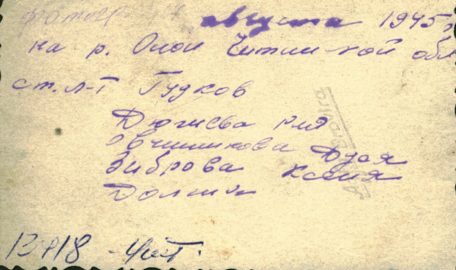 На обороте одной из фотографий есть сделанная Марией Михайловной запись: «Фотогр. 14 августа 1945 г на р. Онон Читинской обл. Ст л-т Гудков. Дюгиева Рая. Овчинникова Дуся. Зиброва Ксеня. Долгих»
