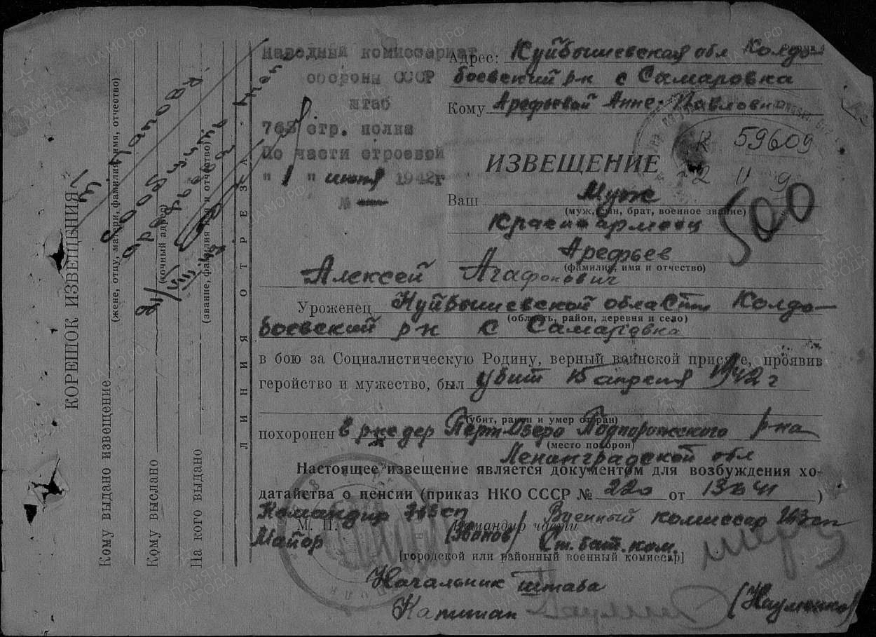 Красноармеец Арефьев Алексей Агафонович был убит в бою 15.04.1942 года. Был женат на Анне Павловне Арефьевой, которой и пришло извещение о гибели мужа. Похоронен в деревне Пертозеро Подпорожского района Ленинградской области.