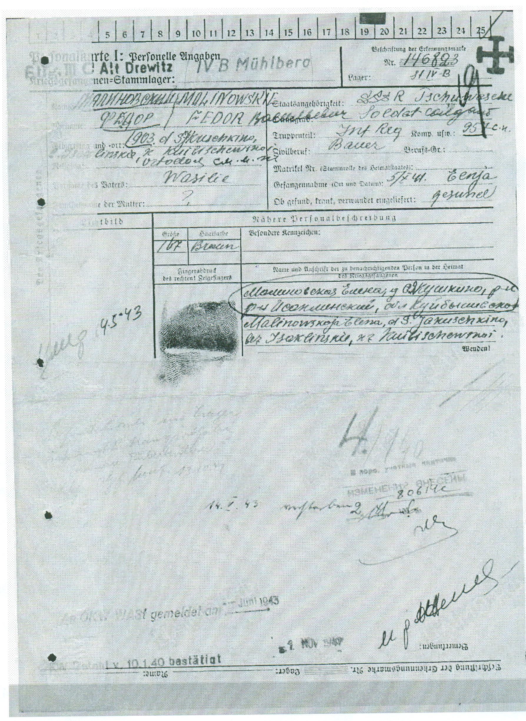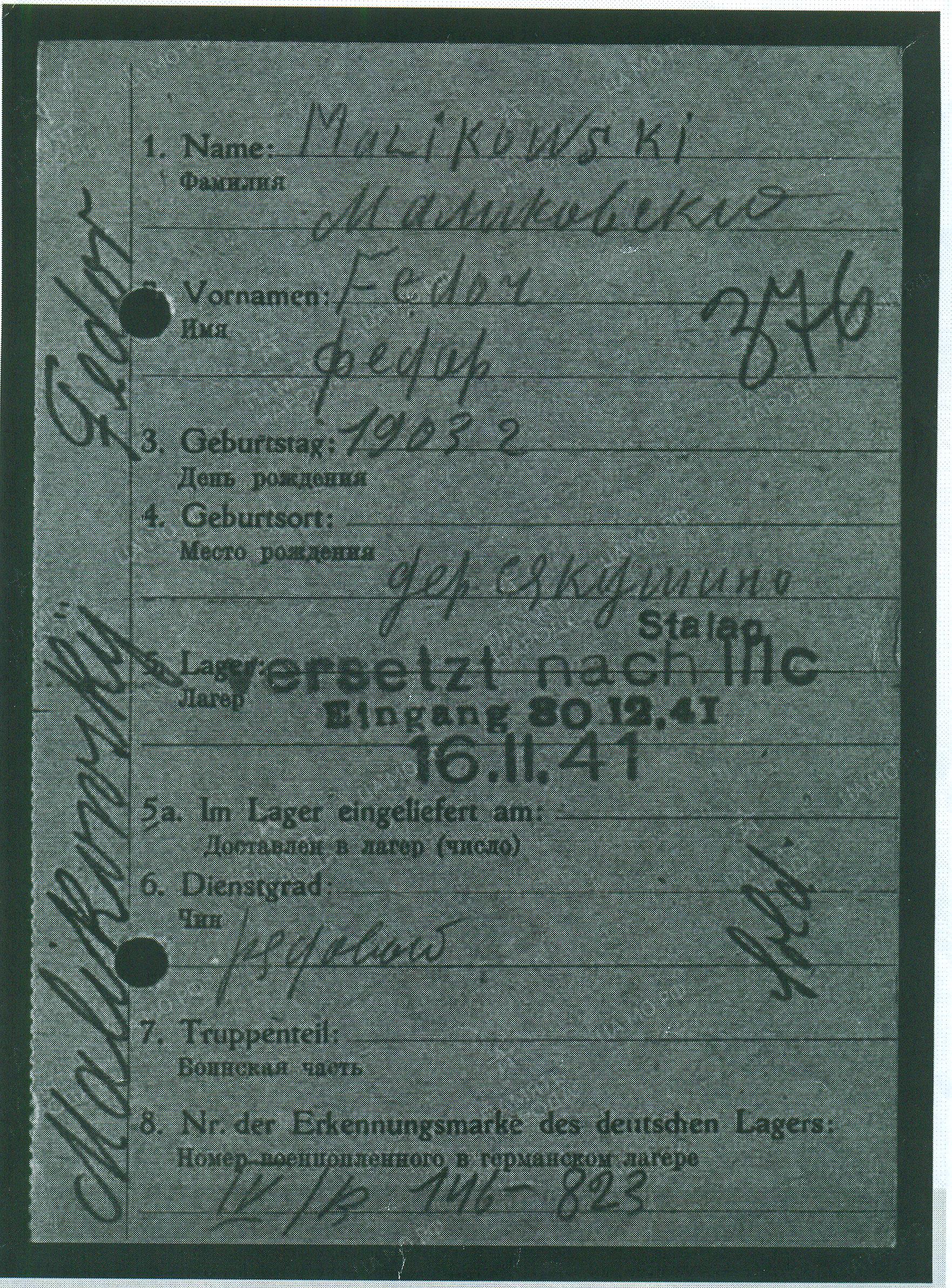 Во время Великой Отечественной войны воевал в звании рядового. Попал в плен 05.10.1941 г. Доставлен в лагерь военнопленных 16.11.1941 г. В 1943 году погиб в плену. В лагере имел номер 146-823. Многие годы числился как без вести пропавший. Источник информации: архив ФСБ г.о. Самара».