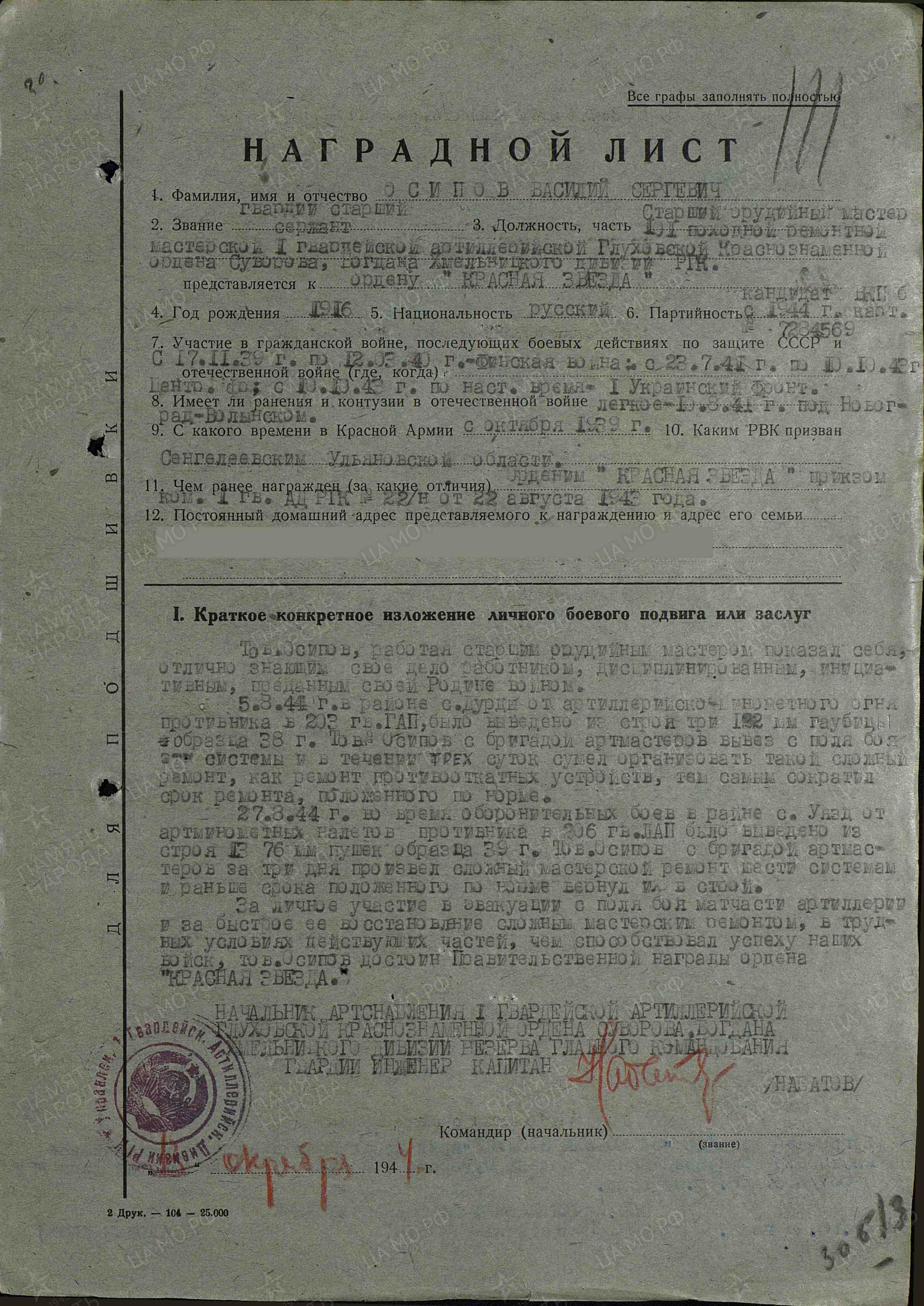 Работая старшим орудийным мастером, тов. Осипов проявил себя исключительно знающим ремонтное дело: как матчасти артиллерии, так и стрелкового вооружения. 4 апреля 1945 г. в районе Карлсхоф (Германия) в 200-м гвардейском легком артиллерийском полку в наступательных боях огнем артиллерии противника было выведено из строя четыре 76-мм пушки. Тов. Осипов выехал на опорный пункт в качестве руководителя бригады артмастеров. Массированный огонь врага не позволял ремонтировать системы на опорном пункте. Тов. Осипов, рискуя жизнью, под ружейно-пулеметным огнем к исходу дня отремонтировал, а 4-ю пушку, которая находилась под неослабным наблюдением и обстрелом противника, Осипов лично, без участия других мастеров, восстановил, причем ремонт был исключительно сложным. В результате самоотверженного труда и личной храбрости Осипова все 4 пушки за сутки были отремонтированы. 7 апреля 1945 г. в районе Штребниц в 167-м гвардейском легком артиллерийском полку были выведены из строя 3 пушки 76-мм ЗиС-3. Осипов с двумя артмастерами выехал на опорный пункт. Обстановка требовала немедленного возвращения пушек в строй. Осипов, не имея запчастей, путем реставрации и подгонки вручную в течение дня восстановил все 3 пушки. Этим самым исключительно способствовал успешному наступлению наших войск. Вполне достоин правительственной награды - ордена Отечественной войны II степени (награжден орденом Красной Звезды; наградной лист от 14.05.1945 г.).