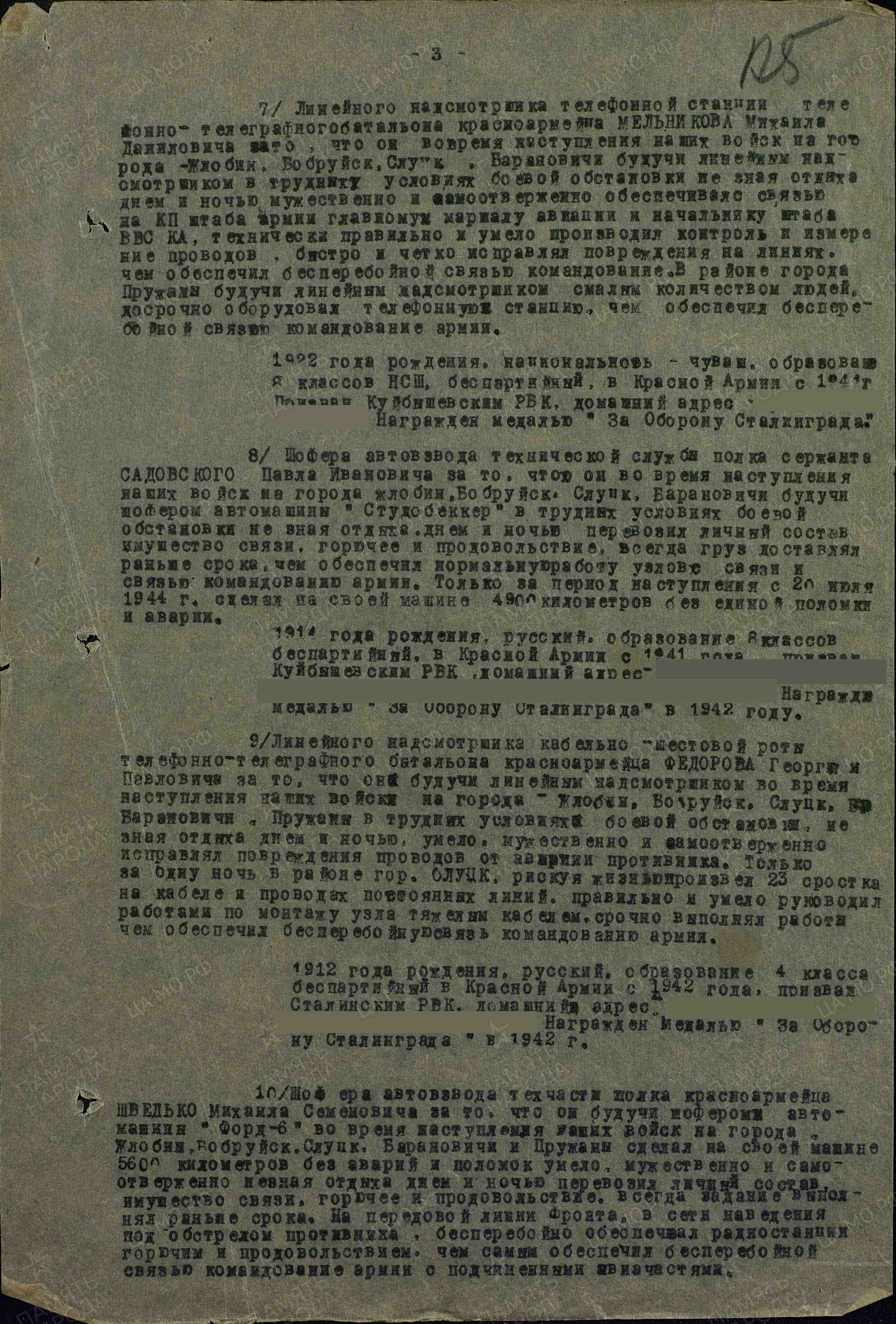 Наградить линейного надсмотрщика телефонной станции телефонно-телеграфного батальона красноармейца Мельникова Михаила Даниловича за то, что он во время наступления наших войск на города – Жлобин, Бобруйск, Слуцк, Барановичи будучи линейным надсмотрщиком в трудных условиях боевой обстановки, не зная отдыха днем и ночью мужественно и самоотверженно обеспечивал связью на КП штаба армии главному маршалу авиации и начальнику штаба ВВС КА, технически правильно и умело проводил контроль и измерение проводов, быстро и четко исправлял повреждения на линиях, чем обеспечил бесперебойной связью командование. В районе города Пружаны будучи линейным надсмотрщиком, с малым количеством людей оборудовал телефонную станцию, чем обеспечил бесперебойной связью командование армии.