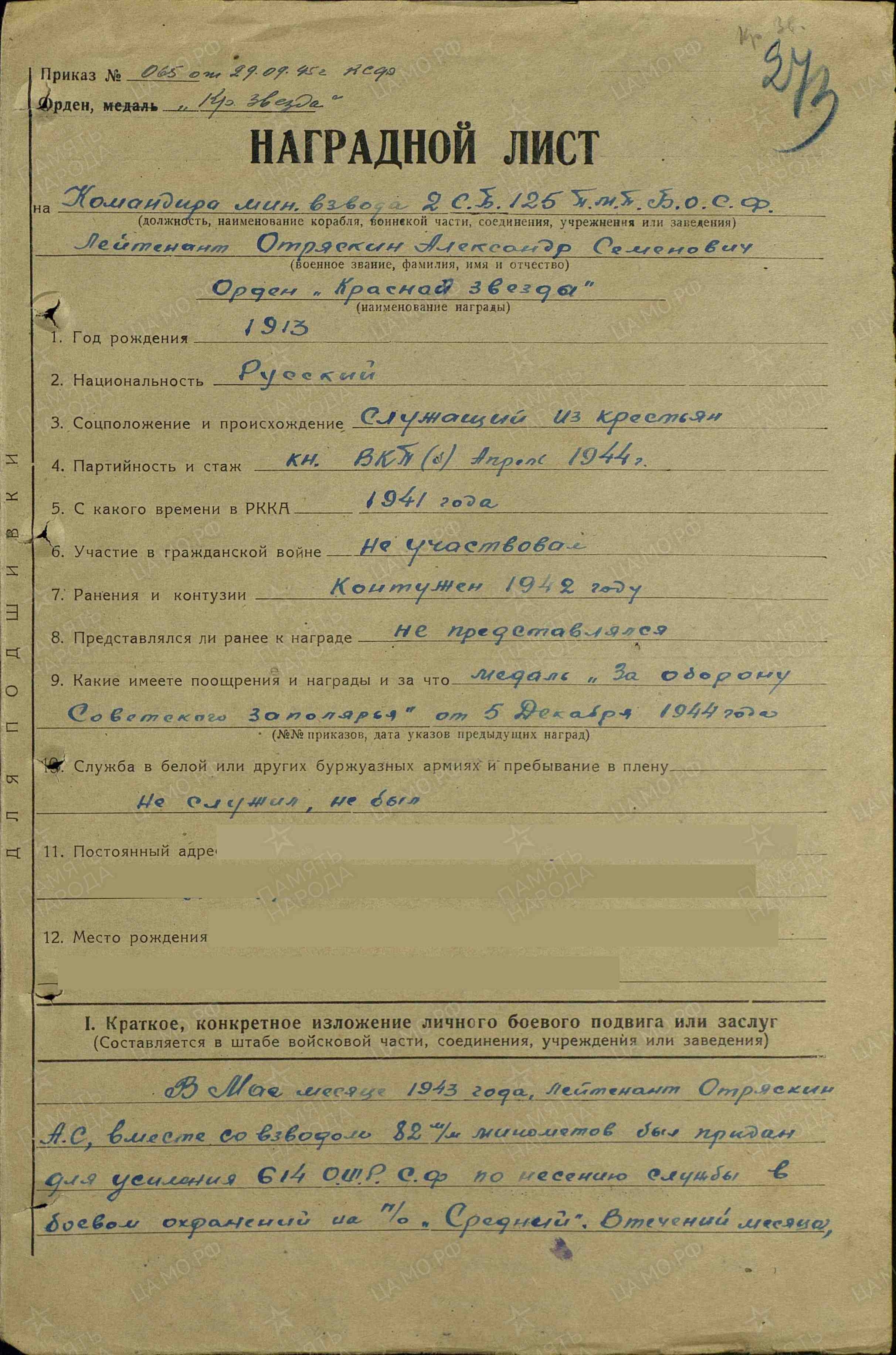 2. Орден Красной Звезды (Приказ № 065 от 29.09.1945 г.) Описание подвига: «В мае 1943 года лейтенант Отряскин А.С., вместе с взводом 82 м/м минометов был придан для усиления 614 О.Ш.Р.С.Ф. по несению службы в боевом охранении на п/о «Средний». В течении месяц л-т Отряскин минометным огнем взвода подавил свыше 10 огневых точек противника, проявил при этом мужество, стойкость и отвагу. Будучи тяжело контужен, зная важность выполнения поставленной перед ним задачи, л-т Отряскин отказался от эвакуации в госпиталь, и продолжал нести службу в боевом охранении больше месяца. Однажды противник заметил, что группа наших бойцов работает на подноске боеприпасов к минометным боевым позициям и открыл по ним сильный ружейно-пулеметный огонь. Бойцы залегли. Мины на о.п. были израсходованы и подавить огонь противника было нечем. Л-т Отряскин под огнем противника, рискуя жизнью, встретил бойцов, взял ящик с минами и донес его до огневых позиций.