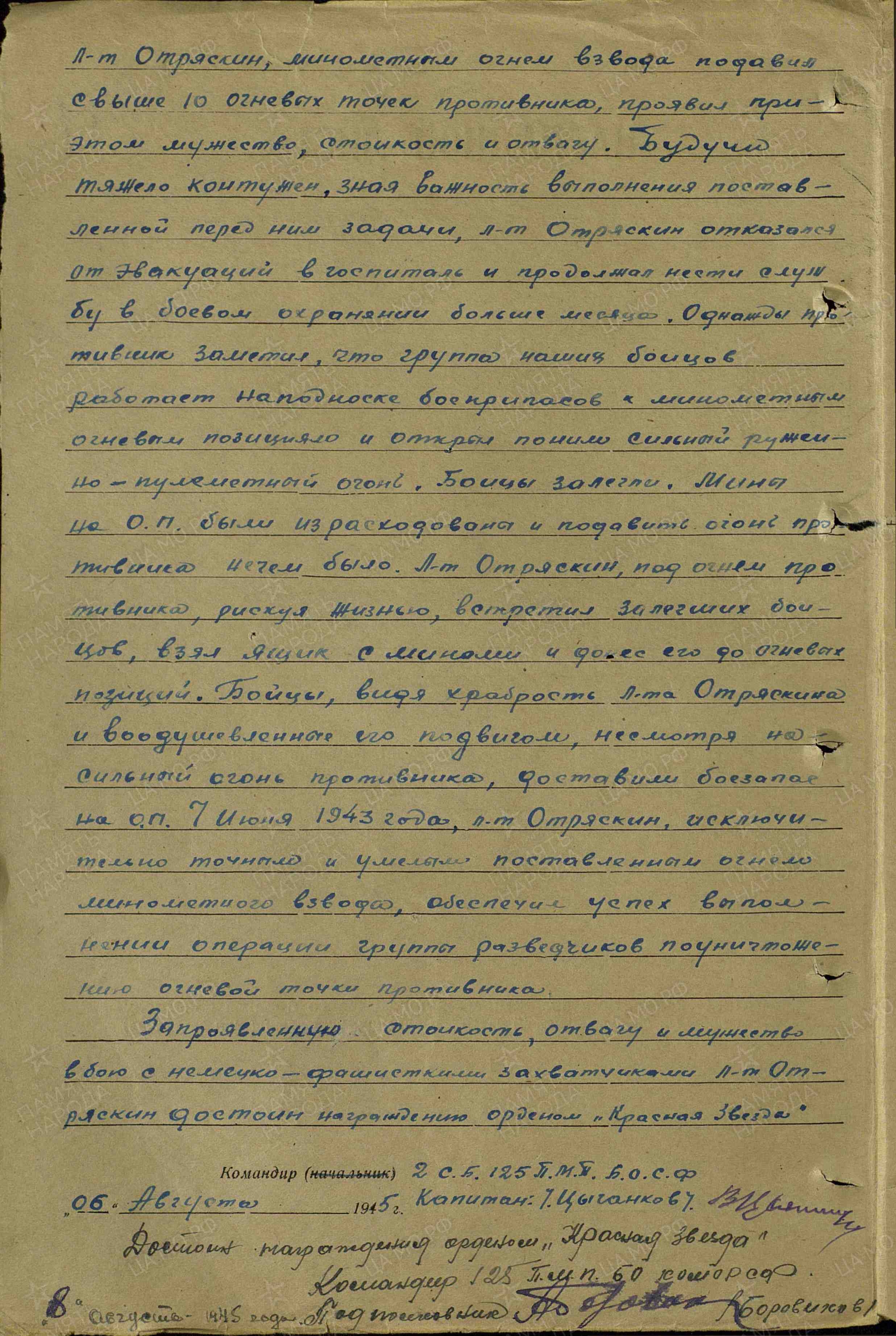 Бойцы, видя храбрость лейтенанта Отряскина и воодушевленные его подвигом, несмотря на сильный огонь противника, доставили боезапас на о.п. 7 июня 1943 года. Лейтенант Отряскин исключительно точным и умелым поставленным огнем минометного взвода обеспечил успех выполнения операции группы разведчиков по уничтожению огневой точки противника. За проявленную стойкость, отвагу и мужество в бою с немецко-фашистскими захватчиками лейтенант Отряскин достоин награждению орденом «Красная Звезда».