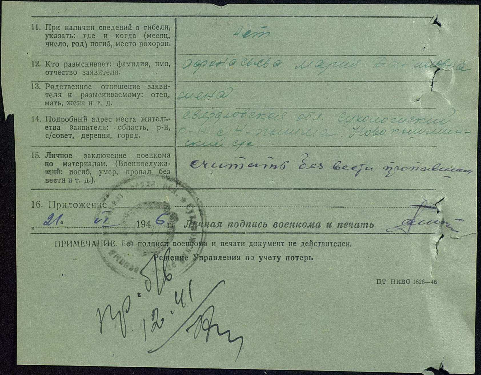 Последнее письмо было из Кинешмы. В декабре 1941 г. пропал без вести. Другой информации на сегодняшний день нет.