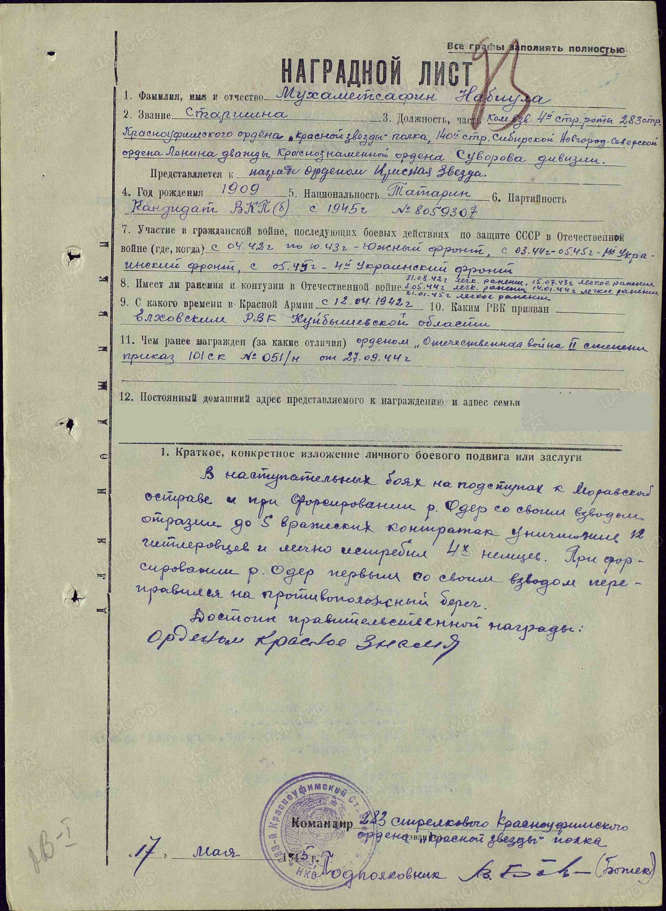В наступательных боях на подступах к Моравской Остраве (Чехословакия) и при форсировании р. Одер со своим взводом отразил до 5 вражеских контратак, уничтожив 12 гитлеровцев и лично истребил 4-х немцев. При форсировании р. Одер первым со своим взводом переправился на противоположный берег. Достоин правительственной награды - ордена Красного Знамени (награжден орденом Отечественной войны I степени; наградной лист от 17.05.1945 г.).