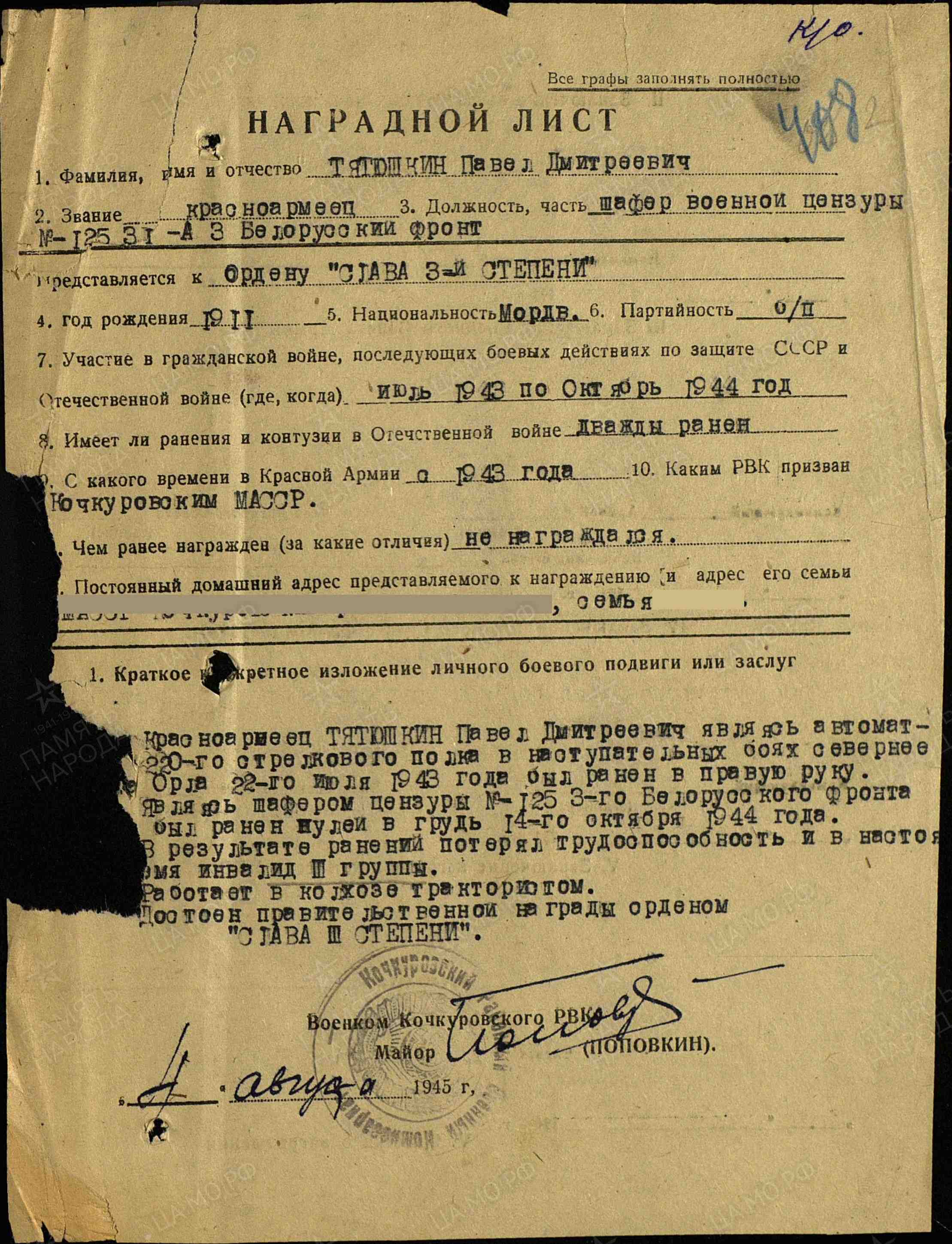Родился 15 апреля 1911 г. в с. Семилей Кочкуровского района республики Мордовия. В 1942 г. был мобилизован на фронт, до этого времени у него была бронь, т.к. он работал на железнодорожном заводе.