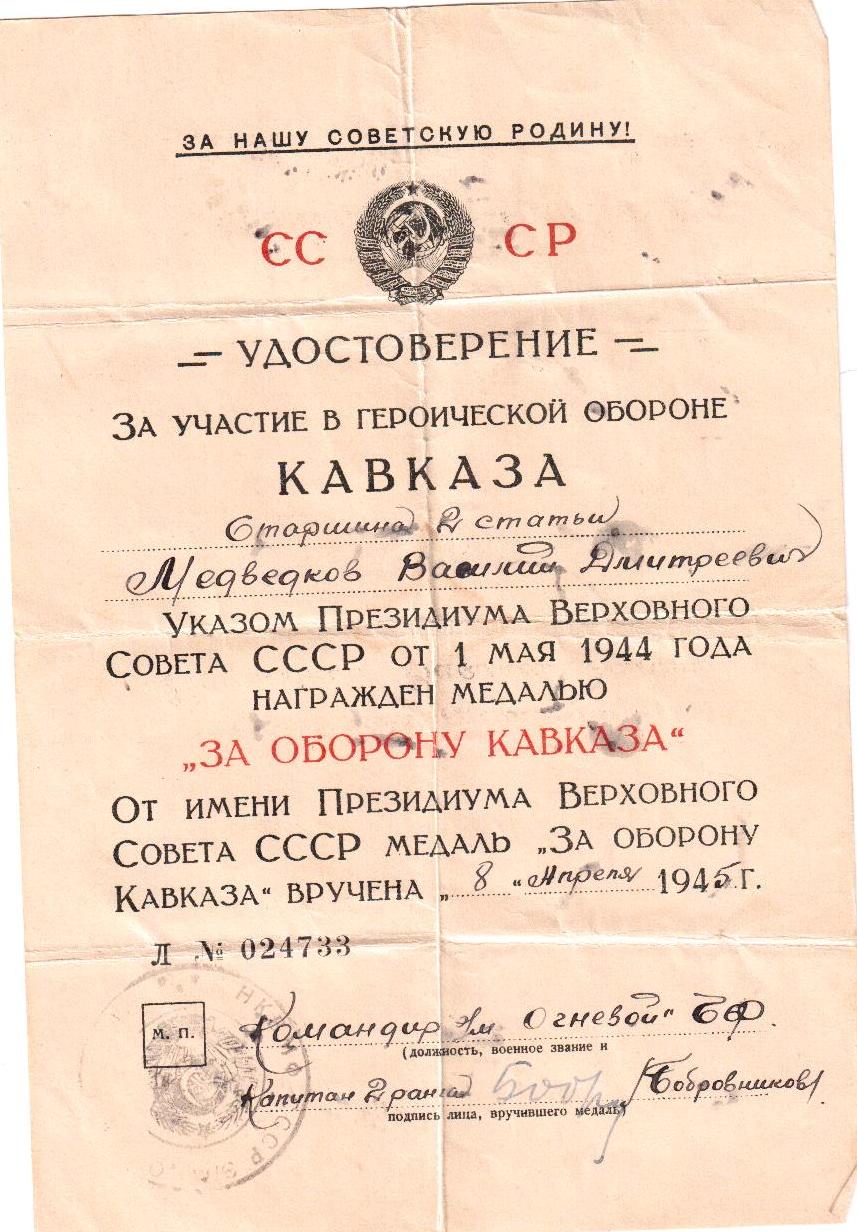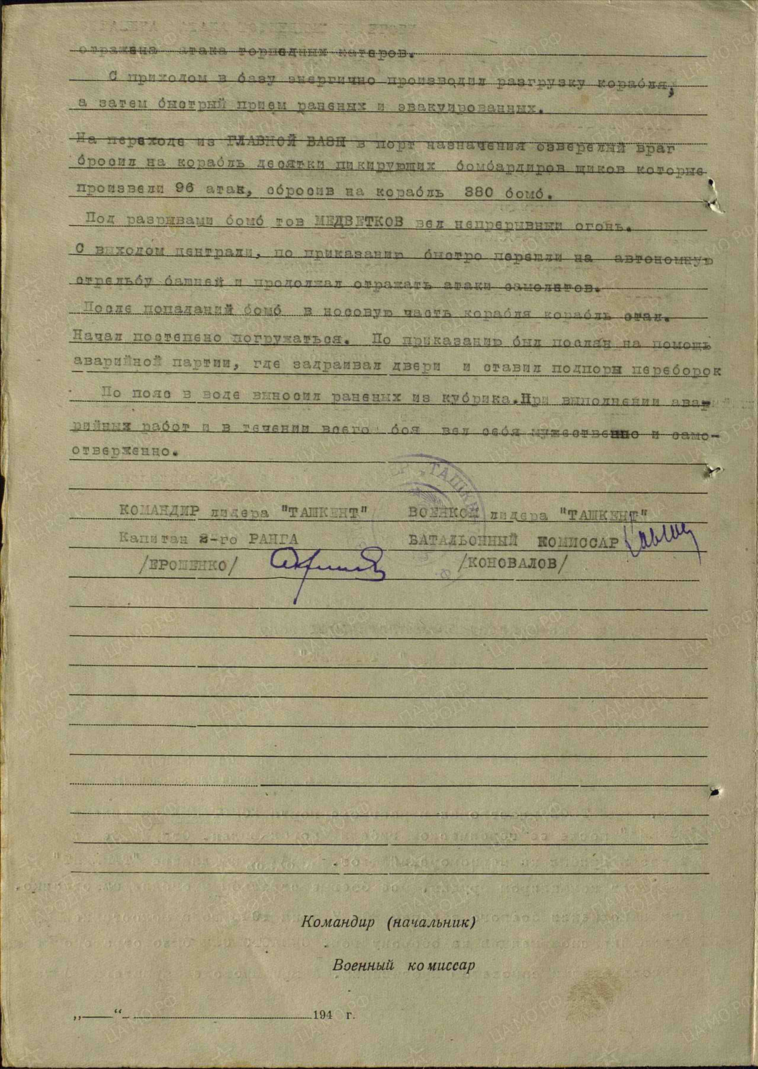 Однажды, когда только отошли от Севастополя и на борту корабля, кроме команды, находилось до 2000 раненых солдат и офицеров – налетели самолеты, потом еще и еще. 91 самолетовылет был сделан с целью потопить корабль. Но они отбились. За это весь личный состав наградили орденами и медалями. В Новороссийске Маршал Советского Союза С.М. Буденный вручил Василию Дмитриевичу Медведкову орден Красного Знамени. После того, как «Ташкент» затонул, служил на эсминце «Беспощадный». В послевоенные годы Василий Медведков служил сверхсрочно на черноморских миноносцах, а потом уволился в запас в звании мичмана. Вернулся в родное село Новопавловку, где, приняв тракторную бригаду, занялся хлеборобским делом.