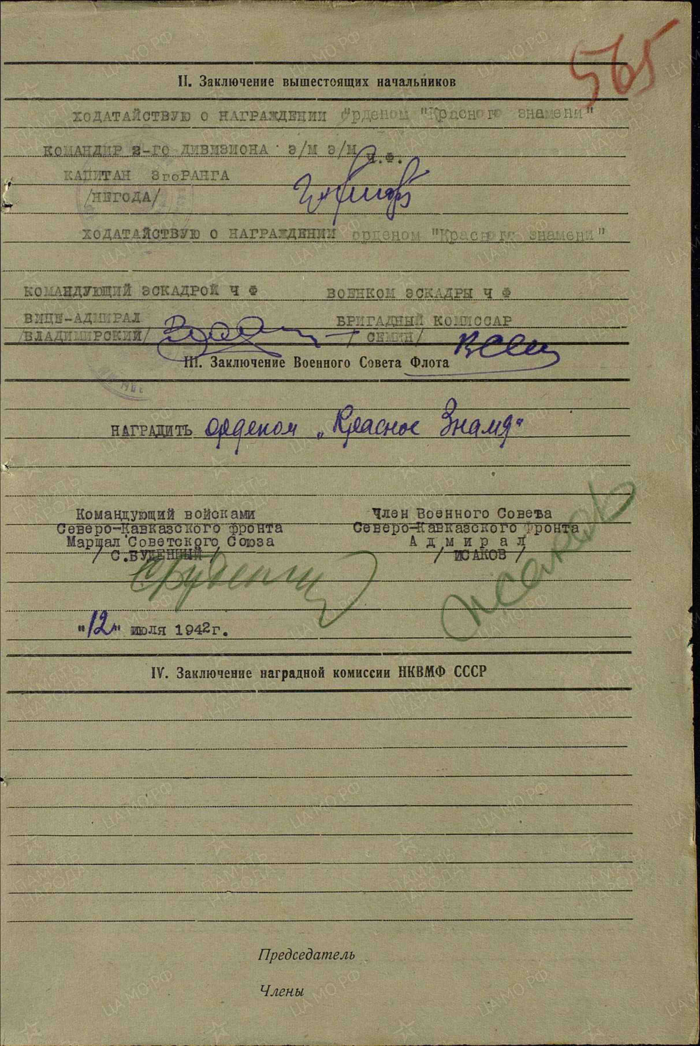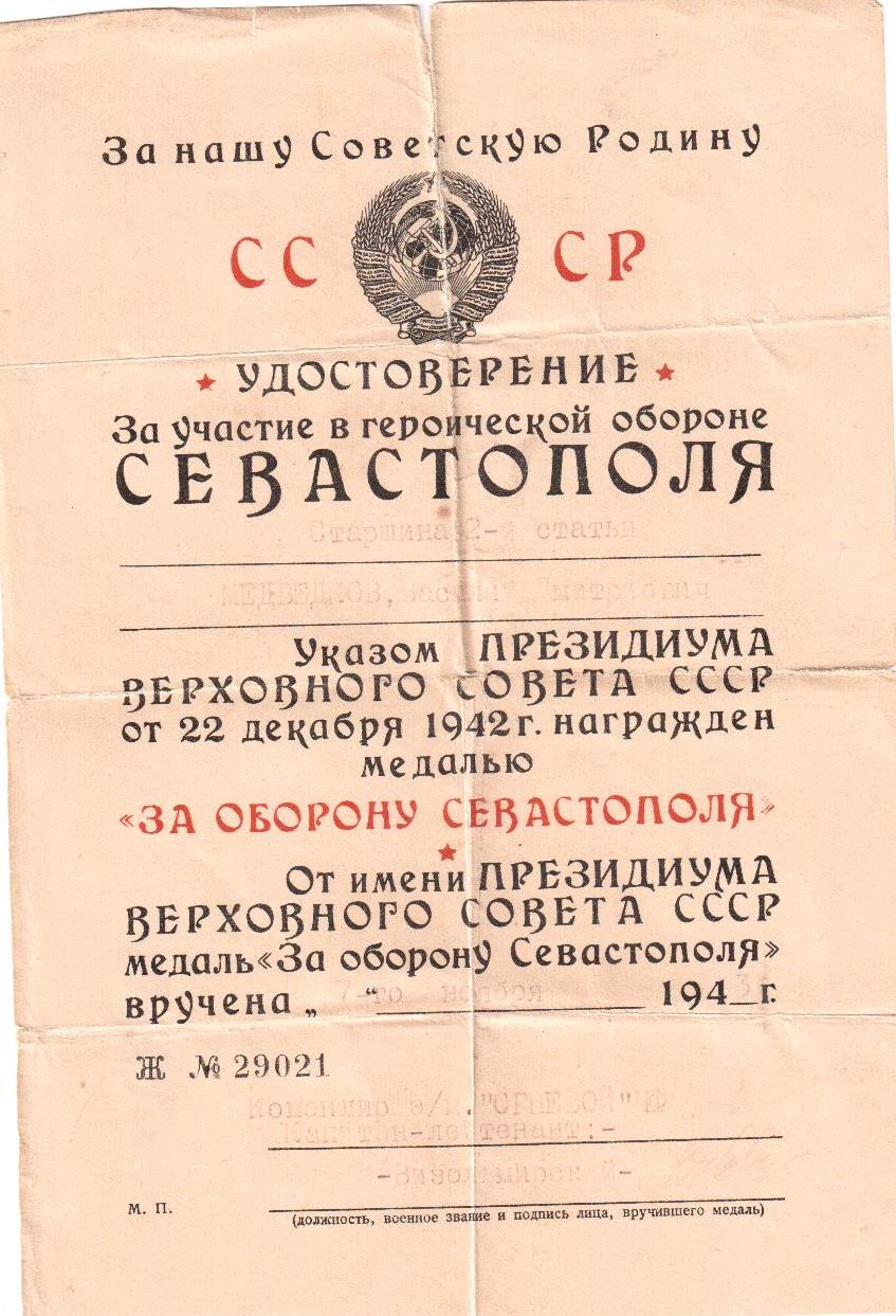 Информация сайта podvignaroda.ru: «Тов. Медведков участвовал в разгроме порта Констанца на лидере «Москва», после ее героической гибели попал в плен, откуда бежал и вновь прибыл на Черноморский флот. Находясь на лидере «Ташкент», работает командиром орудия. Все боевые стрельбы проводит на «отлично». При выполнении боевого задания по доставке красноармейцев для обороны г. Севастополь 26-27 июня 1942 г. было отражено несколько атак самолетов противника. При проходе фарватера была отражена атака торпедных катеров. С приходом на базу энергично производил разгрузку корабля, а затем быстрым приемом раненых и эвакуируемых. На переходе с главной базы в порт назначения озверелый враг бросил на корабль десятки пикирующих бомбардировщиков, которые произвели 96 атак, сбросив на корабль 380 бомб. Под разрывами бомб тов. Медведков вел непрерывный огонь. С выходом из строя централи, по приказанию быстро перешли на автономную стрельбу башней и продолжали отражать атаки самолетов. После попаданий бомб в носовую часть корабль стал, начал постепенно погружаться. По приказанию был послан на помощь аварийной команде, с которой задраивал двери и ставил подпоры переборок. По пояс в воде выносил раненых из кубрика. При выполнении аварийных работ и в течение всего боя вел себя мужественно и самоотверженно. Достоин правительственной награды – ордена Красного Знамени» (наградной лист от 16.07.1942 г.).