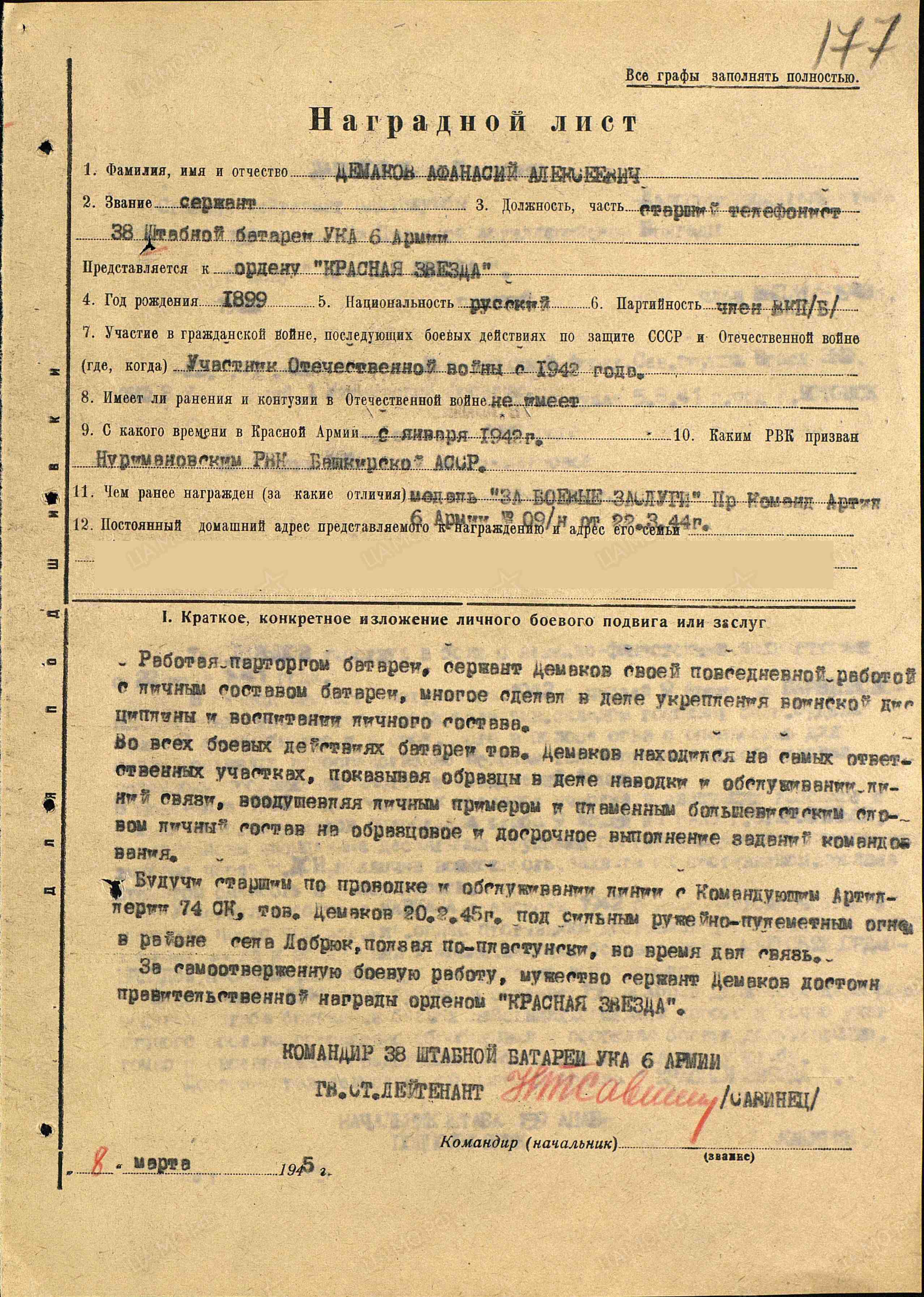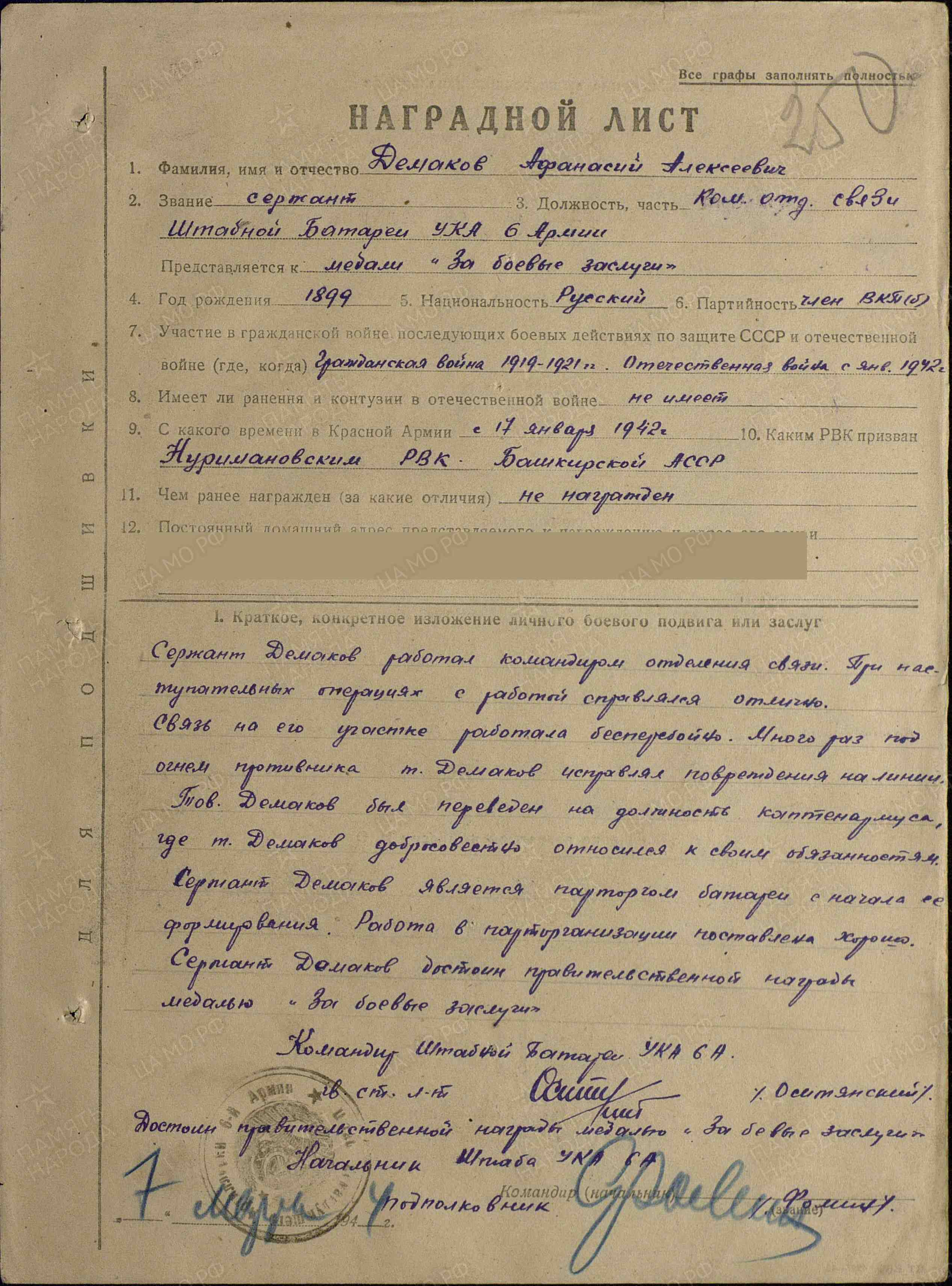 «Сержант Демаков работал командиром отделения связи. При наступательных операциях с работой справлялся отлично. Связь на его участке работала бесперебойно. Много раз под огнем противника тов. Демаков исправлял повреждения на линии. Тов. Демаков был переведен на должность капте-нармуса, при исполнении обязанностей которого был добросовестным. Сержант Демаков является парторгом батареи с начала ее формирования. Работа в парторганизации поставлена хорошо. Сержант Демаков достоин правительственной награды – медали "За боевые заслуги"» (наградной лист от 07.03.1944 г.).