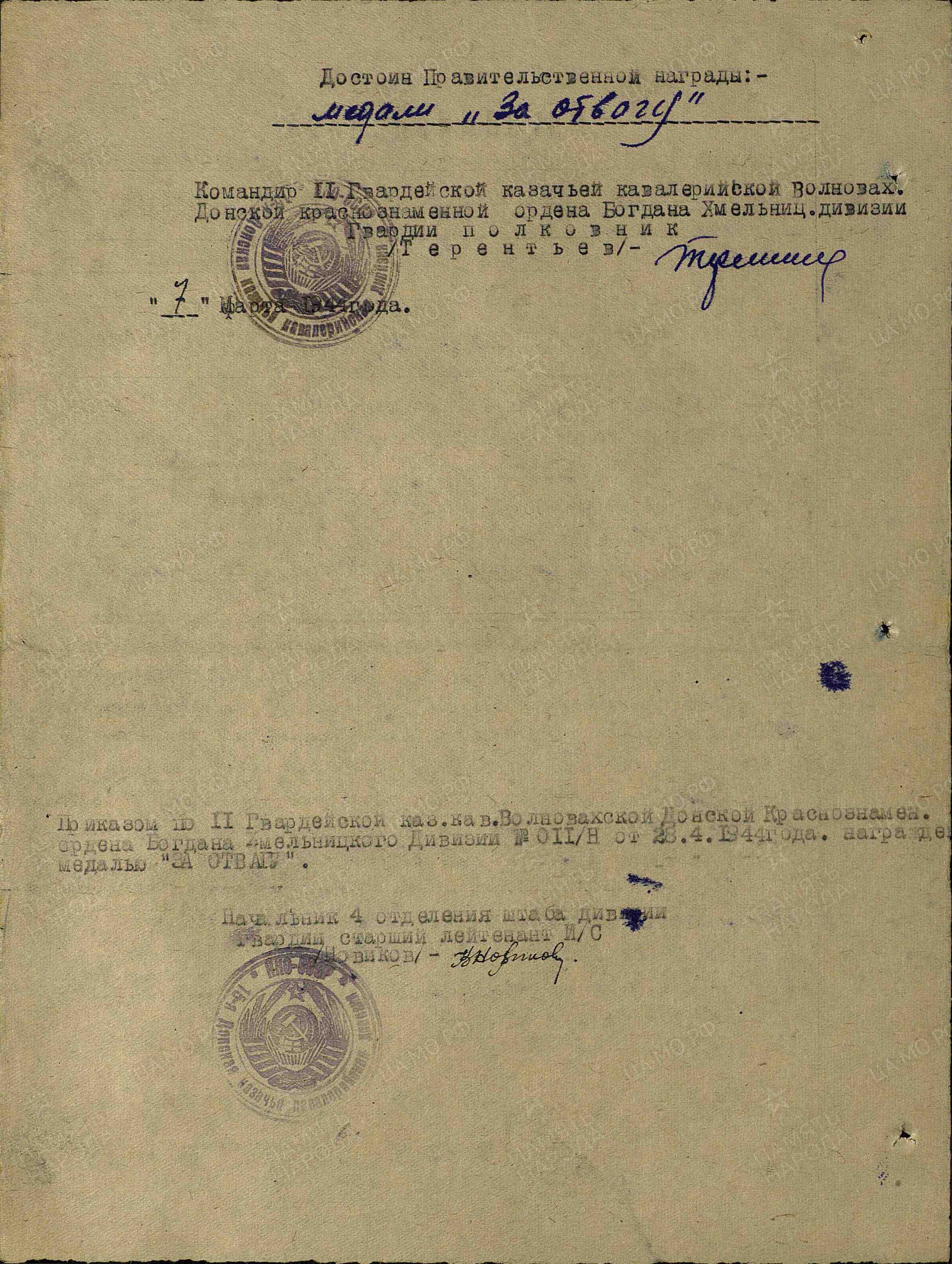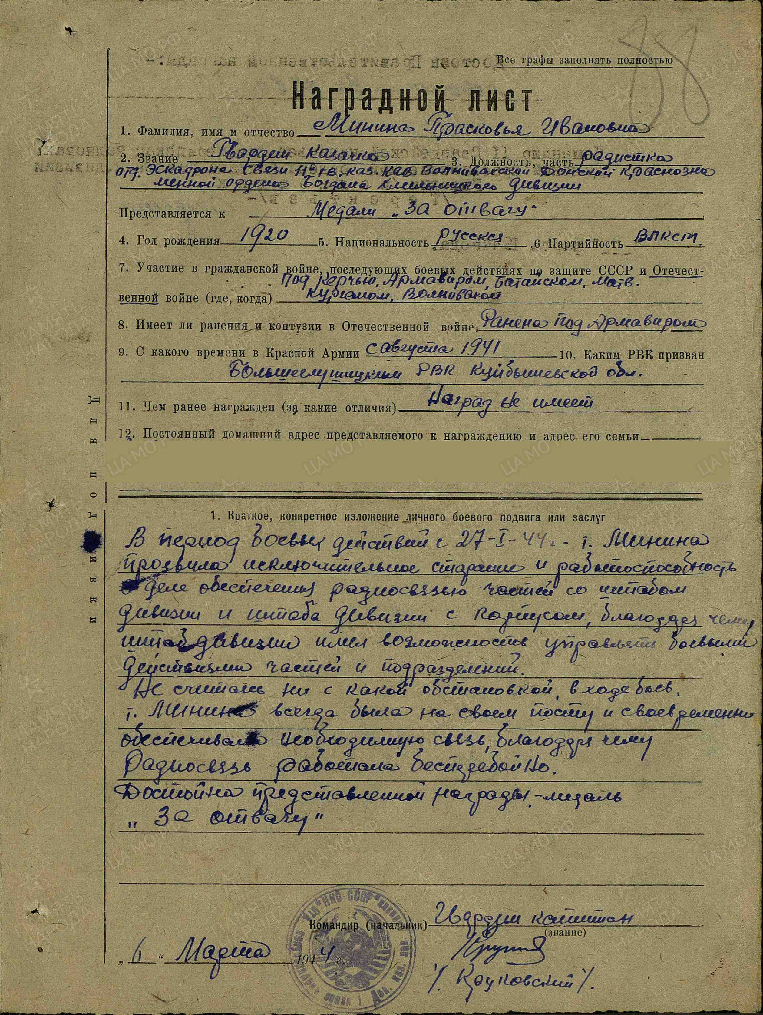 «Гвардии казачка Минина Т.И. в отдельном эскадроне связи работает с октября 1942 г. Казачка Минина проявила себя достойно в борьбе с немецкими захватчиками. Тов. Минина числится в эскадроне телеграфистом, но в боевой обстановке всегда наводит проводимую связь и обслуживает связью полки. Кроме дежурства на телефоне она часто выходит на исправление линии. В районе Дебрецен (Венгрия) линия связи в ночное время была порвана танками противника. На ее исправление была выслана тов. Минина, которая исправила ее в течение 15-20 минут, невзирая на опасность. Заслуживает правительственной награды – медали "За отвагу"» (наградной лист от 28.10.1944 г.).