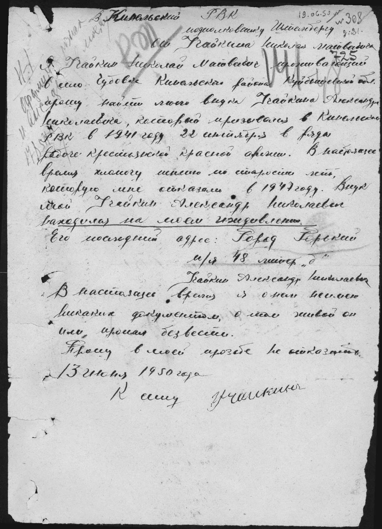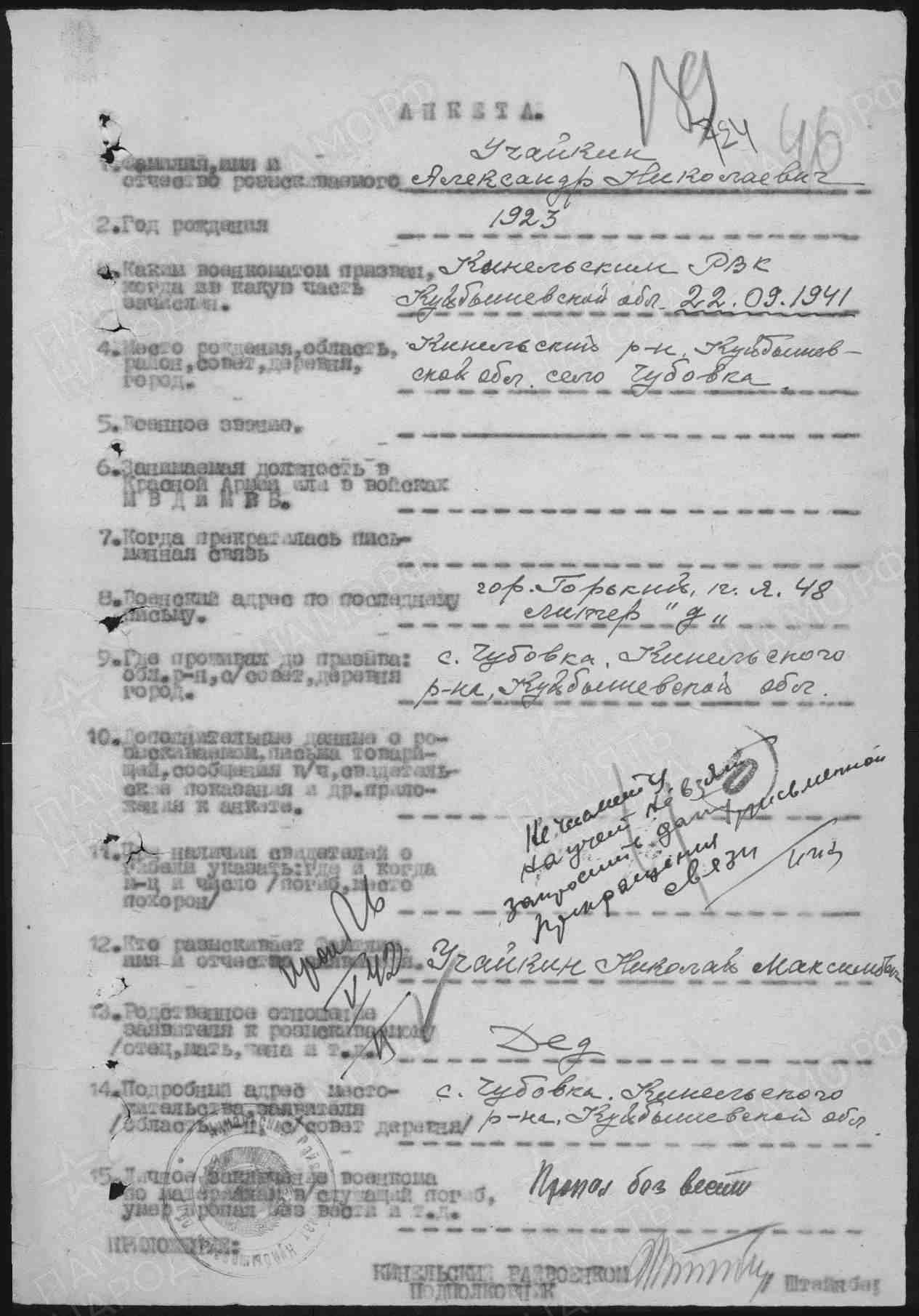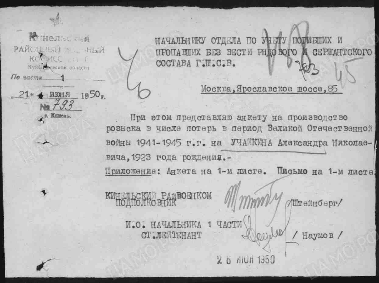 После окончания войны, в июне 1950 года, его дед – Учайкин Николай Матвеевич возбудил розыскное дело с целью узнать судьбу своего родственника.