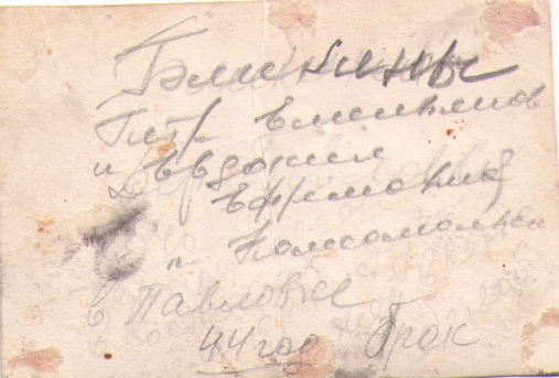 Познакомились на фронте, на Дальнем Востоке, в артиллерийских войсках. День Победы встретили в Молдавии. В 1945 г. поженились в пос. Комсомольском Куйбышевской области. Бликин Петр Емельянович продолжил службу. Был награжден орденом Красной Звезды.