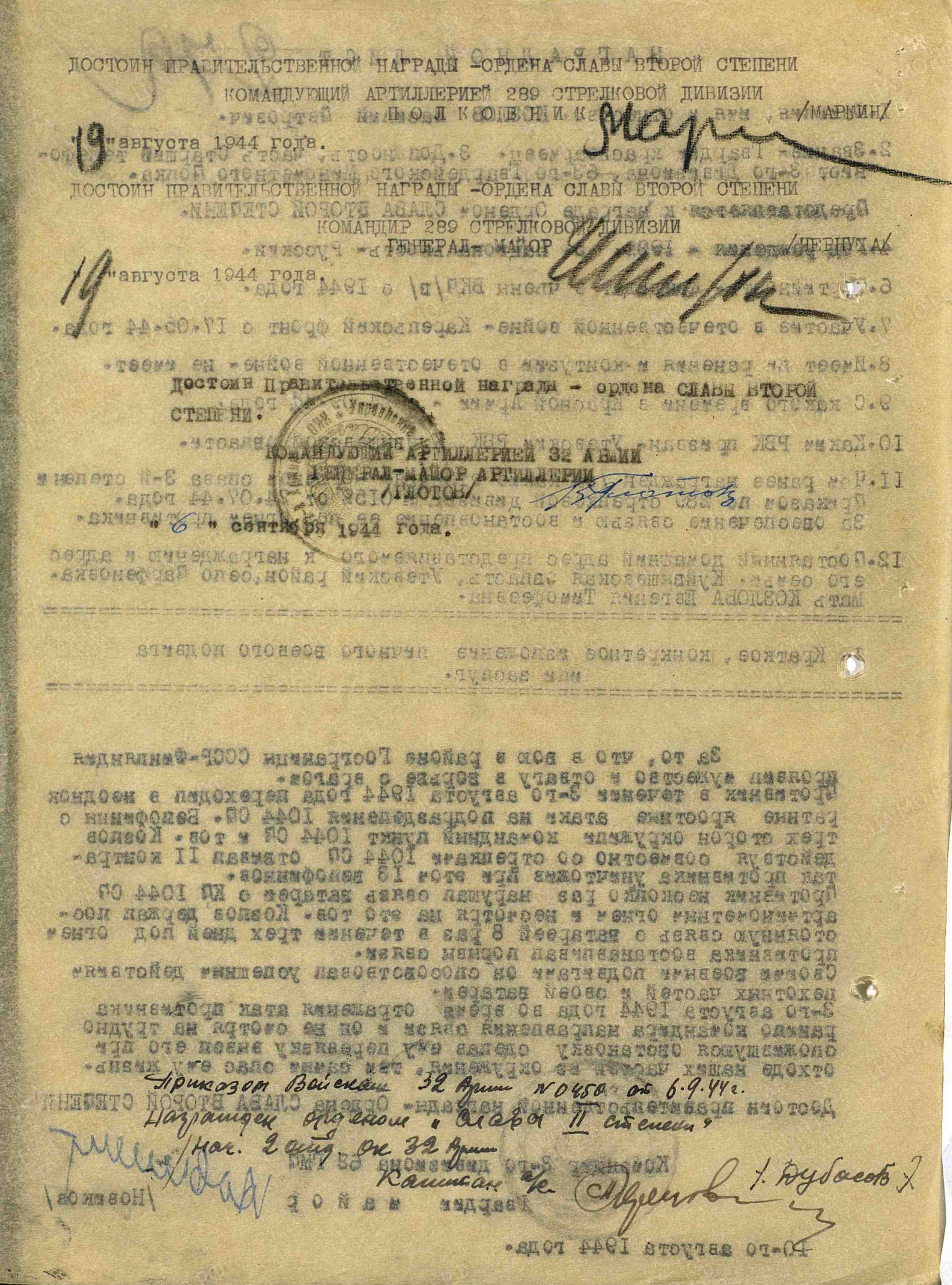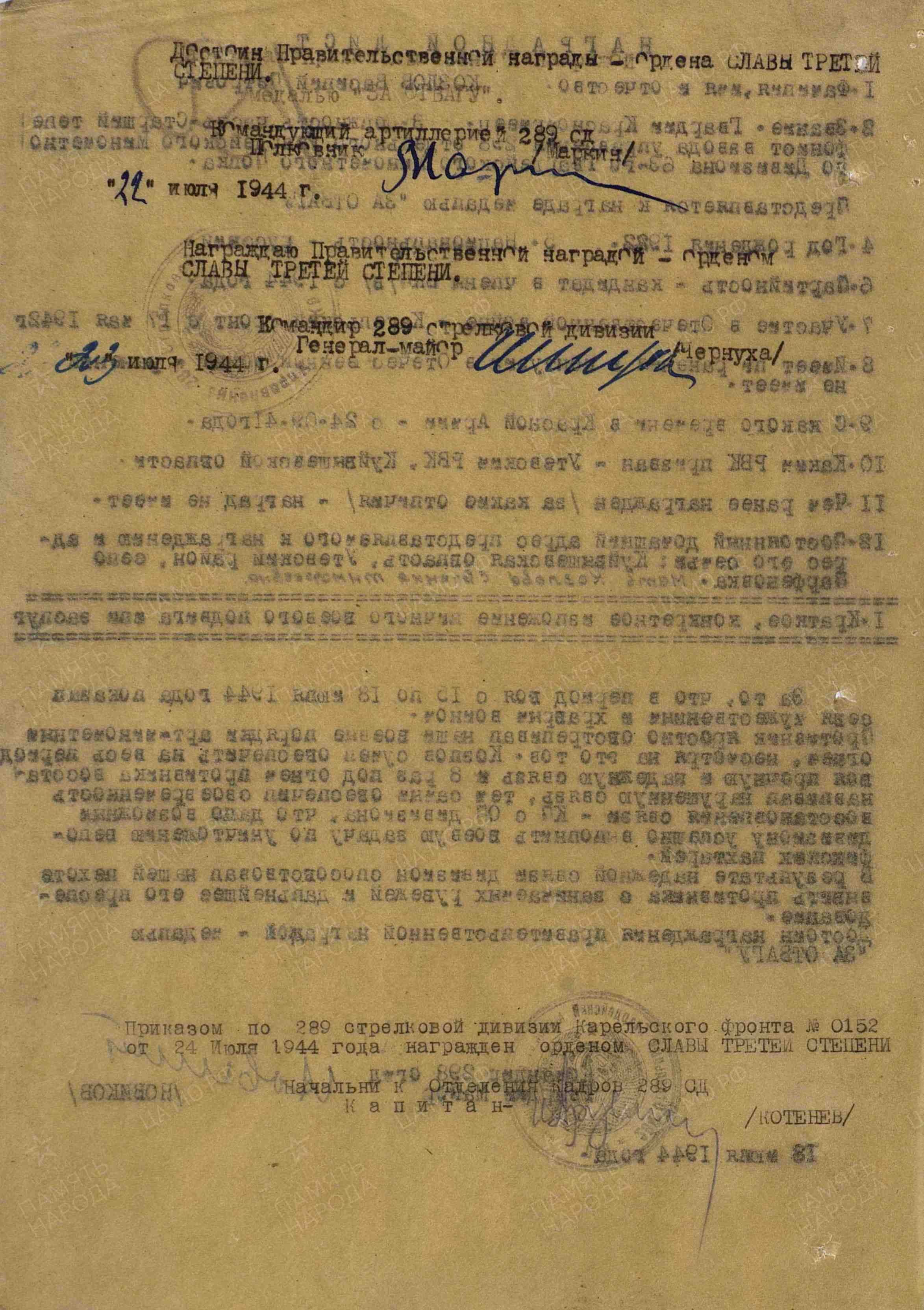 Награды: орден Славы 2 и 3 степени; орден Отечественной войны 2 степени; медаль «За победу над Германией в Великой Отечественной войне 1941-1945 гг.»; медаль «За победу над Японией»; юбилейные медали.