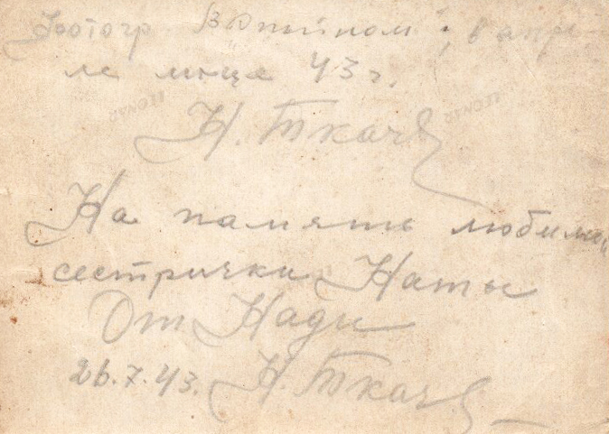 Транцева (в девичестве Ткаченко) Надежда Ефимовна родилась в 1919 году. До войны закончила медицинскую школу по специальности акушерка. Сразу же после начала войны, в июне 1945 года призвана в ряды Красной армии. Проходила службу с июня 1941 года по июнь 1942 в должности старшей медсестры эвакогоспиталя Юго-Западного фронта. 1