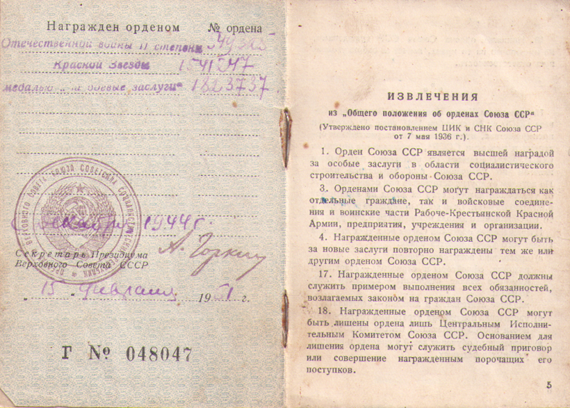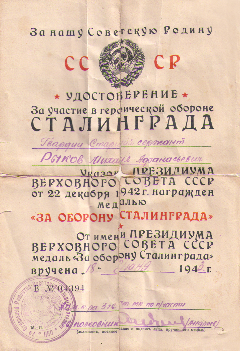 Награды: орден Отечественной Войны 2 степени, орден Красной Звезды, медали «За победу над Германией в Великой Отечественной войне 1941-1945 гг.», «За боевые заслуги», «За оборону Сталинграда».