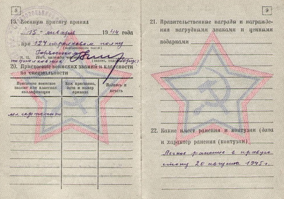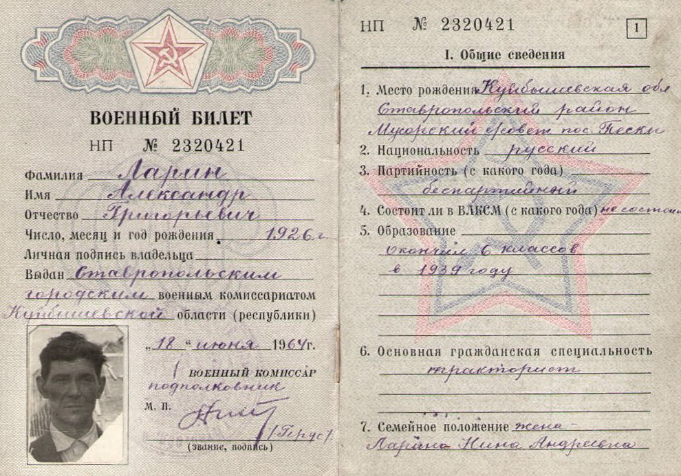 Его первый бой был на реке Ам-Гунь, когда штурмовали сопки, встретили яростное сопротивление японских смертников. За мужество и смелость 18 апреля 1946 г. он представлен к награждению медалью «За боевые заслуги»: «Красноармеец Ларин при участии в боях против японцев на Цицикаро-Мерченском направлении в бою за Ганцзинский укрепленный район своим пулеметом подавлял мелкие группы японских солдат и офицеров. При штурме деревни Лянцзятунь 21 августа 1945 г. был тяжело ранен в ногу». Вот только награду Александру Григорьевичу вручили только в 1997 г. С октября 1945 по март 1948 гг. служба пулеметчика Александра Григорьевича проходила в 435-м стрелковом полку, а с марта 1948 г. – в 438-м стрелковом полку на Дальнем Востоке в Комсомольске-на-Амуре.
