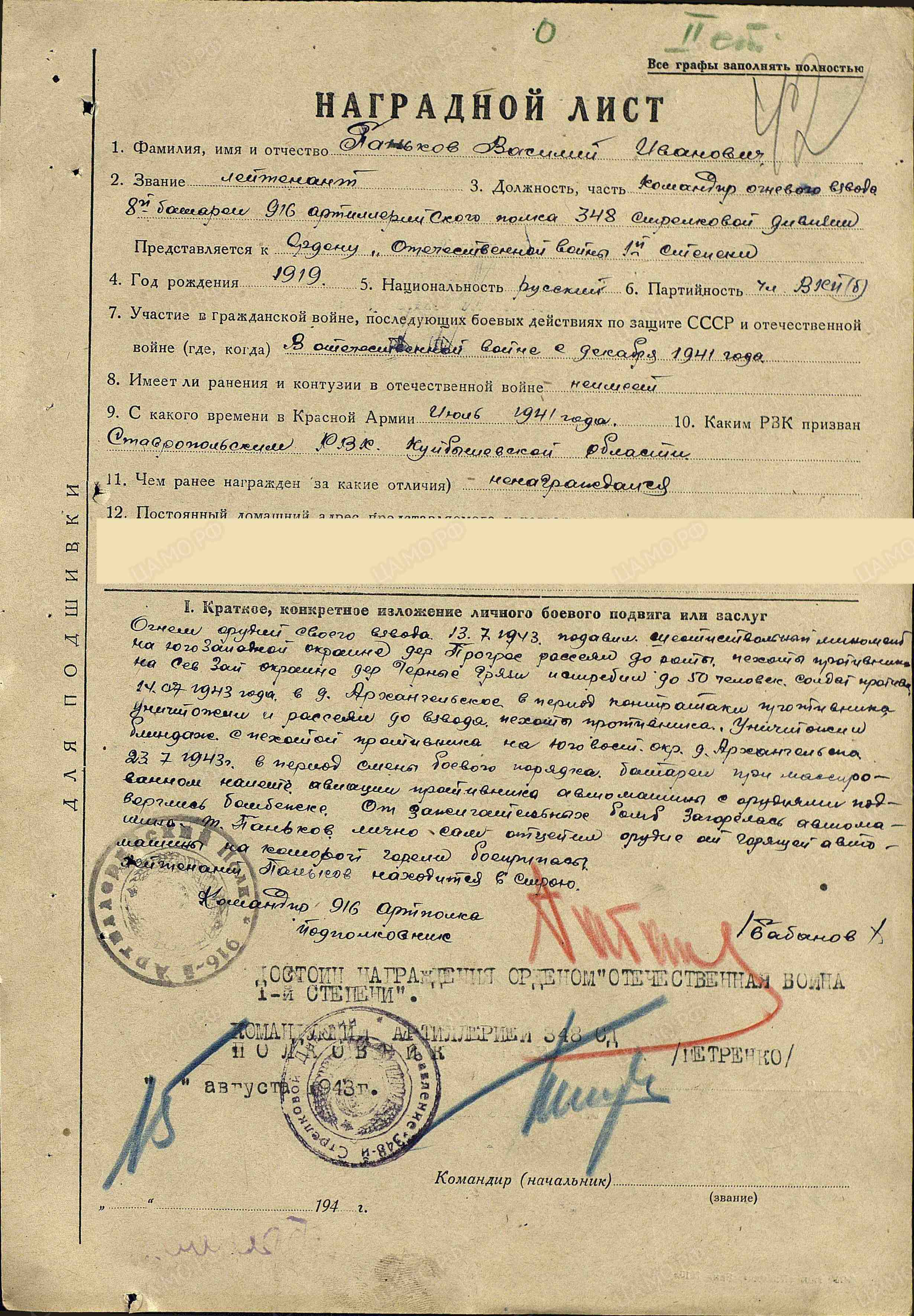 Огнем орудий своего взвода 13.07.1943 года подавил шестиствольным минометом на юго-западной окраине дер. Прогресс рассеял до роты пехоты противника. На северо-западной окраине дер. Черные Грачи истребил до 50 человек солдат противника. 14.07.1943 года в д. Архангельское в период контратаки противника уничтожил и рас-сеял до взвода пехоты противника. Уничтожил блиндаж с пехотой противника на юго-восточной окраине д. Архангельское. 23.07.1943 г. в период смены боевого порядка батареи при массированном налете авиации противника автомашины с орудиями подверглись бомбежке. От зажигательных бомб загорелась автомашина. Т. Паньков лично сам отцепил орудие от горящей автомашины, на которой горели боеприпасы. Лейтенант Паньков находится в строю. Достоин награждения орденом Отечественной войны I степени. (решением командования награжден орденом Отечественной войны II степени Наградной лист от 15 августа 1943 года) Находясь в боевых порядках пехоты в районе дер. Веричев 1.03.1944 года, своей батареей подбил 3 танка, из них, один подожжен, рассеял и уничтожил до двух взводов пехоты противника. 22.02.1944 года в районе западнее Вишен подавил огонь 105мм батареи противника, а прислугу этой батареи рассеял и уничтожил. В результате чего батарея противника была захвачена нашими частями (р-н дер. Вишин). Лейтенант Паньков находится в строю. Достоин награждения правительственной наградой орденом Отечественной войны I степени (решением командования награжден орденом Красной Звезды. Наградной лист от 5 марта 1944 года)