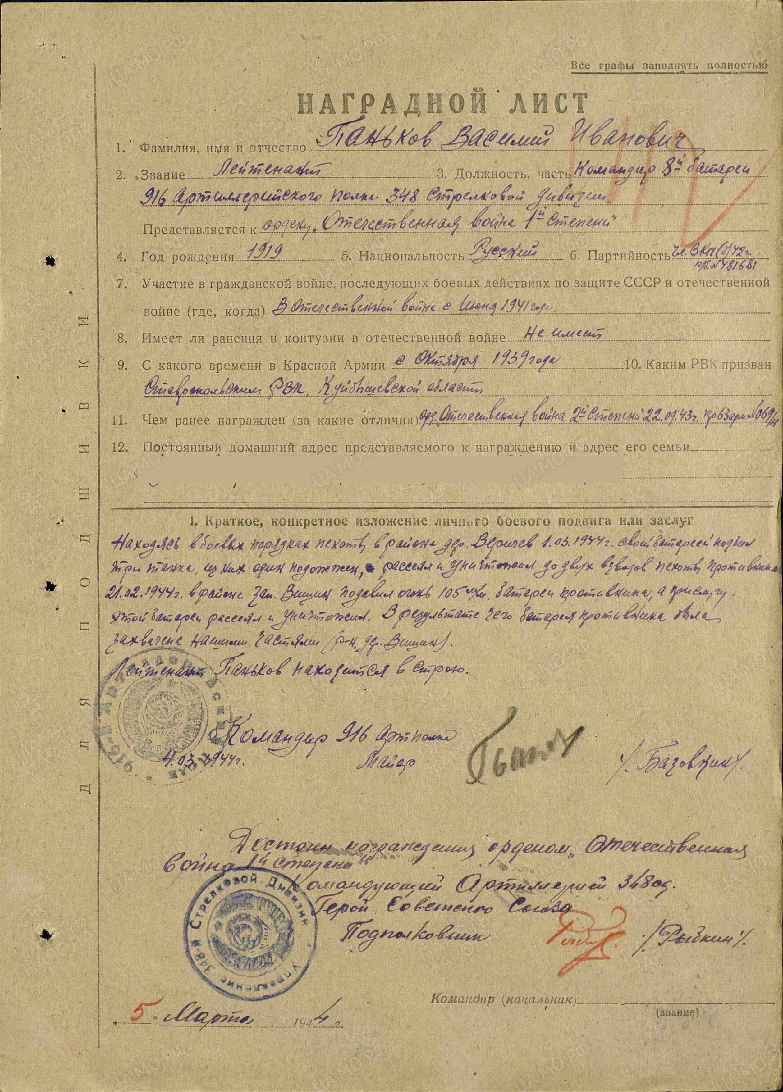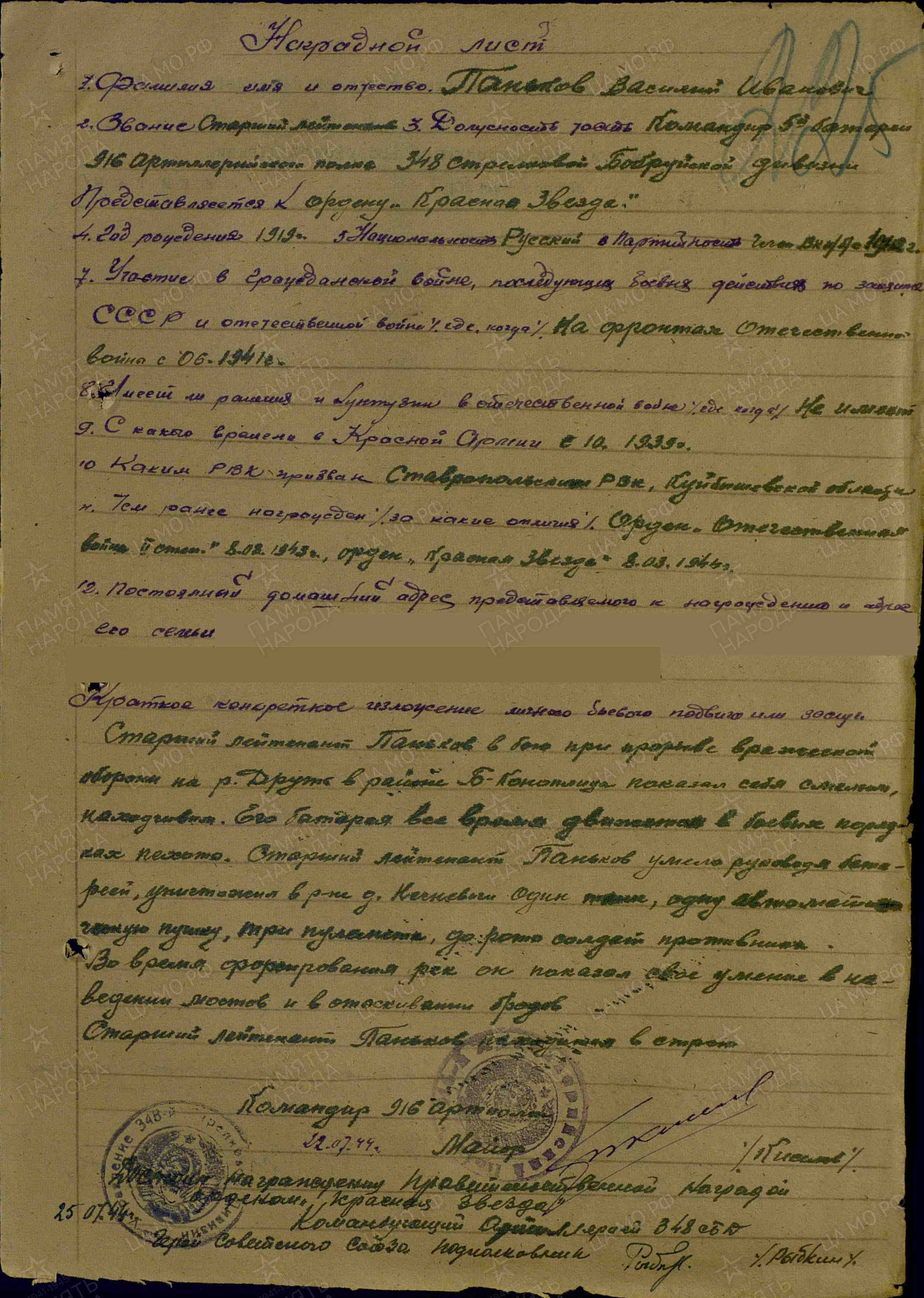 Старший лейтенант Паньков в бою при прорыве вражеской обороны на р. Друть в районе д. Б-Коноплица показал себя смелым, находчивым. Его батарея все время движется в боевых позициях пехоты. Старший лейтенант Паньков умело руководя бата-реей, уничтожил в районе д. Негневичи один танк, одну автоматическую пушку, три пулемета, до роты солдат противника. Во время форсирования реки он показал свое умение в наведении мостов и в отыскивании бродов. Старший лейтенант Паньков находится в строю. Достоин награждения правительственной наградой орденом Красной Звезды. (Наградной лист от 25 июля 1944 года)
