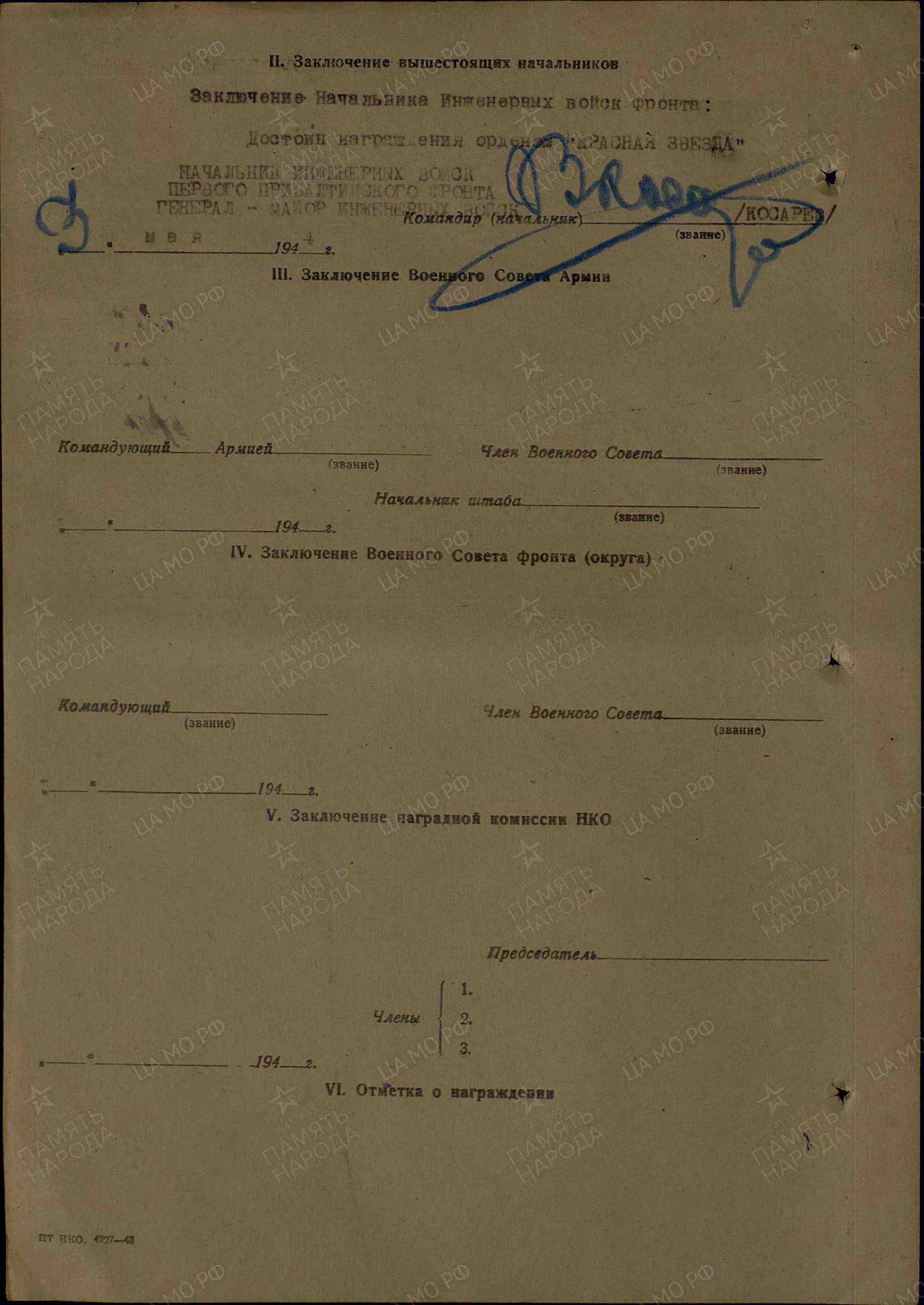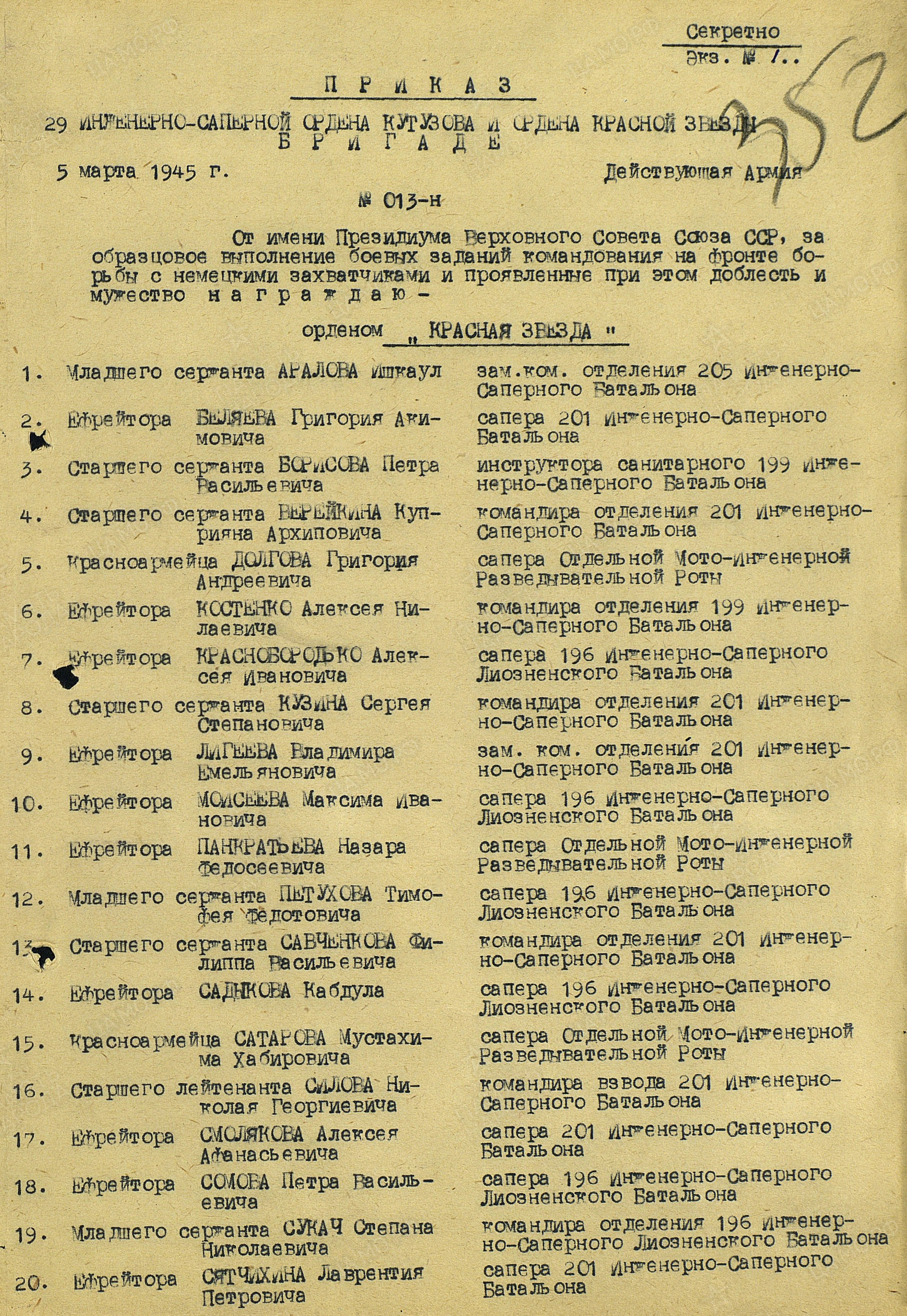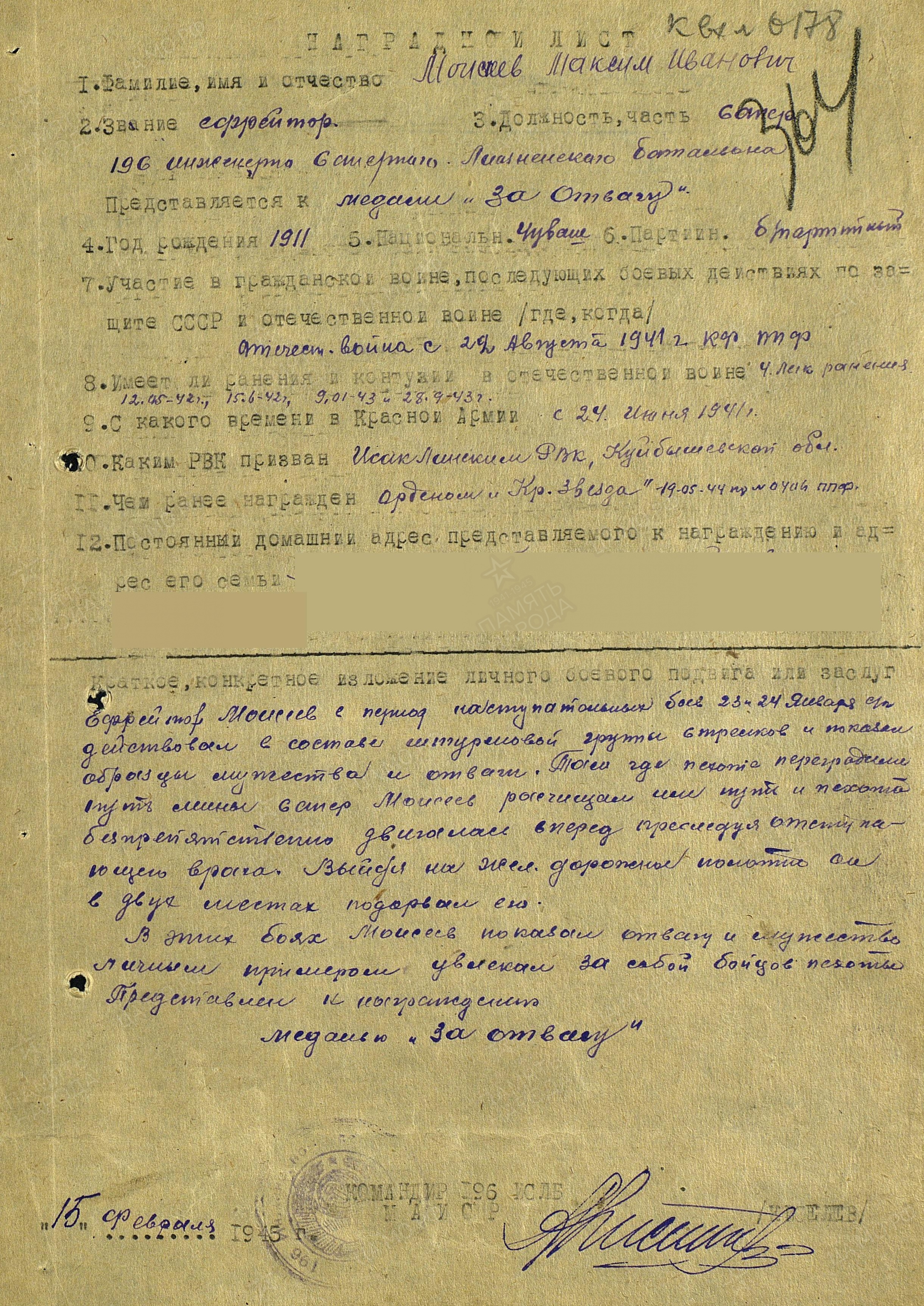 "В Отечественной войне с июля 1941 г. (месяц – так в документе) – Калининский фронт. В Красной Армии с 1941 года. Призван Исаклинским РВК Куйбышевской области. Ранения и контузии: 4 легких ранения. Домашний адрес: Куйбышевская обл., Исаклинский р-н, Б.-Микушкинский с-совет, д.Б.-Микушкино. Ефрейтор Моисеев с первых дней войны находится в действующей армии. Во время выполнения боевой задачи по проделыванию проходов в минных полях противника под г. Холм был ранен, но до конца остался на своем посту. Находясь на службе в батальоне, показал себя одним из самых смелых и мужественных саперов. При наведении переправы через р. Царевич и минировании переднего края был дважды ранен. За самоотверженную работу и отвагу, проявленную при защите Родины, ефрейтор Моисеев достоин правительственной награды медали "За отвагу" (решением командования за этот подвиг был награжден орденом Красной Звезды).