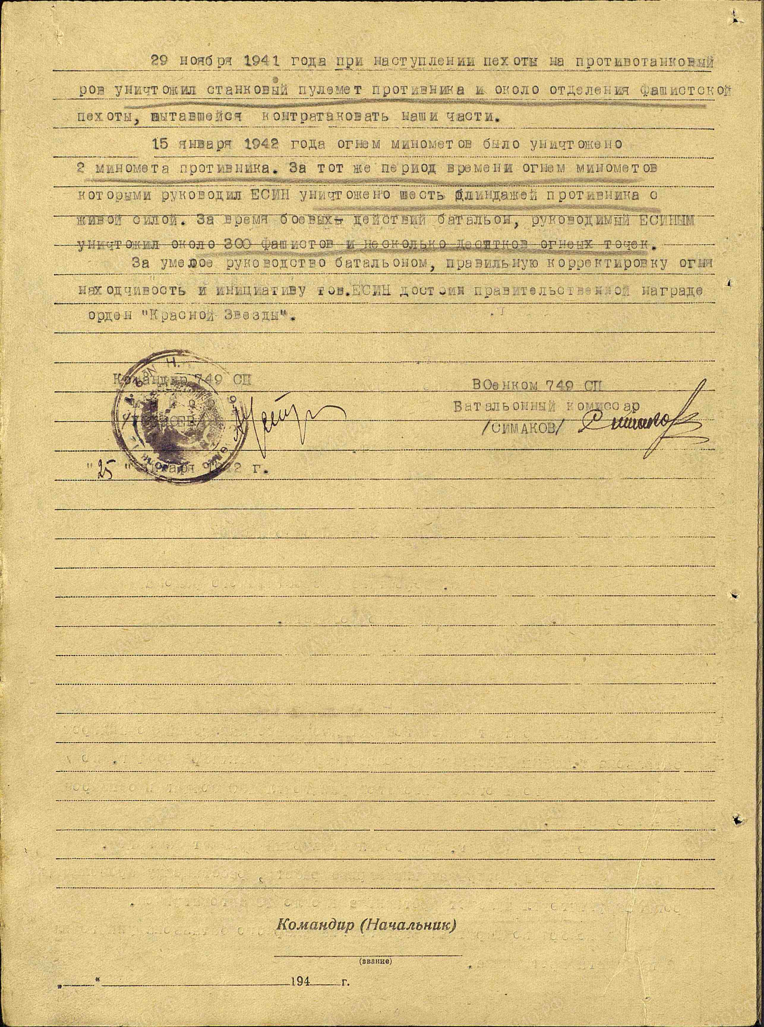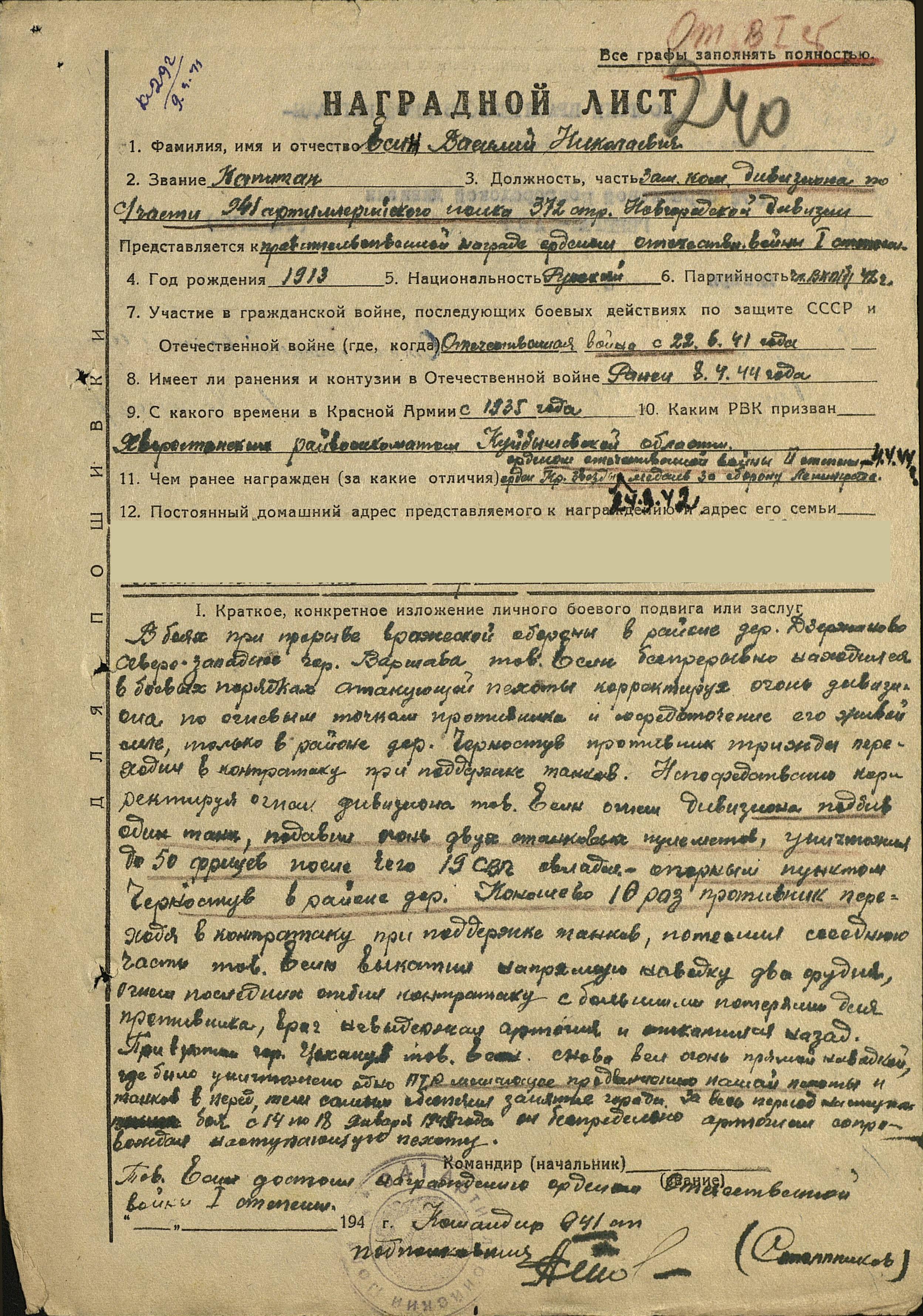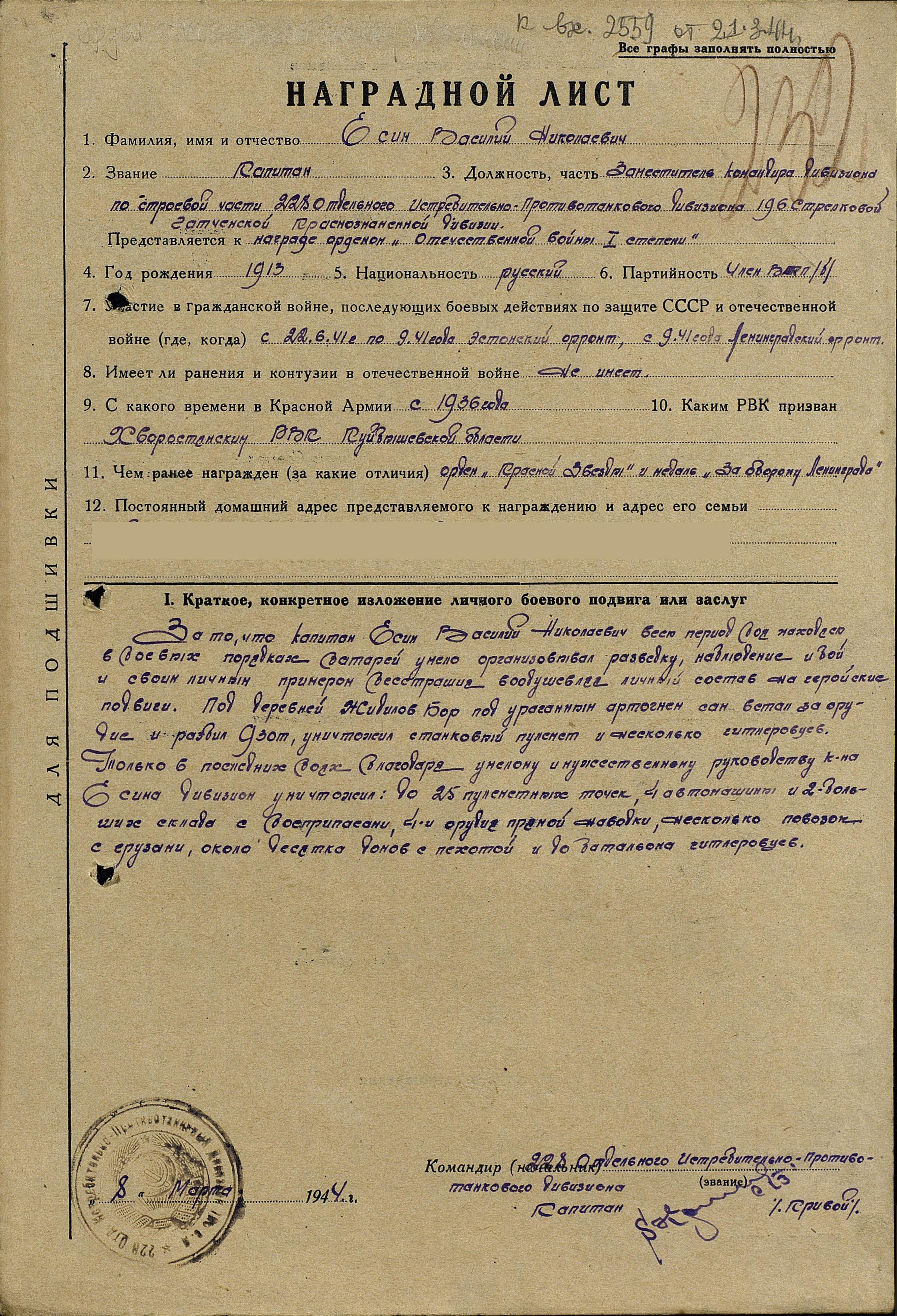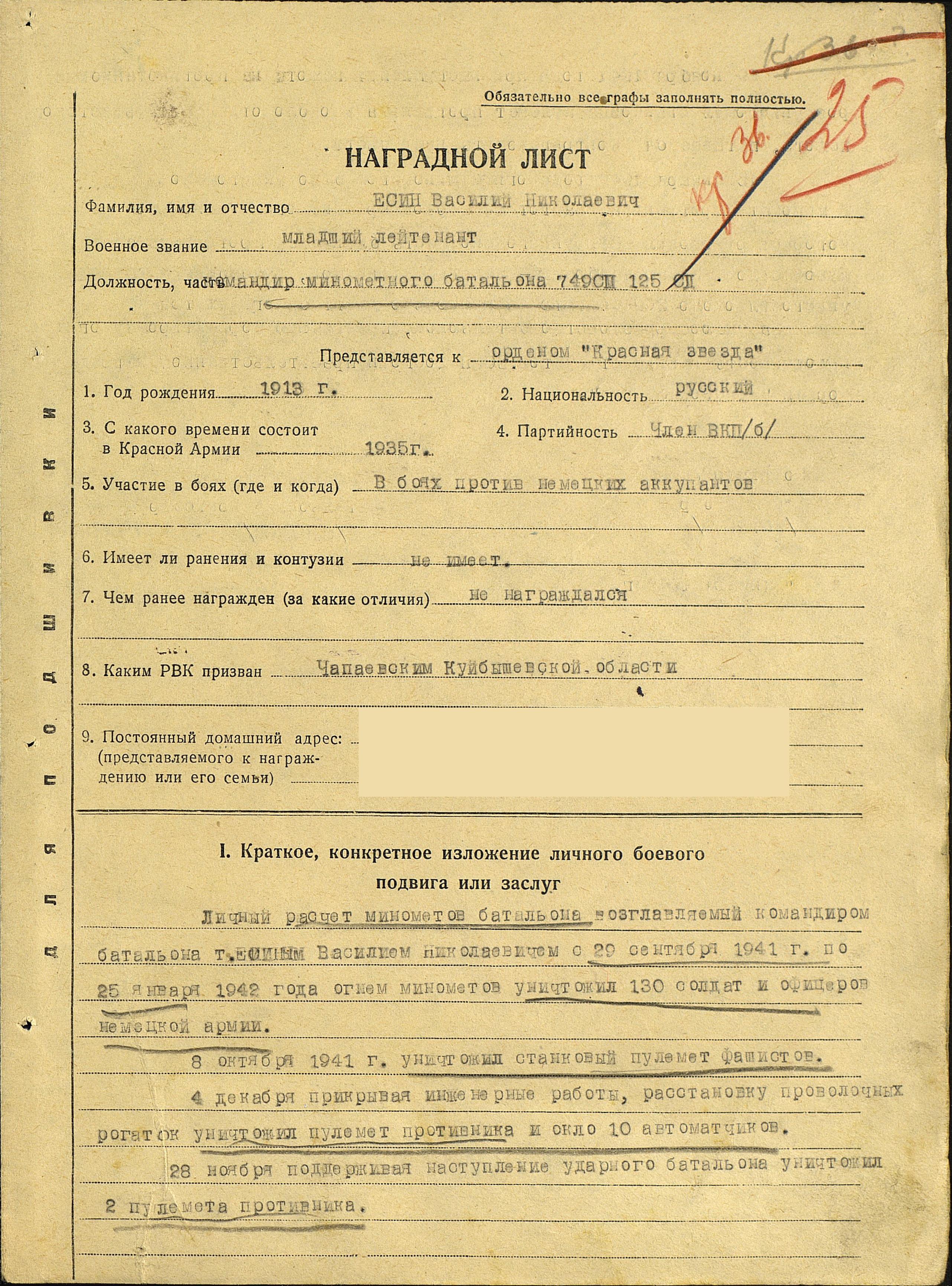 Отрывок из книги местного краеведа Мельникова И.М., который описывает некоторые события жизни героя: «Обычно пехота наступала в сопровождении артиллерии. Стрелко¬вое подразделение лейтенанта Пчелкина вело наступление. Немцы упорно оборонялись, отстреливаясь из траншей и блиндажа. Авто¬матный и пулеметный огонь был плотным, иногда дело доходило до гранат. Фашистов надо было вытеснить на чистое поле, заранее при-стрелянное артиллеристами батареи В.Н. Есина (с. Хворостянка). Бой с каждым часом нарастал. Стрелки трассирующими пулями и ракетами показывали цель артиллеристам, по которым били орудия Есина. Воздух содрогался от несмолкаемого гула. Черная земля вы¬сокими столбами взлетала вверх. Фашисты не выдержали, теперь только открытое поле, и вот здесь-то они и были расстреляны точным и сокрушительным огнем артиллеристов, руководимых В.Н. Есиным. Теперь в этих наступательных боях Василий Никола¬евич часто вспоминал первые дни войны. Тогда немцы шли напро¬лом, бросали в наступление целые роты автоматчиков. И всякий раз артиллеристы мужественно принимали бой, дрались отчаянно, не¬редко дело доходило до рукопашной, когда приходилось пускать в ход и стрелковое оружие. Было это в 24-ю годовщину Красной Ар-мии, когда старший лейтенант В.Н. Есин с винтовкой вышел на огневой рубеж: в этот день на нашей советской земле стало меньше двумя немецкими бандитами. Бывали моменты, когда на батарею пикировали немецкие самоле¬ты, но батарея жила, и по-прежнему артиллеристы точно засекали вражеские огневые точки и метко били по ним. С первых же выстре¬лов обычно замолкали немецкие пулеметы, рушились дома, и фаши¬сты находили себе могилу под обломками железных балок. Теперь же на истребительном счету батареи В.Н. Есина числятся десятки разбитых вражеских пулеметов, блиндажей, машин и сотни вражеских солдат. Поздравляя своего командира с получением орде¬на Красной Звезды, бойцы заявили: этот счет будет увеличен вдвое».