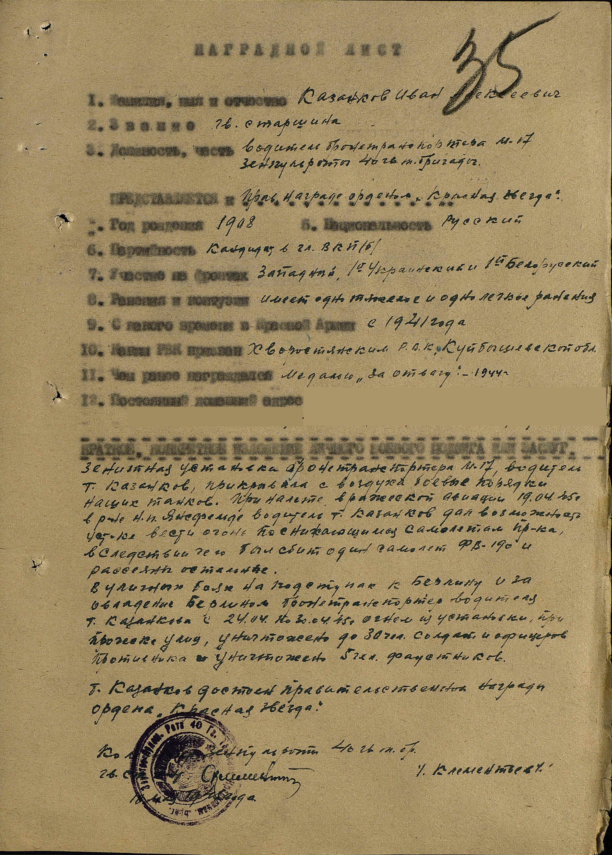 С 5 октября 1941 года на фронте, вначале командир отделения в 413 полку, а через десять дней на Брянском направлении был контужен, долго не отлеживался в медсанбате и снова передовая. 1 марта 1942 года под Орлом легко ранен в голову, в 1944 году бои переместились на польскую территорию, воевать стало веселее: почти вся страна очищена от врага. 13 августа 1944 года в районе населенного пункта Манув вражеская авиация днем и ночью бомбила переправу через реку Висла. Водитель машины гвардии старшина И.А. Казанков, несмотря на сильную бомбежку, не покидал своей машины. И когда осветительная бомба упала на его машину, он, рискуя жизнью, потушил ее. Сохранены матчасть и машина, а это значит — 30-тонная переправа через реку Вислу в ночное время работала бесперебойно, охрана с воздуха была надежной. Приказом командира 40 гв. т. бриг. Иван Алексеевич был награжден медалью «За отвагу», а 23 августа в районе н. п. Дармин вторично ранен в руку и ногу. Искусные врачи снова залатали, и этого хватило до самого Берлина».