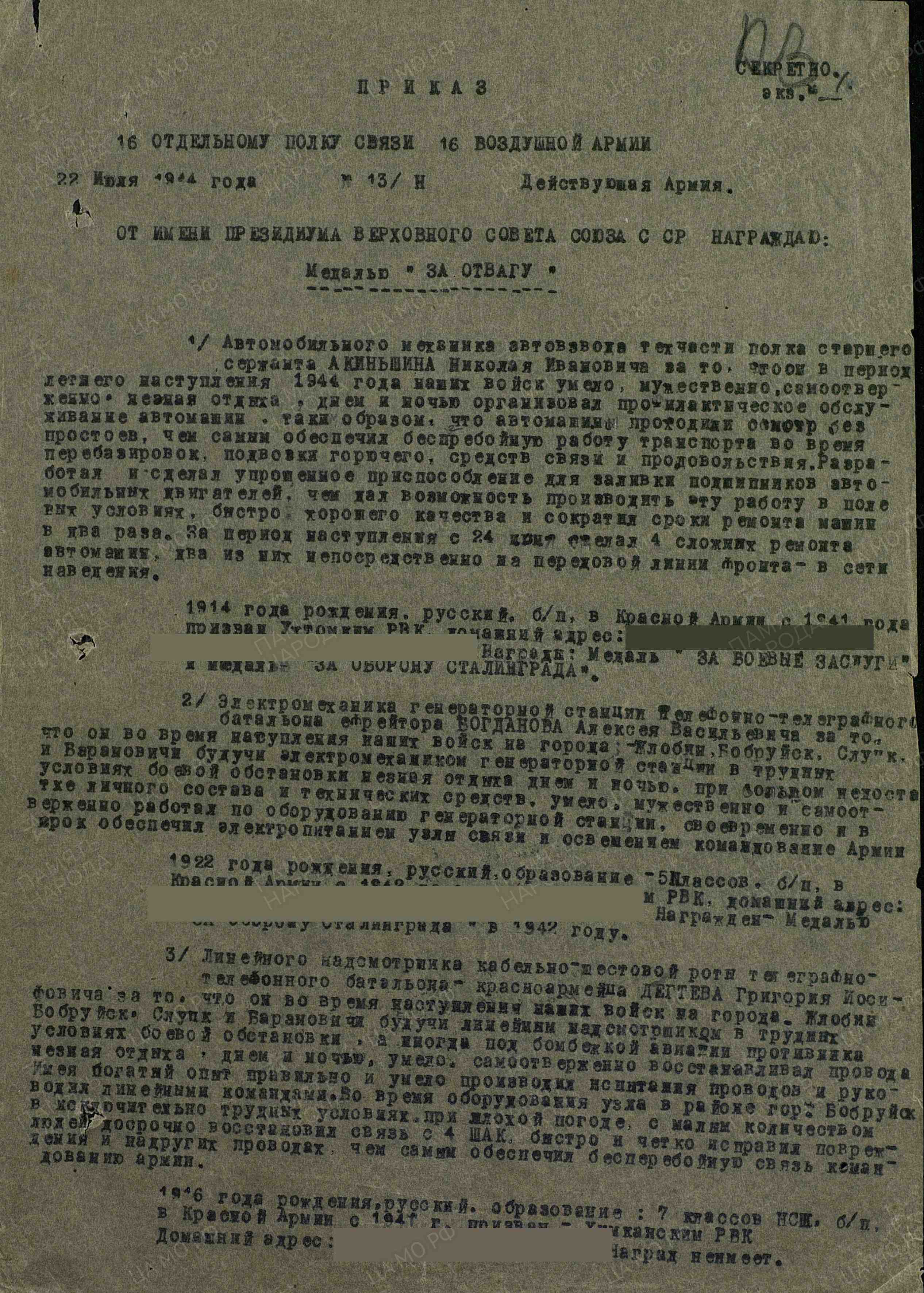 Награды: медали "За отвагу", "За оборону Сталинграда", "За взятие Берлина", "За победу над Германией в Великой Отечественной войне 1941-1945 гг.".