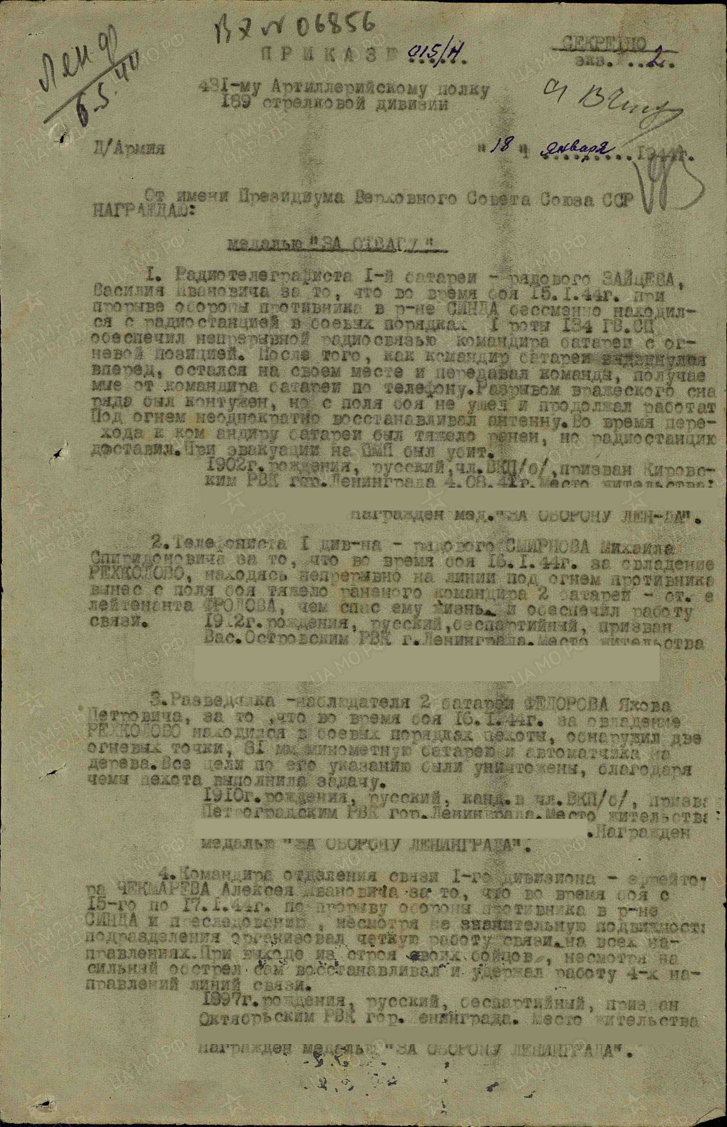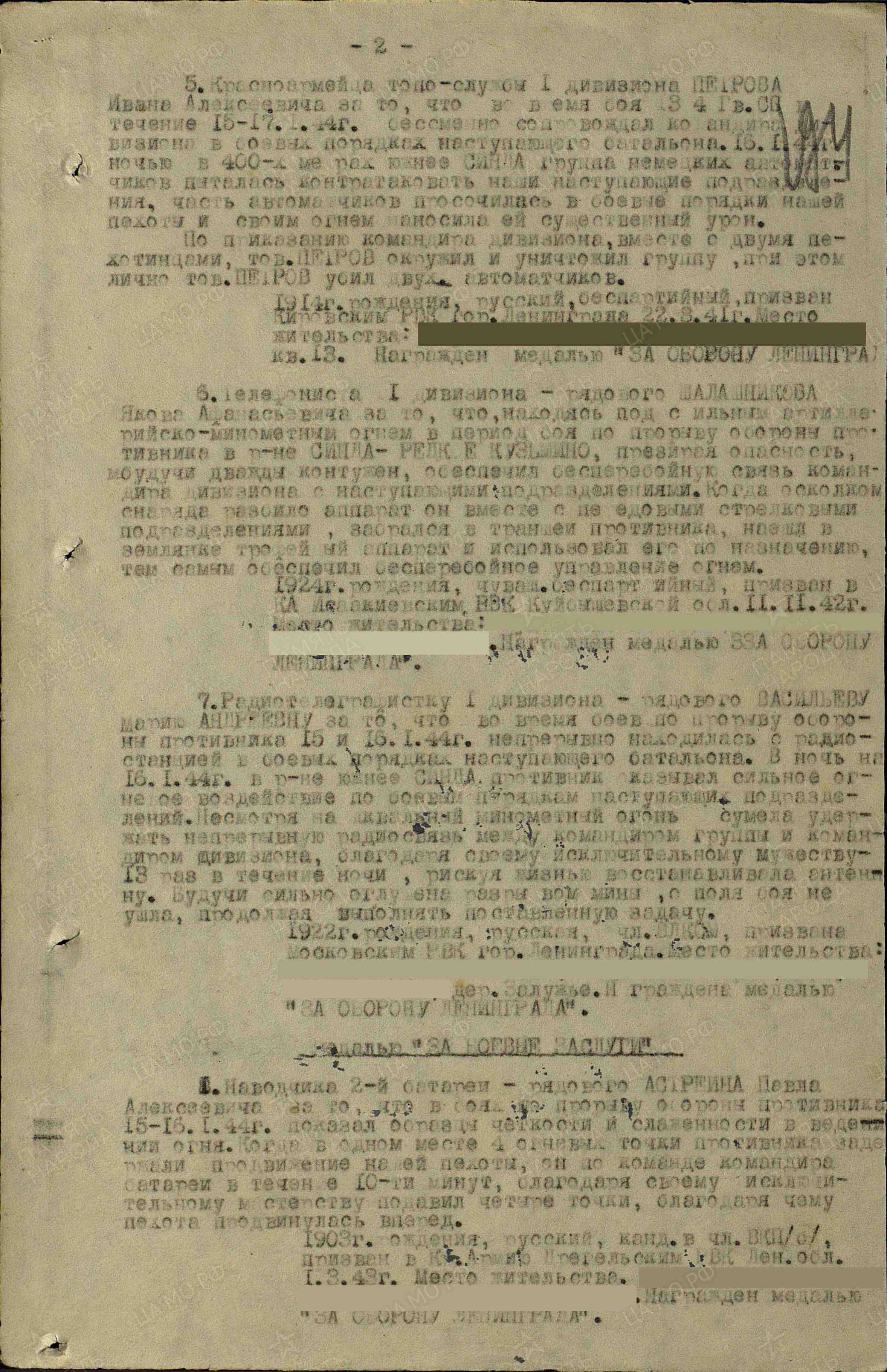 Награды: орден Красной Звезды (19.05.1945), медаль «За отвагу» (18.01.1944), медаль «За взятие Берлина» (09.06.1945), медаль «За освобождение Праги» (09.06.1945), медаль «За оборону Ленинграда», орден Отечественной войны II степени (1985 г.).